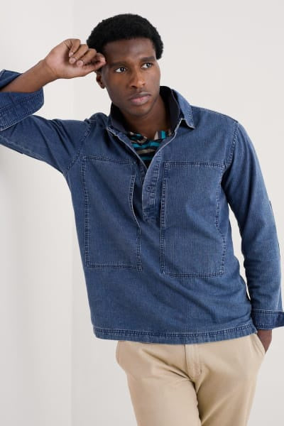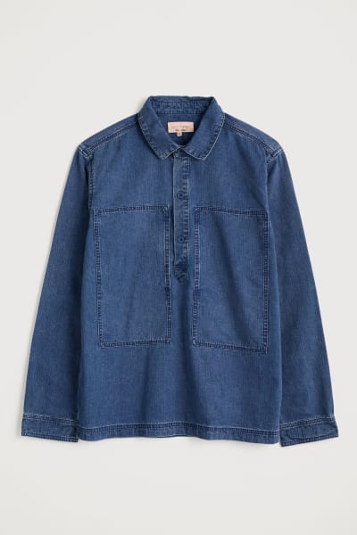 A practical button-up overshirt, inspired by the hardy workwear of Cornish shipwrights and artists. Made from supple organic cotton denim with big patch pockets on the chest, reinforced patched elbows and deep bartack-enforced splits at the hem for easy movement. Twin-stitch detailing and a subtle textured stripe give it an effortless edge.