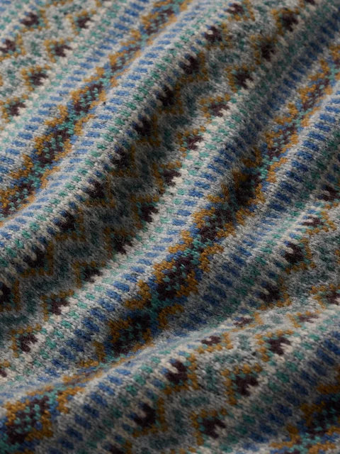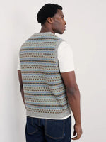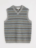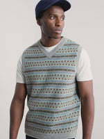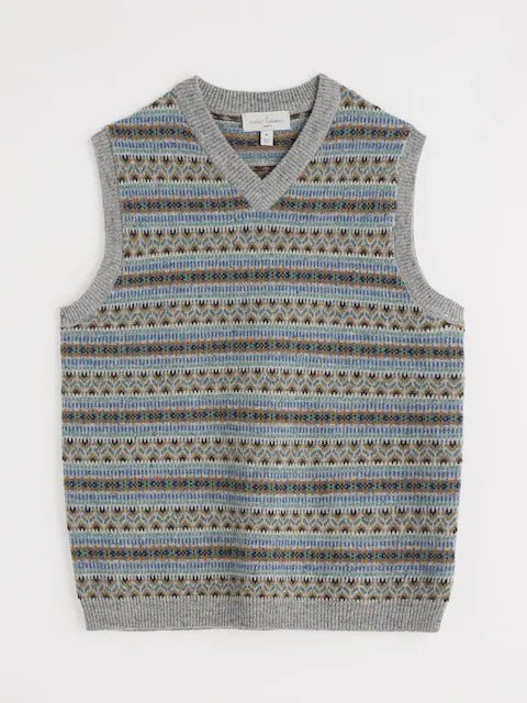 transitional knit to layer through changing seasons. The v-neck Walt Vest has been crafted with a durable, wool-rich yarn made from responsibly sourced and recycled fibres. It has an easy fit and all-over Fair Isle stitch in a selection of colours picked from the Cornish landscape. Finished with neat ribbed hems, we love it layered over a tee or shirt.