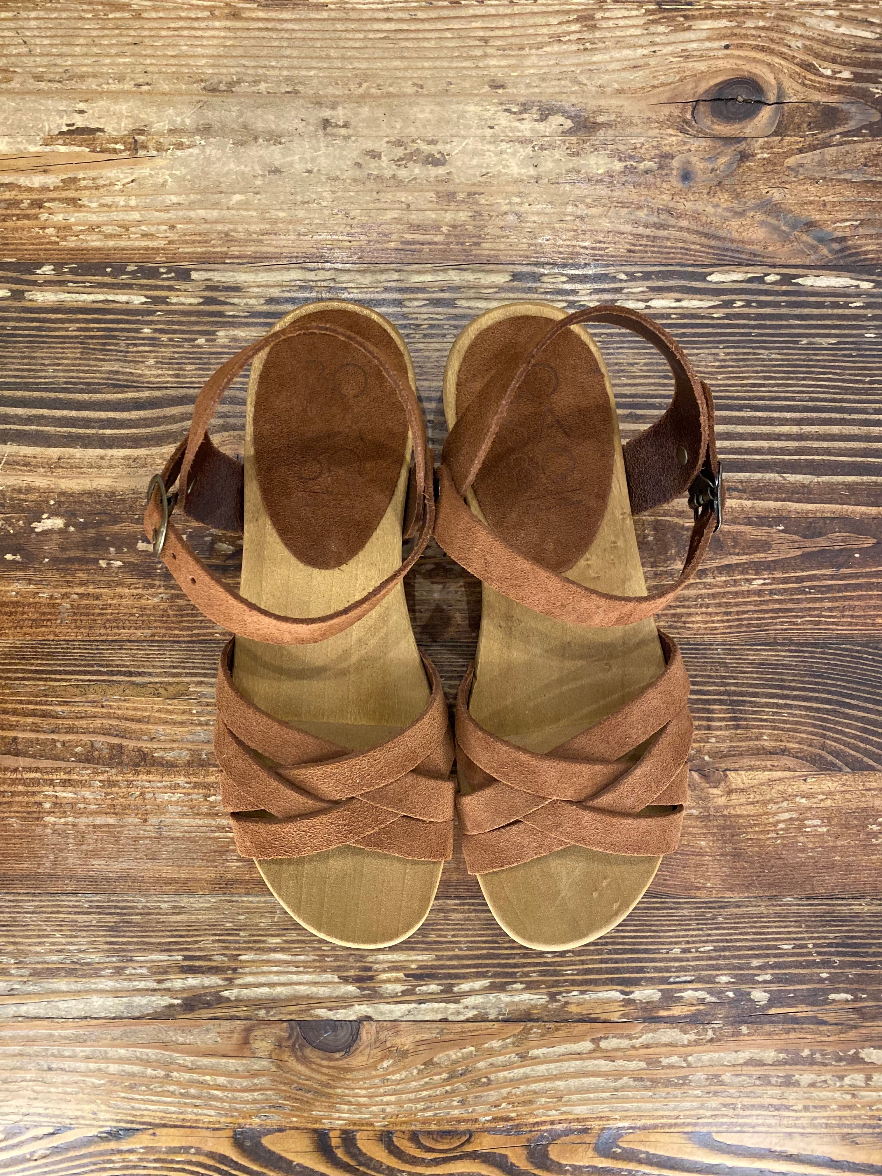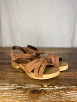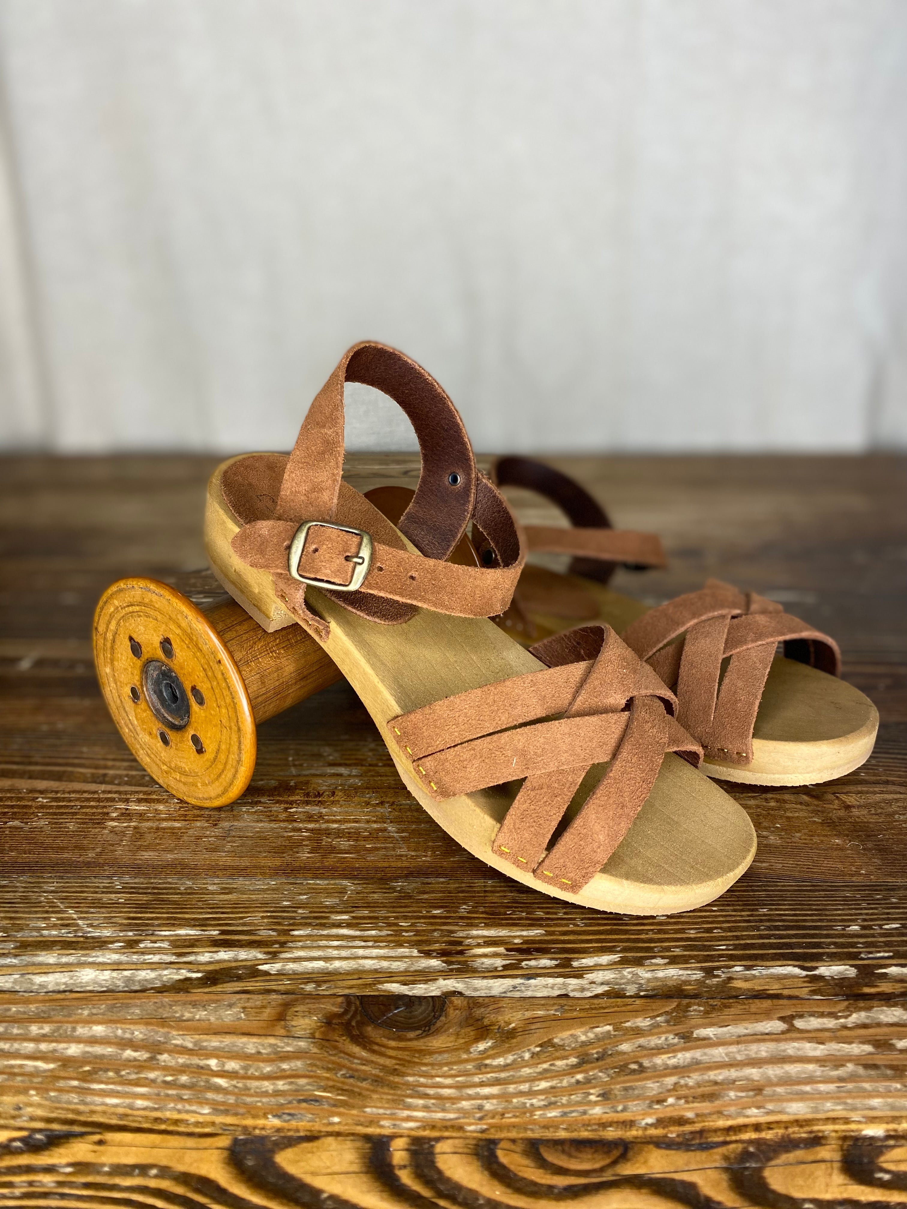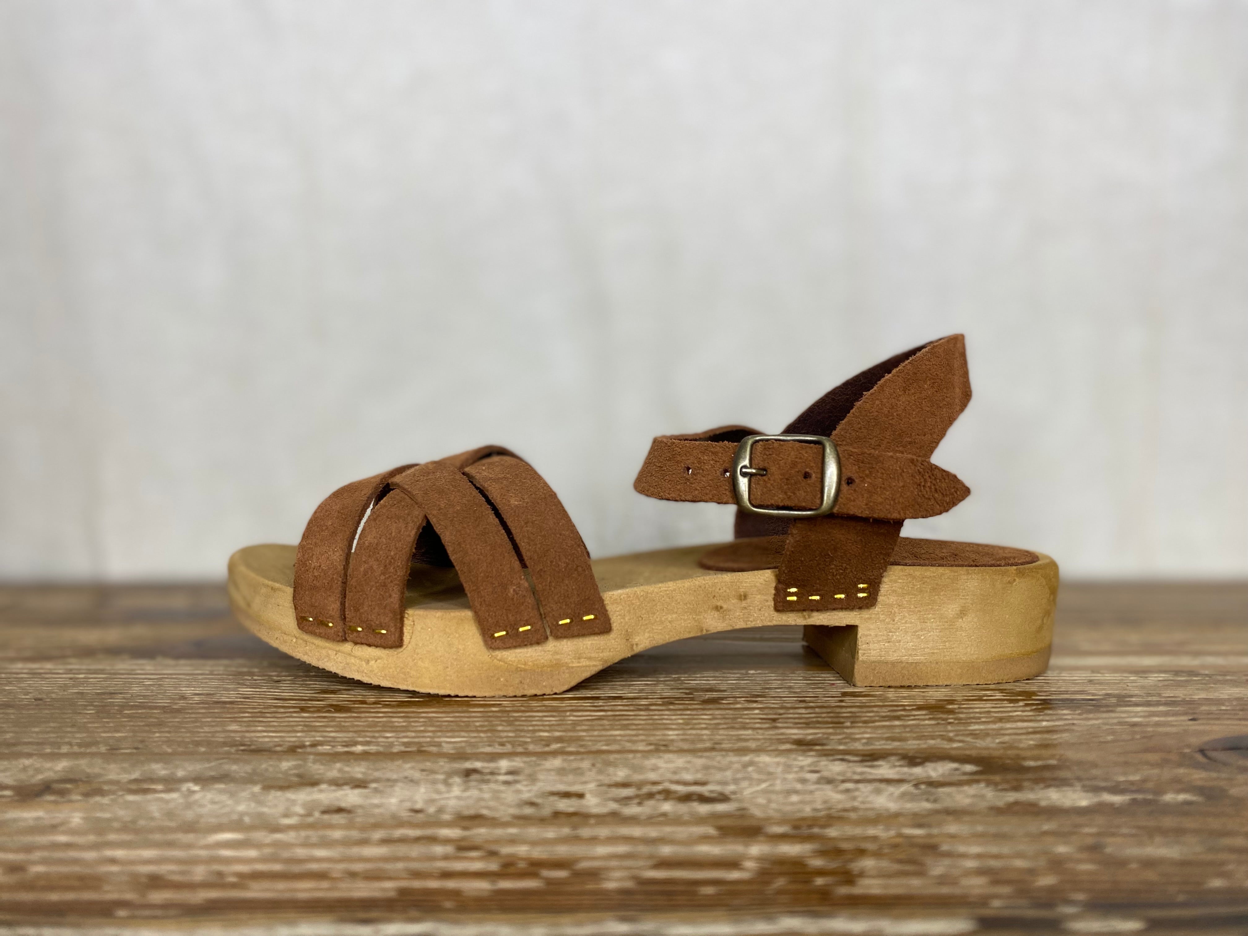 Featuring a low heel, multi strapped front, open toe and ankle strap. The main shoe is made from vegetable tanned suede and these comfortable clogs have been made to order, just for From Dust.