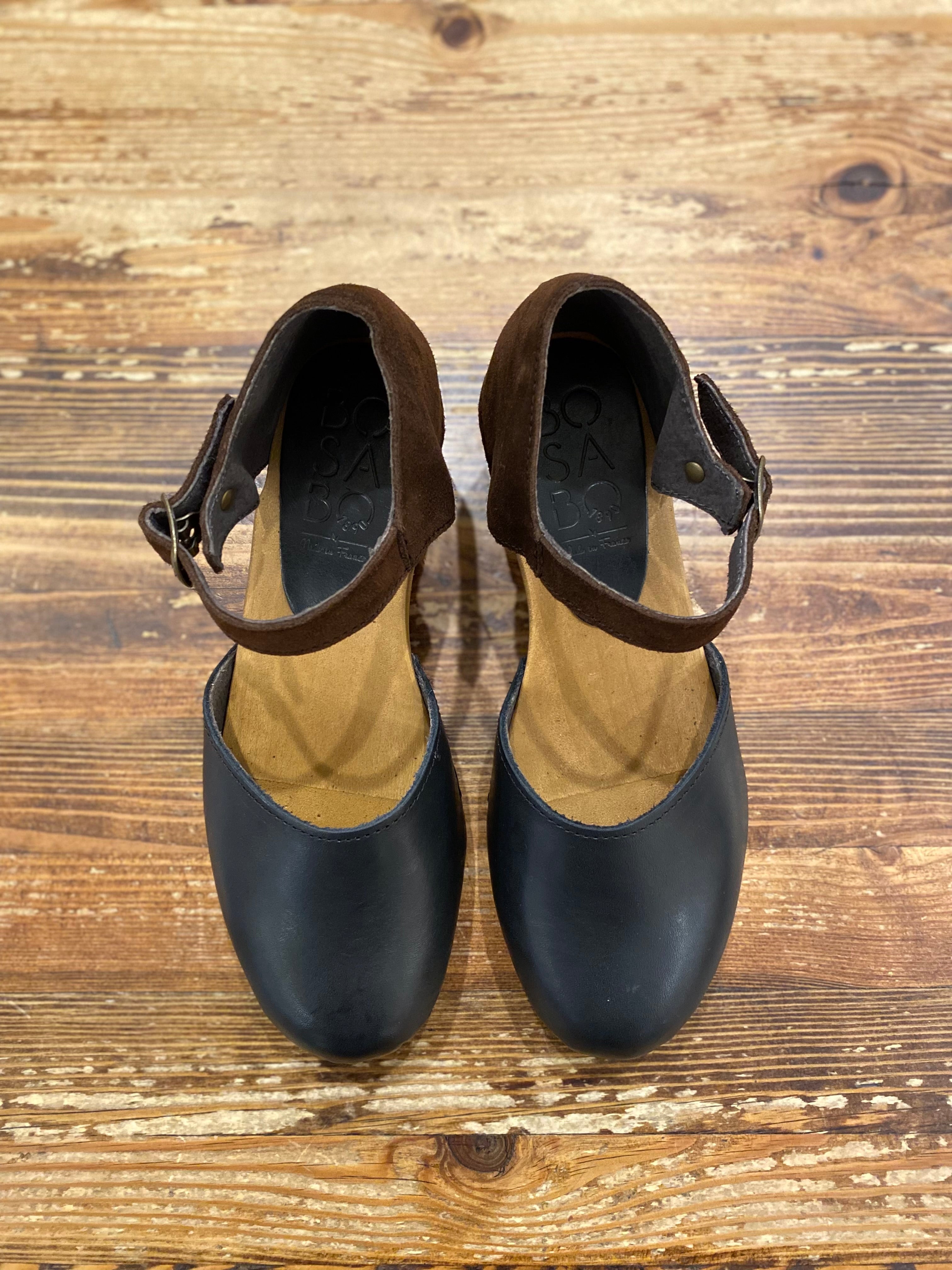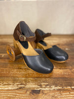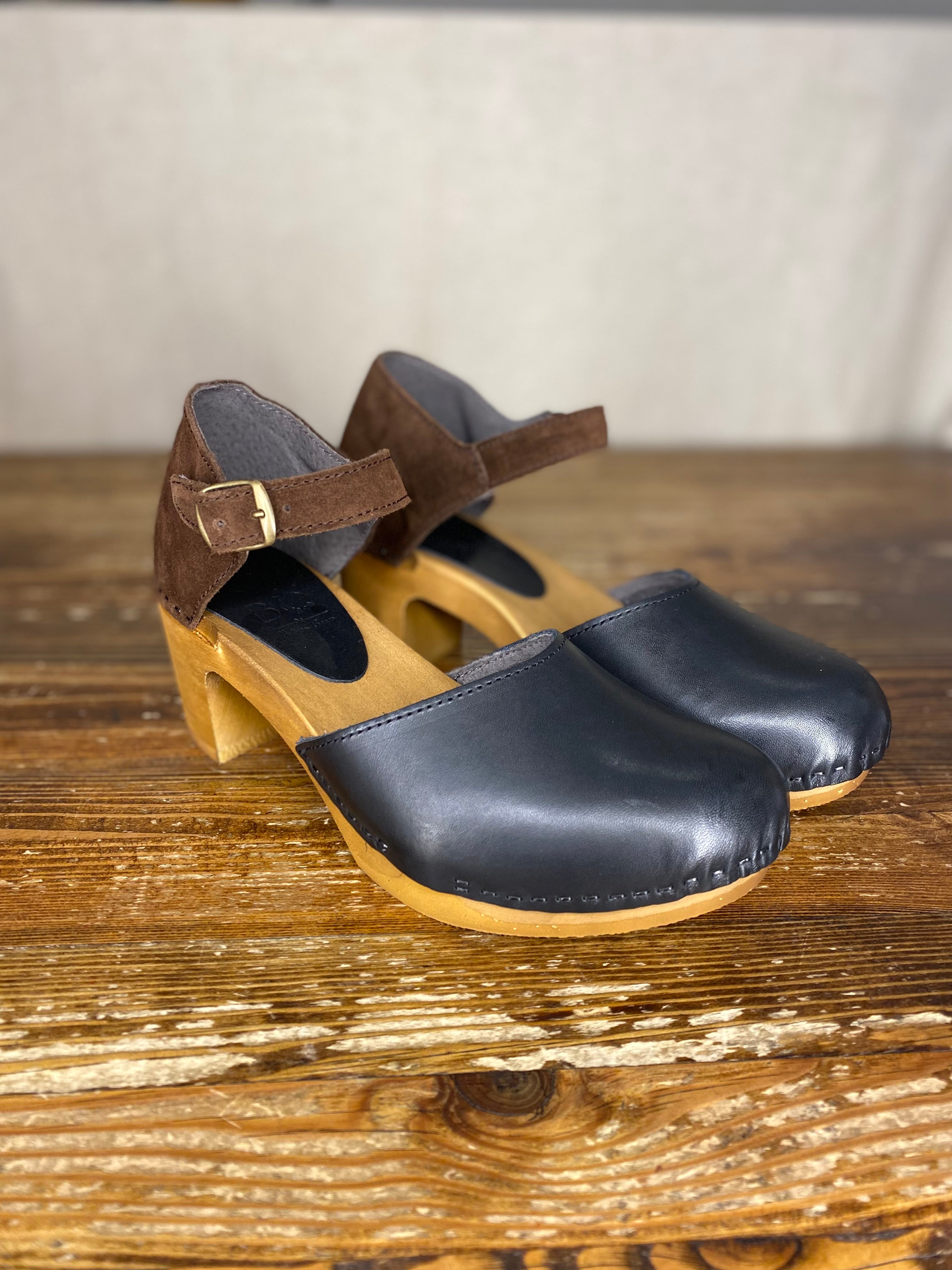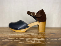 Featuring a mid height heel, closed toe, heel front ankle buckle. Made in a vachette leather toe and contrasting suede heel, these comfortable clogs have been made to order, just for From Dust.