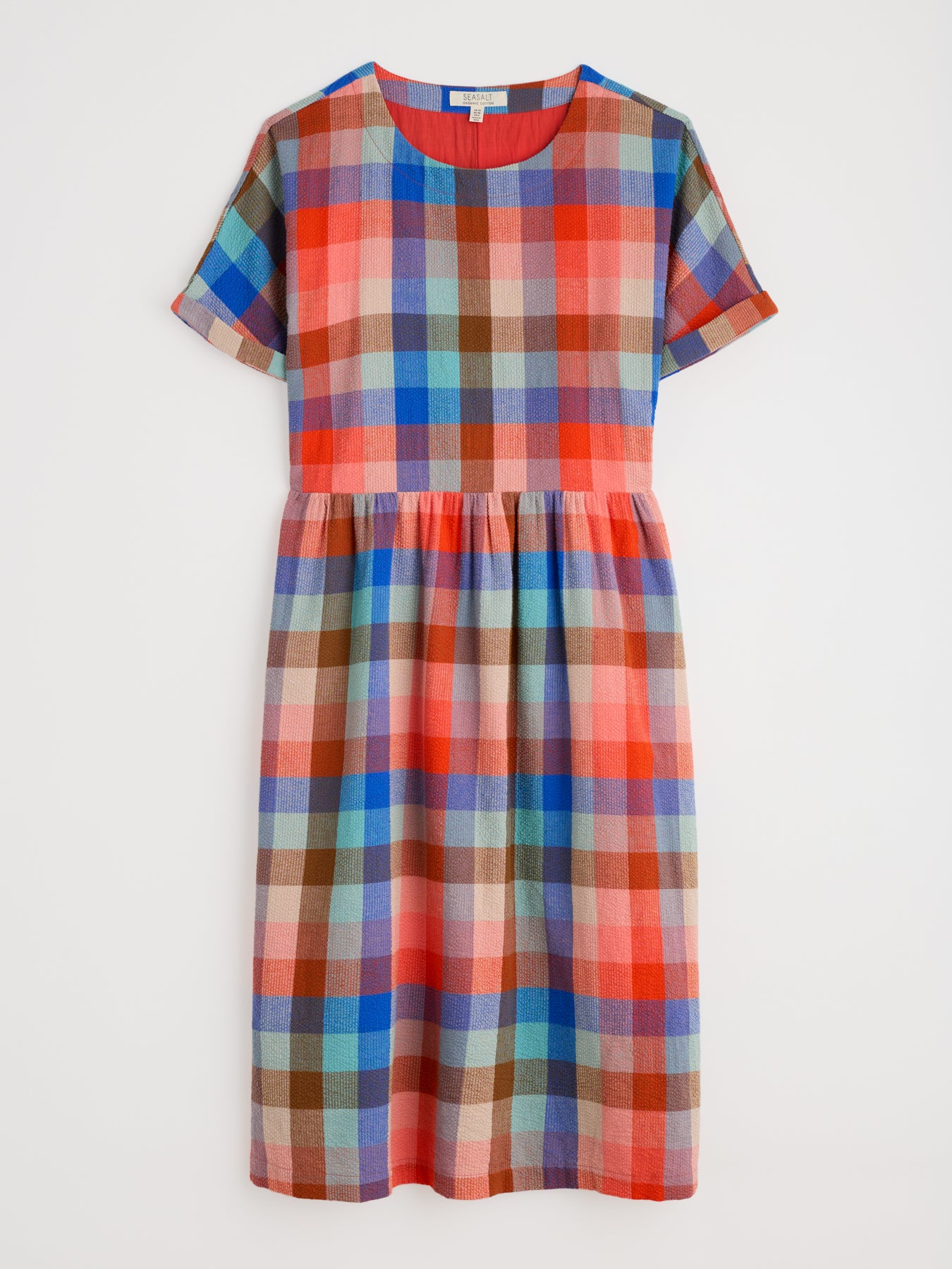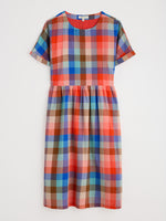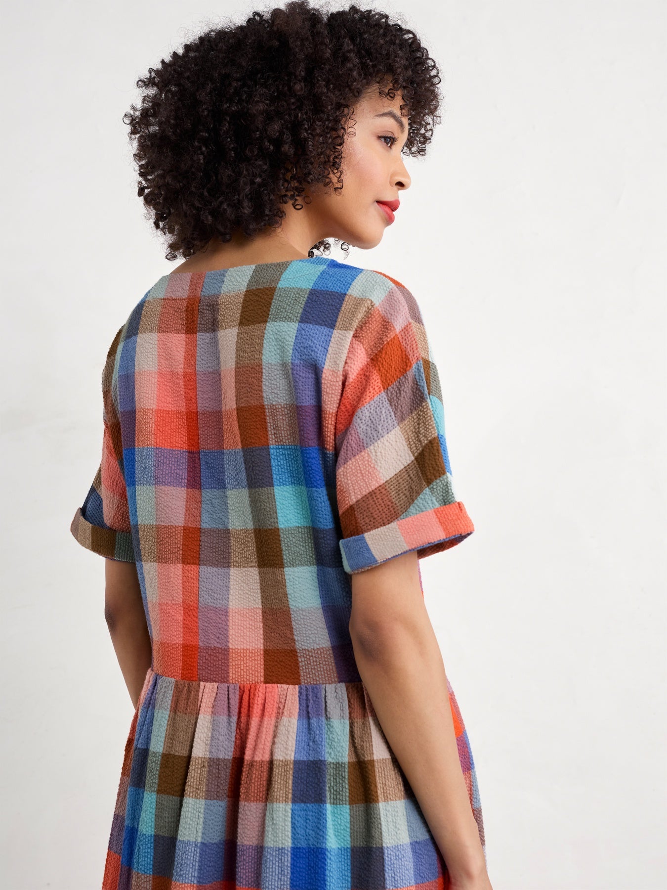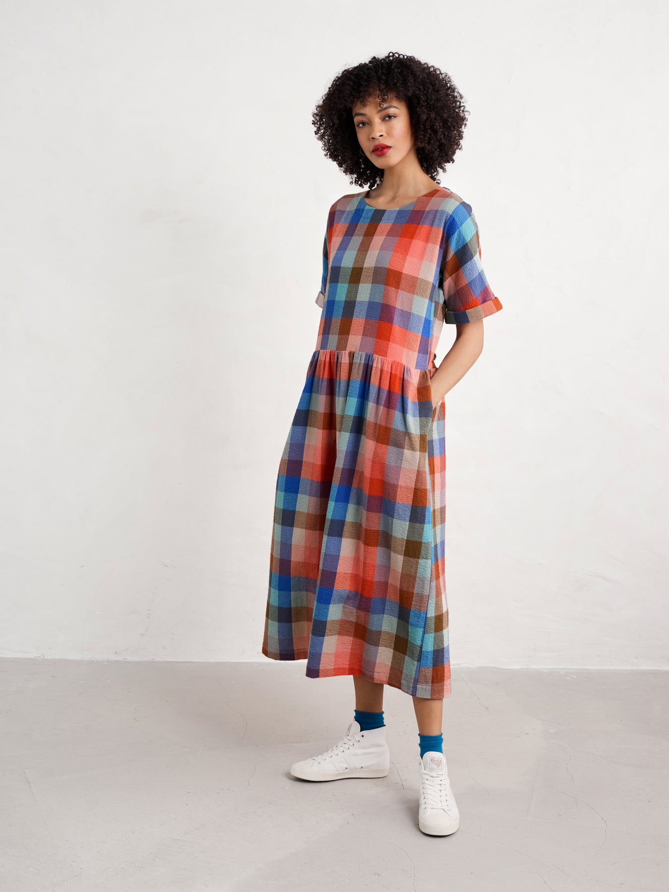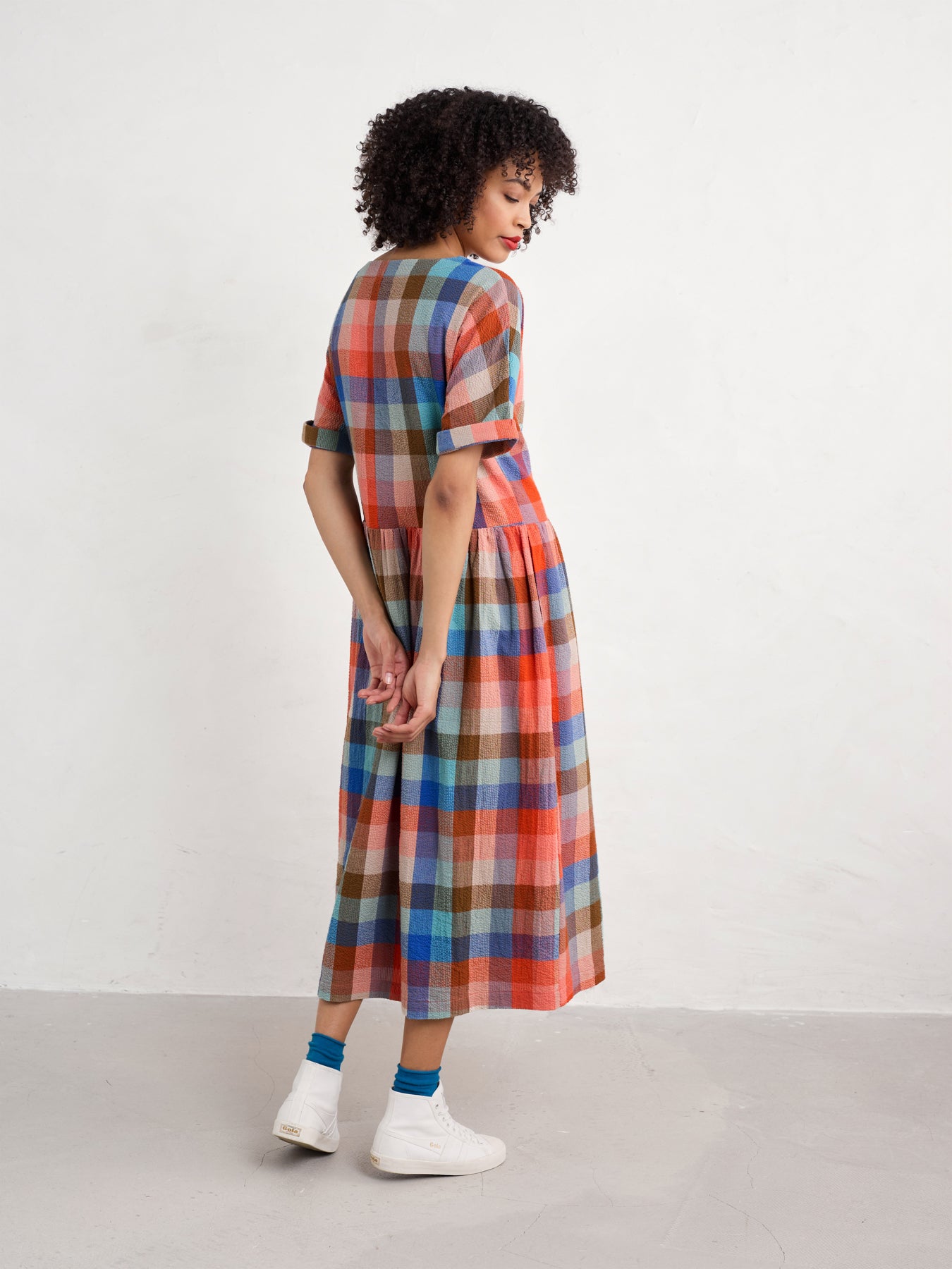 A loose-fit dress with a dropped waistline, in soft organic cotton. It's been given side seam pockets and gathers to the skirt that lend the style a beautiful swish. It's perfect paired with crisp white trainers or heeled leather boots.