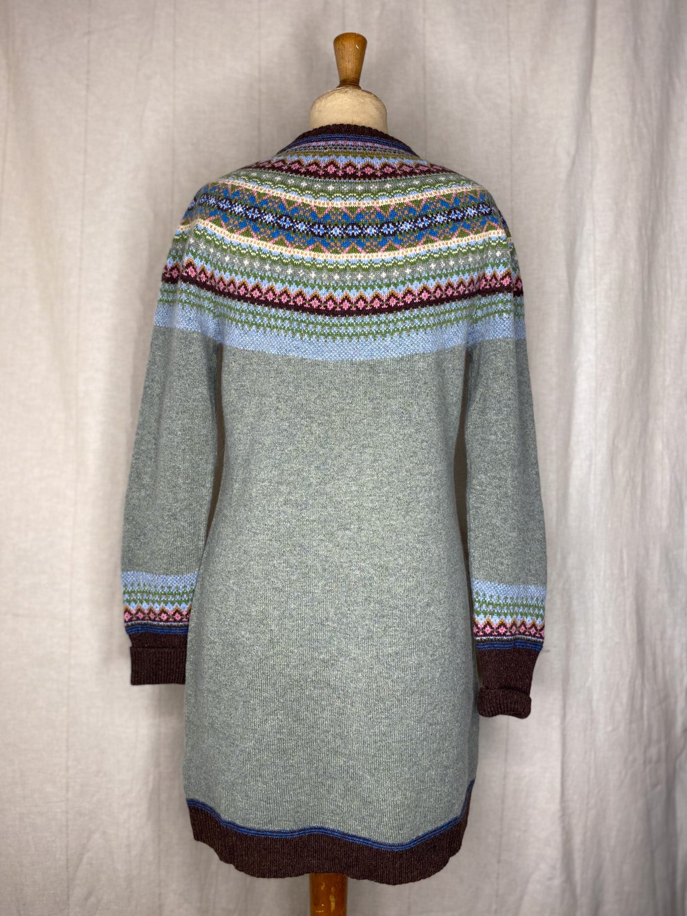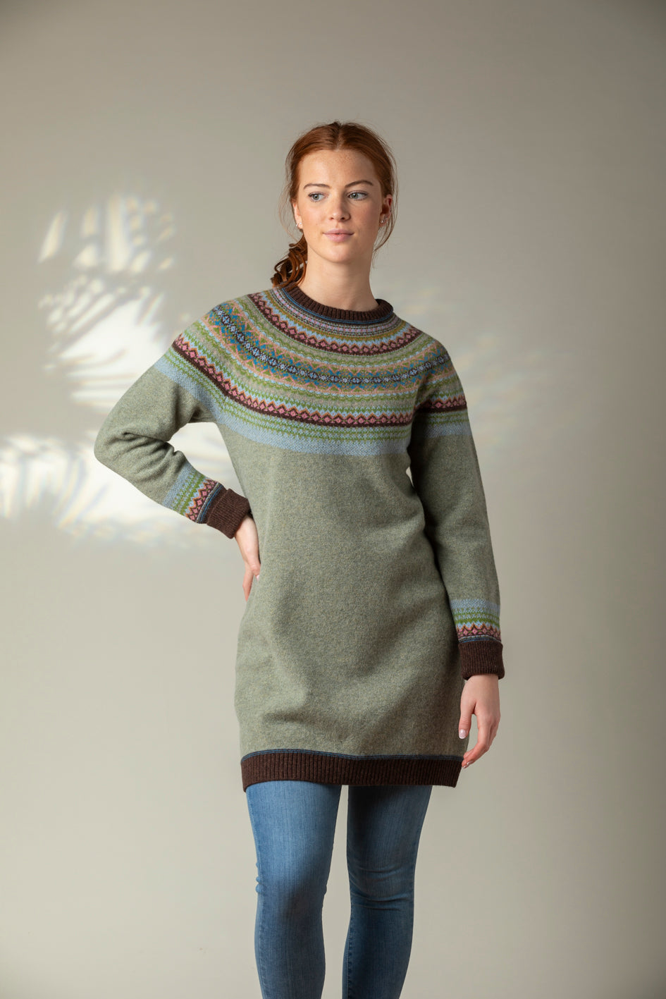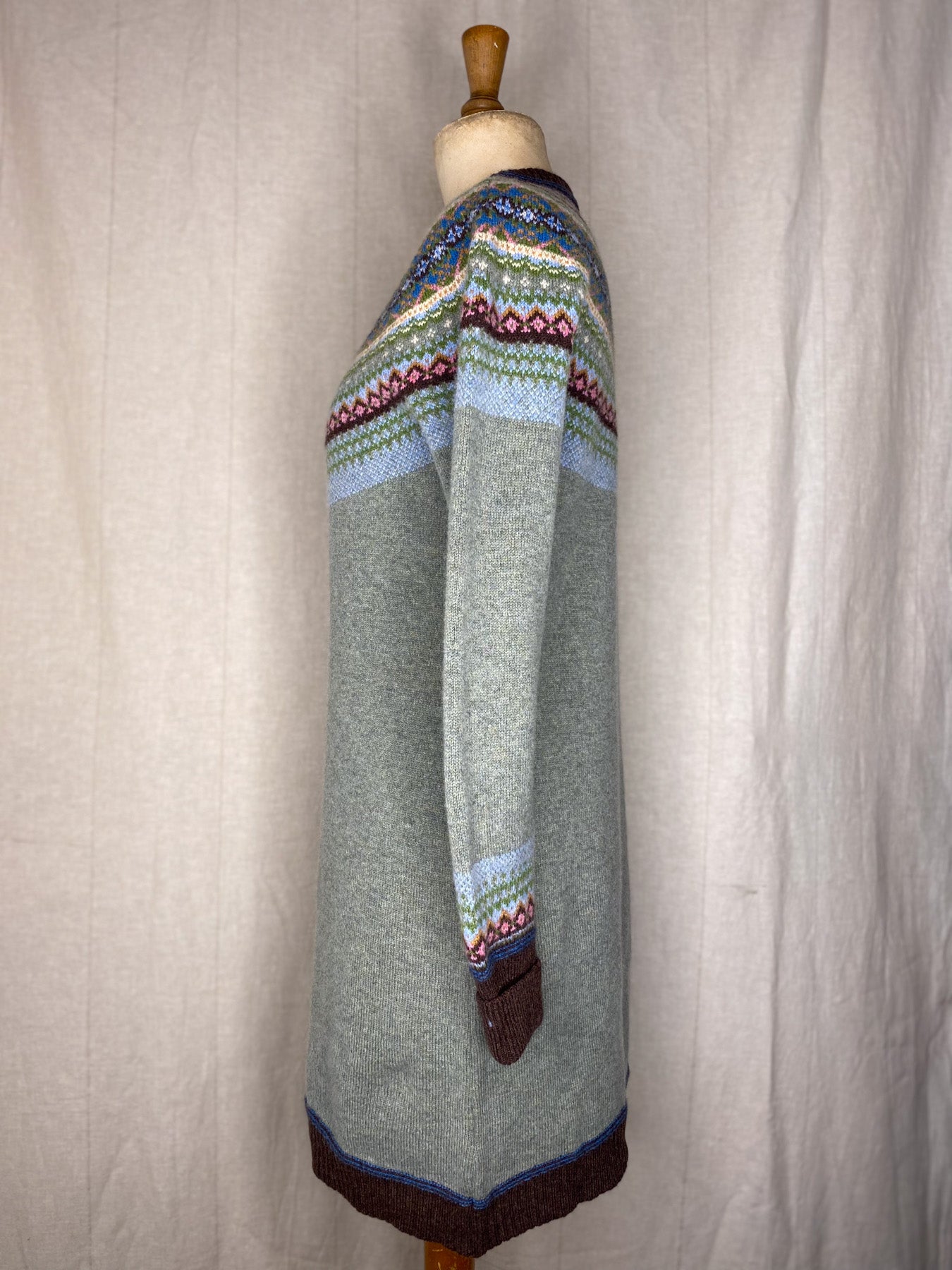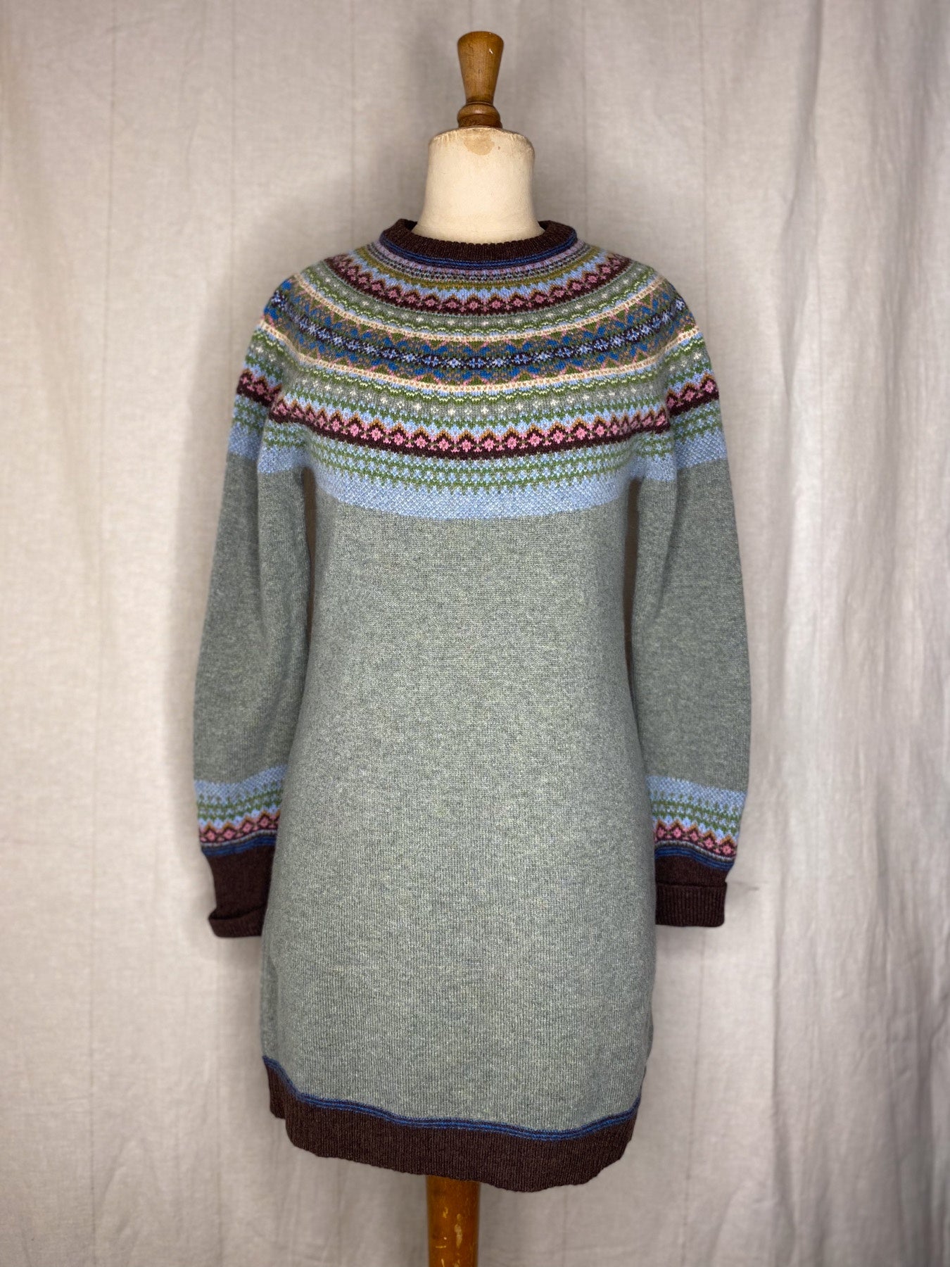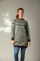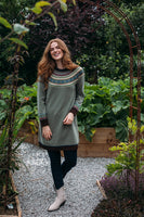 Unlike the classic 'Alpine' styles, this Alpine dress does not feature angora yarn in the Fairisle pattern.