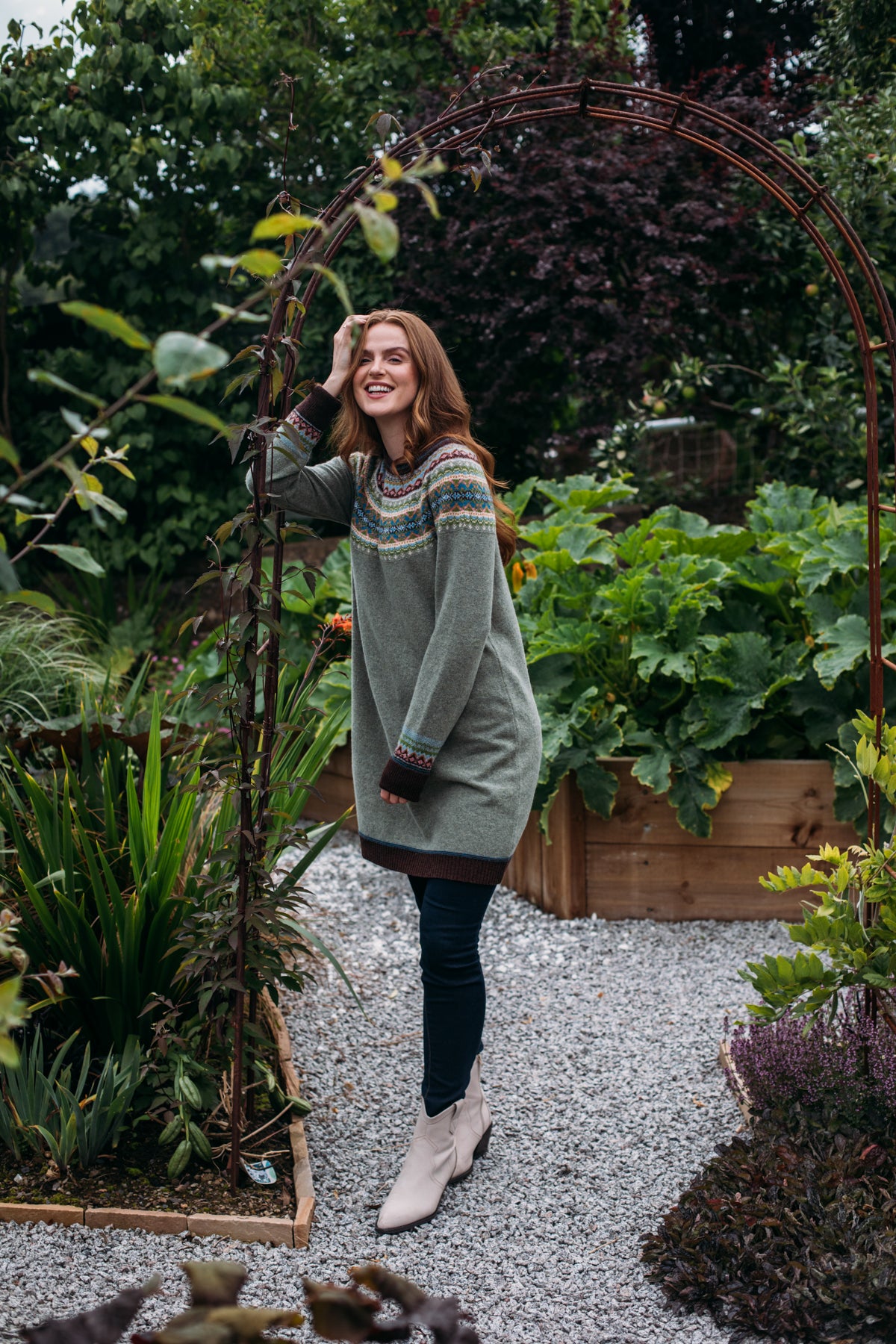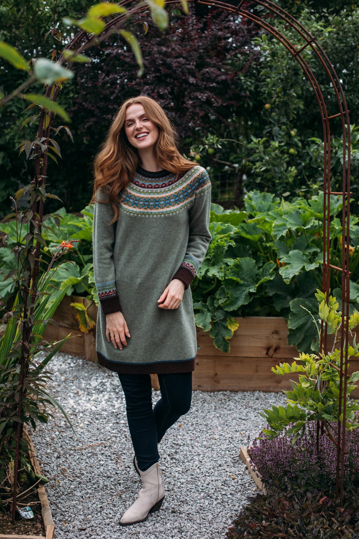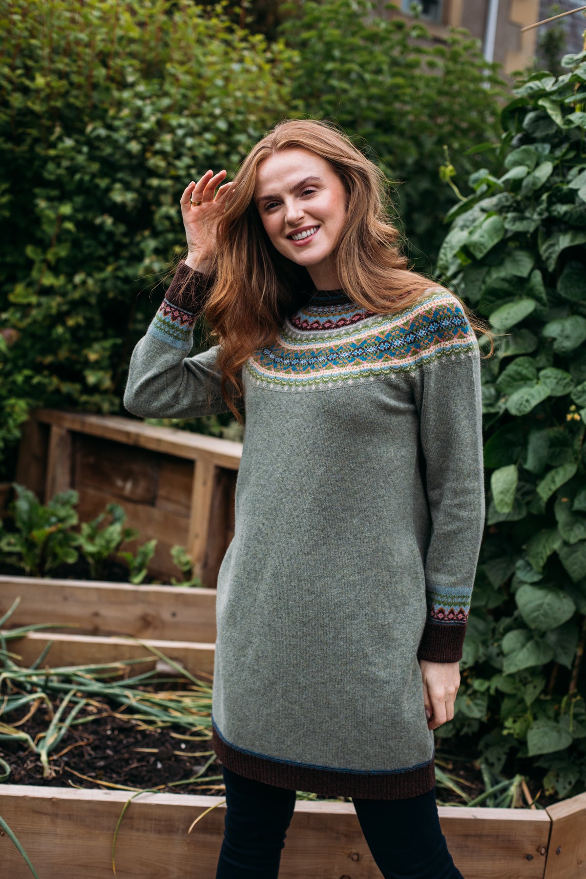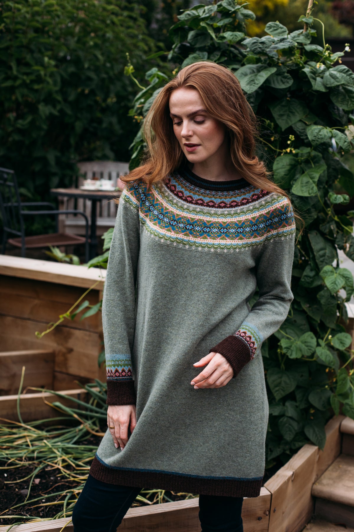 Unlike the classic 'Alpine' styles, this Alpine dress does not feature angora yarn in the Fairisle pattern.