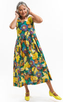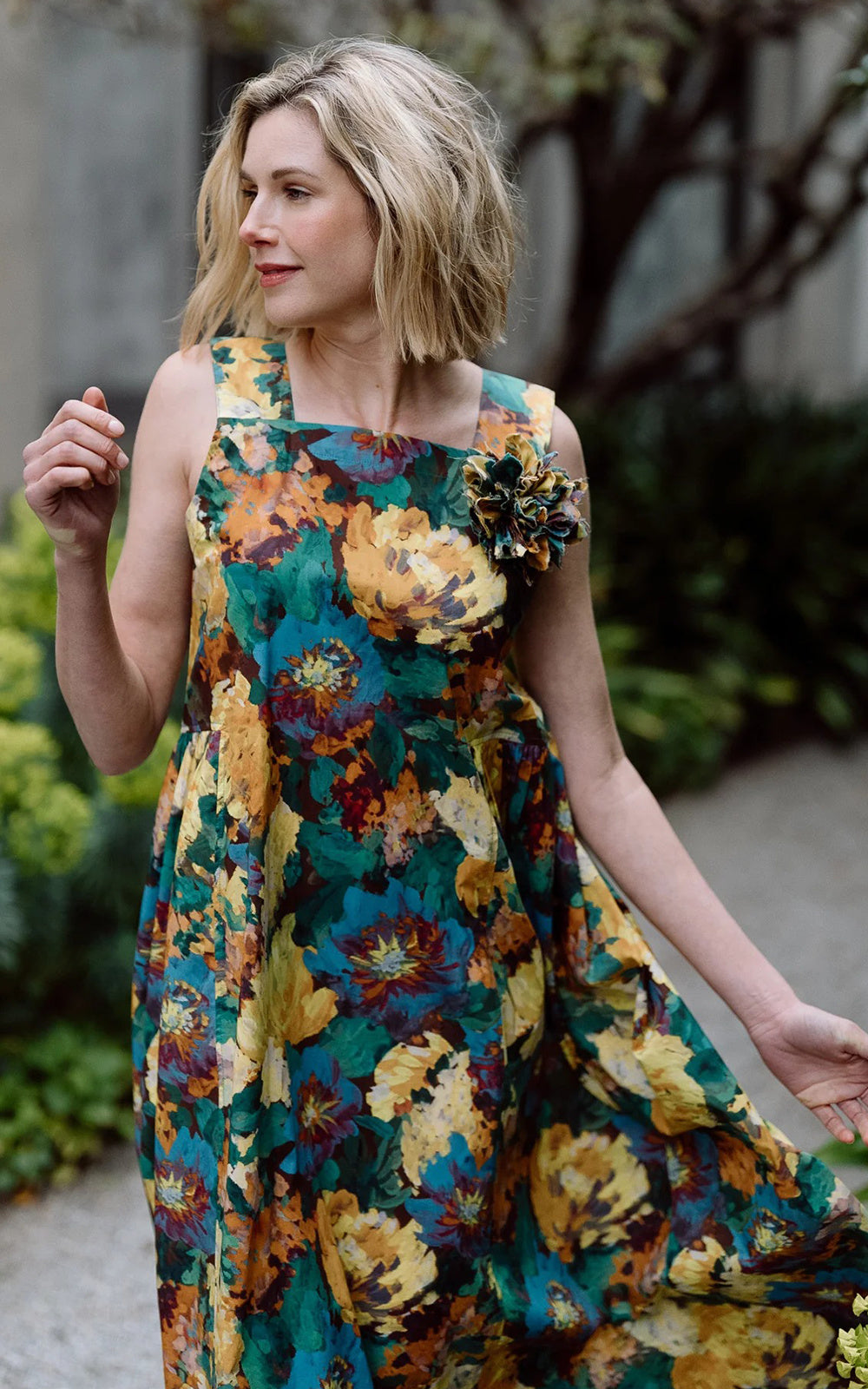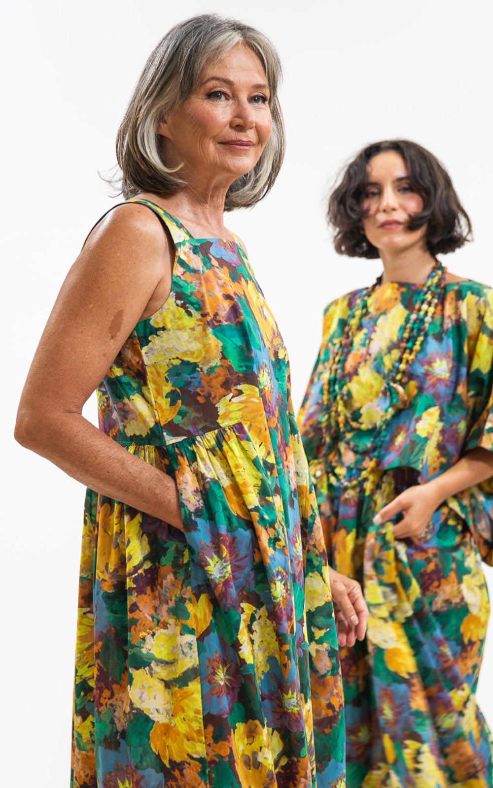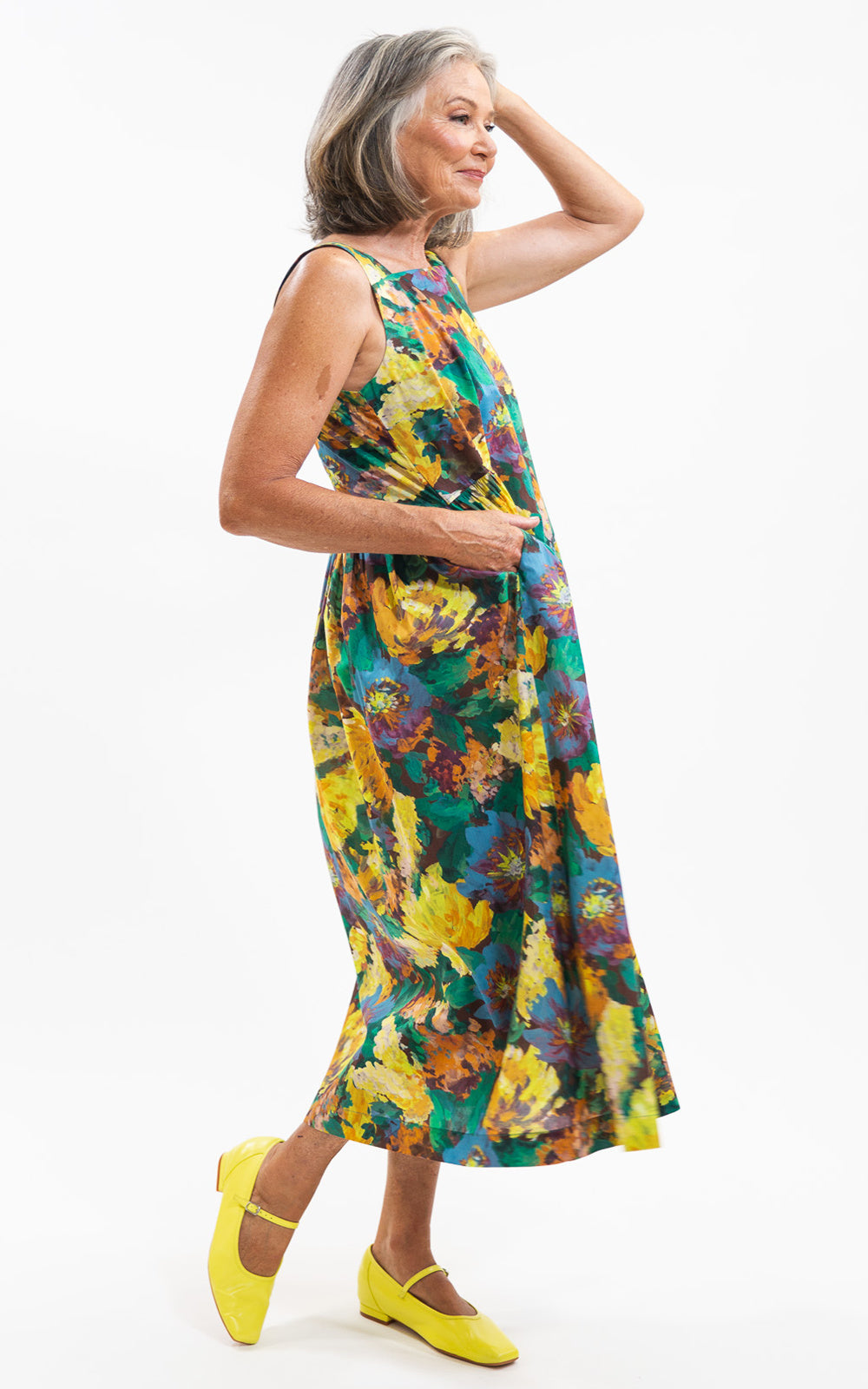 The Violet Dress is a versatile pinafore-style dress featuring wide, over-the-shoulder straps and a squared-off neckline that is defined by its distinct print in this season’s Artists Bouquet, a pure Liberty Cotton that mixes saffron yellow, verdant green, and bold purple brings in a painterly floral. This dress is reversible, providing two distinct looks in one.