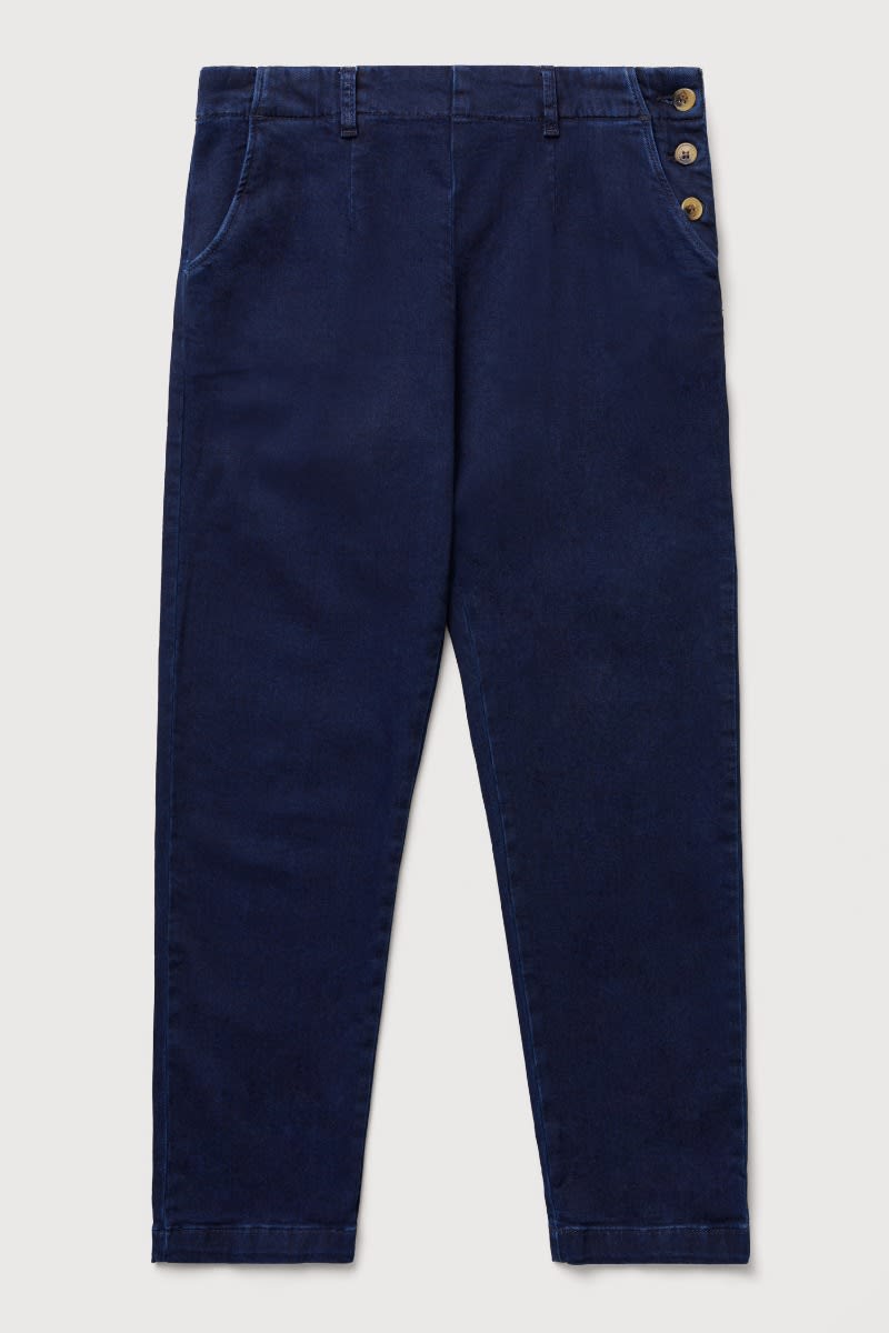 Seasalt's bestselling Waterdance Trousers are a year-round favourite, with a touch of stretch for ease of movement. They sit just below the natural waist and have a relaxed tapered shape, which looks great with boots or rolled up above sandals. They are styled with side fastening buttons and an elasticated back waistband for a comfortable fit and finished with two slanted side pockets and two back pockets.