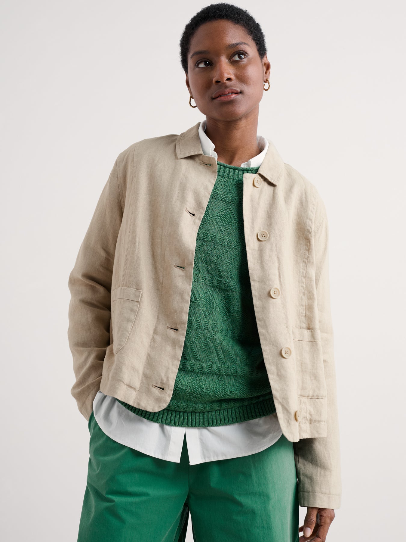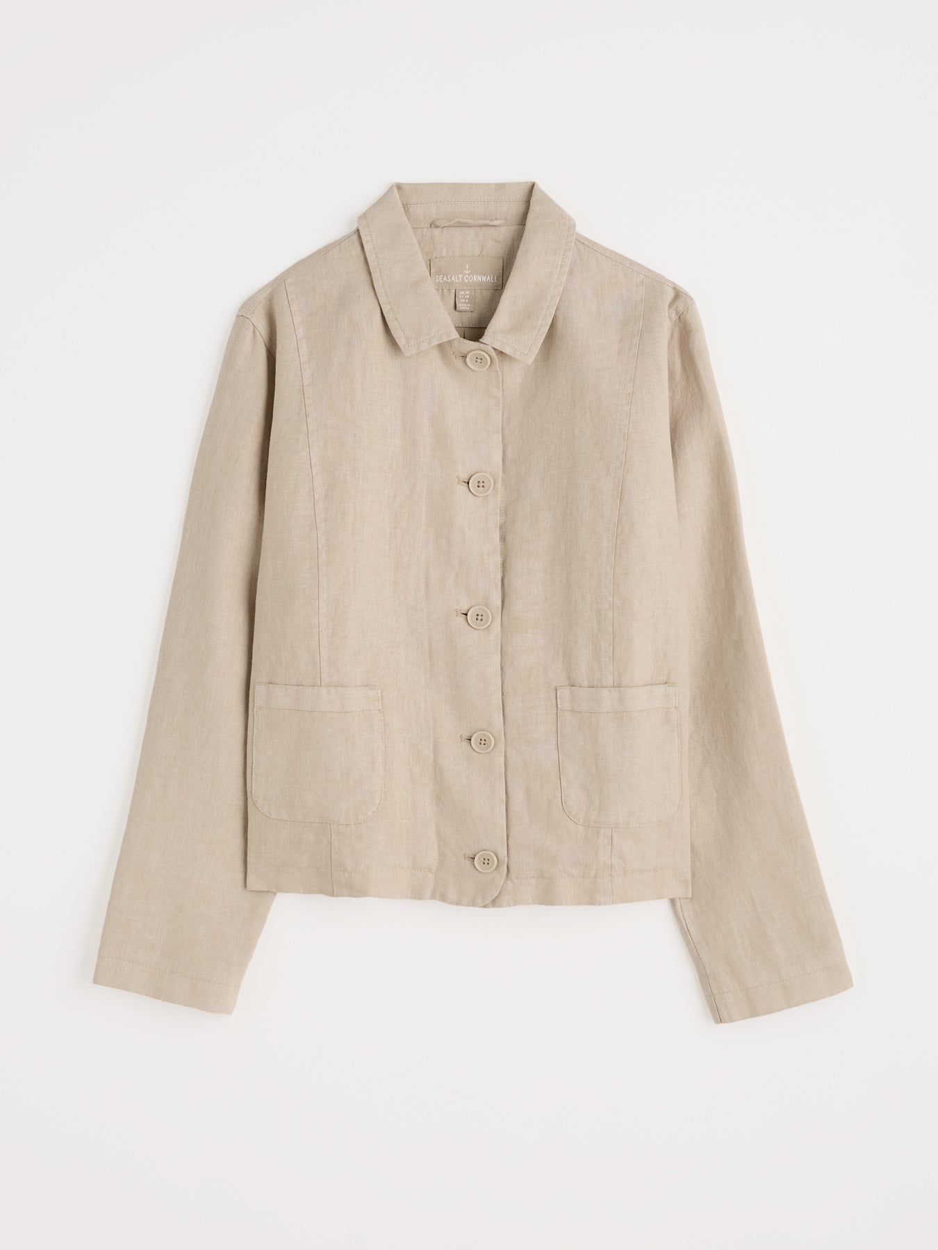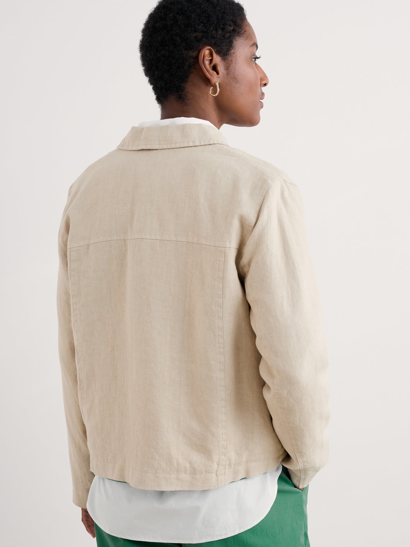 A classic garment-dyed linen jacket with an easy, relaxed structure that's influenced by Cornish workwear. Throw over jumpers and jeans, or wear loose over flowing dresses. Our linen will grow softer and smoother with each summer of wear, developing a characterful pattern of highs and lows that is completely unique.