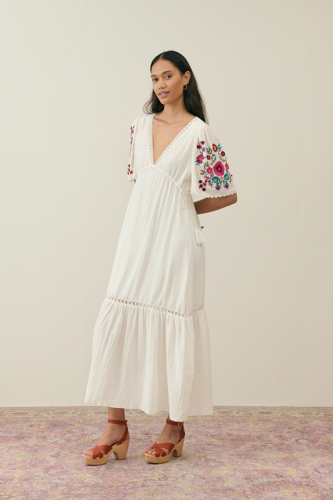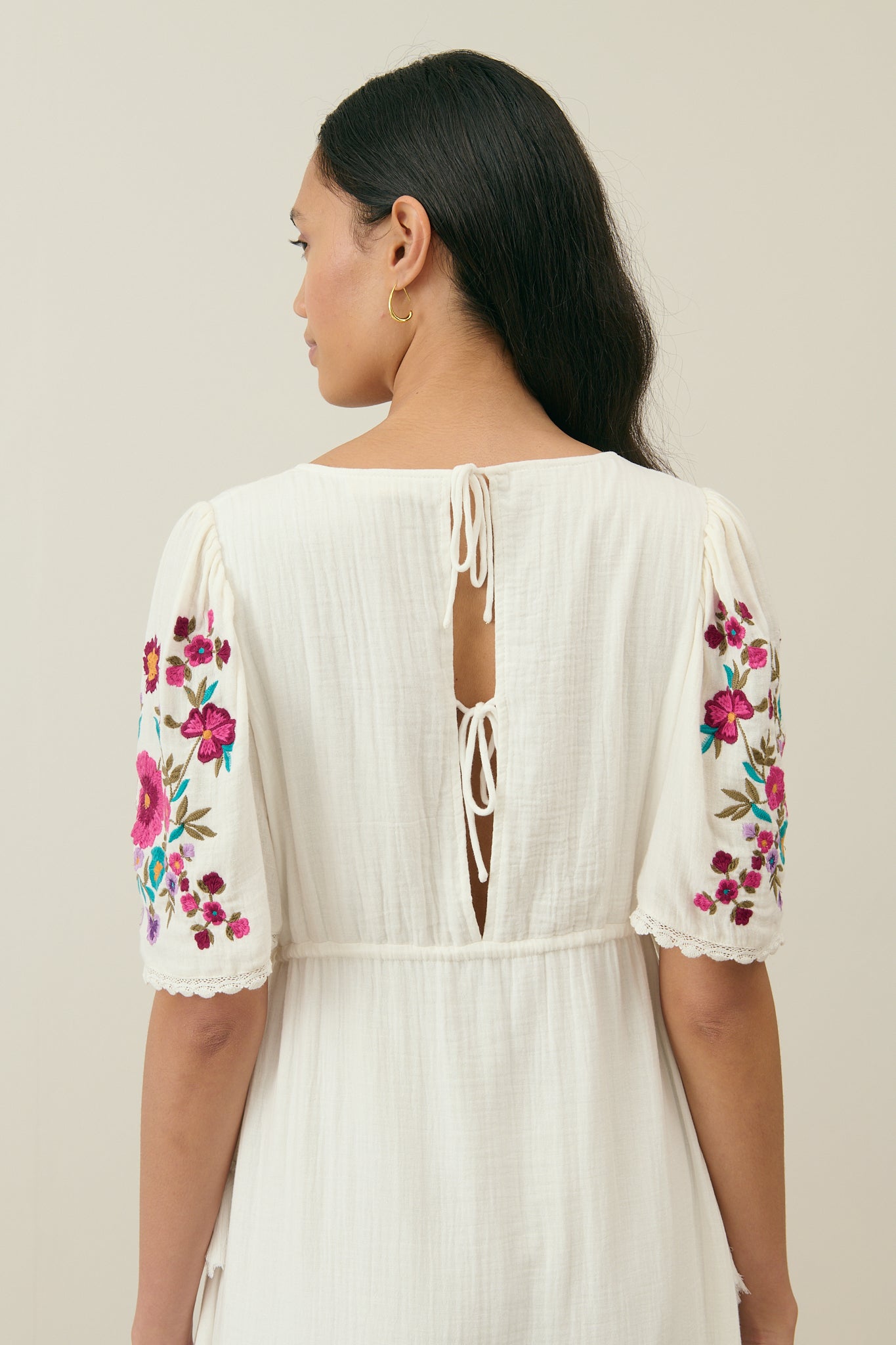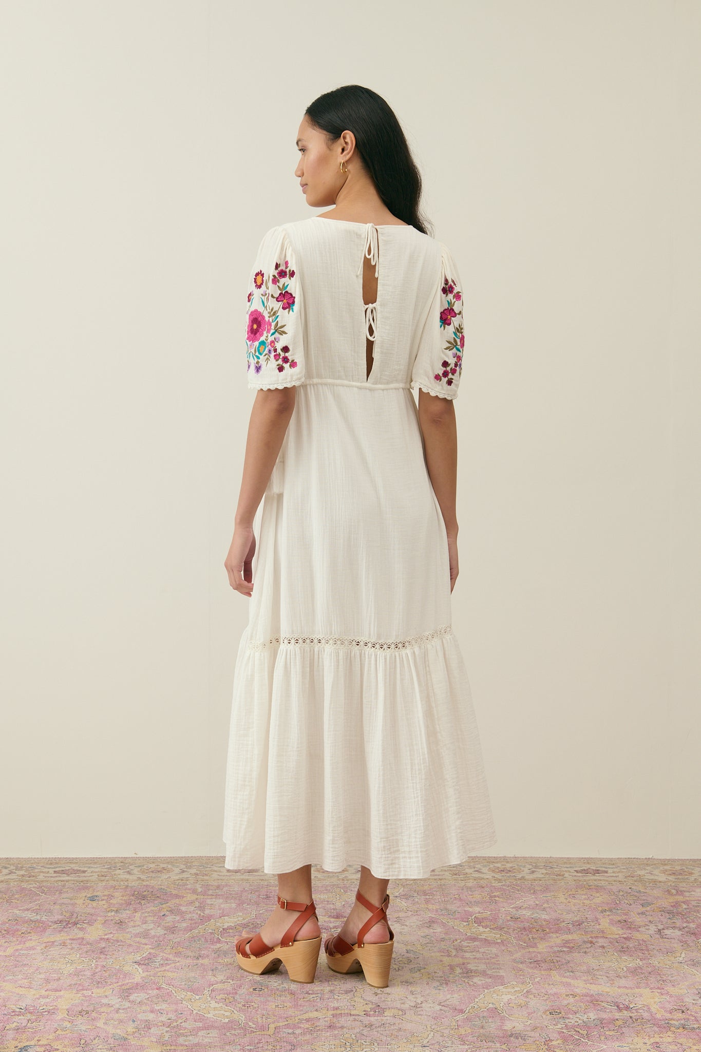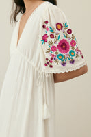 Embroidered butterfly sleeves with lace edges.
