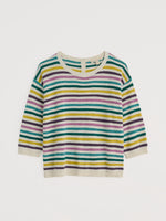 A relaxed-fitting jumper in cool and comfortable cotton linen slub yarn with a beautiful natural texture. This striped, textured knit has a simple boat neck and 3/4 length sleeves and is finished with rib detailing on the neckline, cuffs and hem and functioning buttons on the back. A slightly shorter style, it finishes at mid-hip, so it's perfect with skirts and linen trousers.