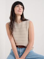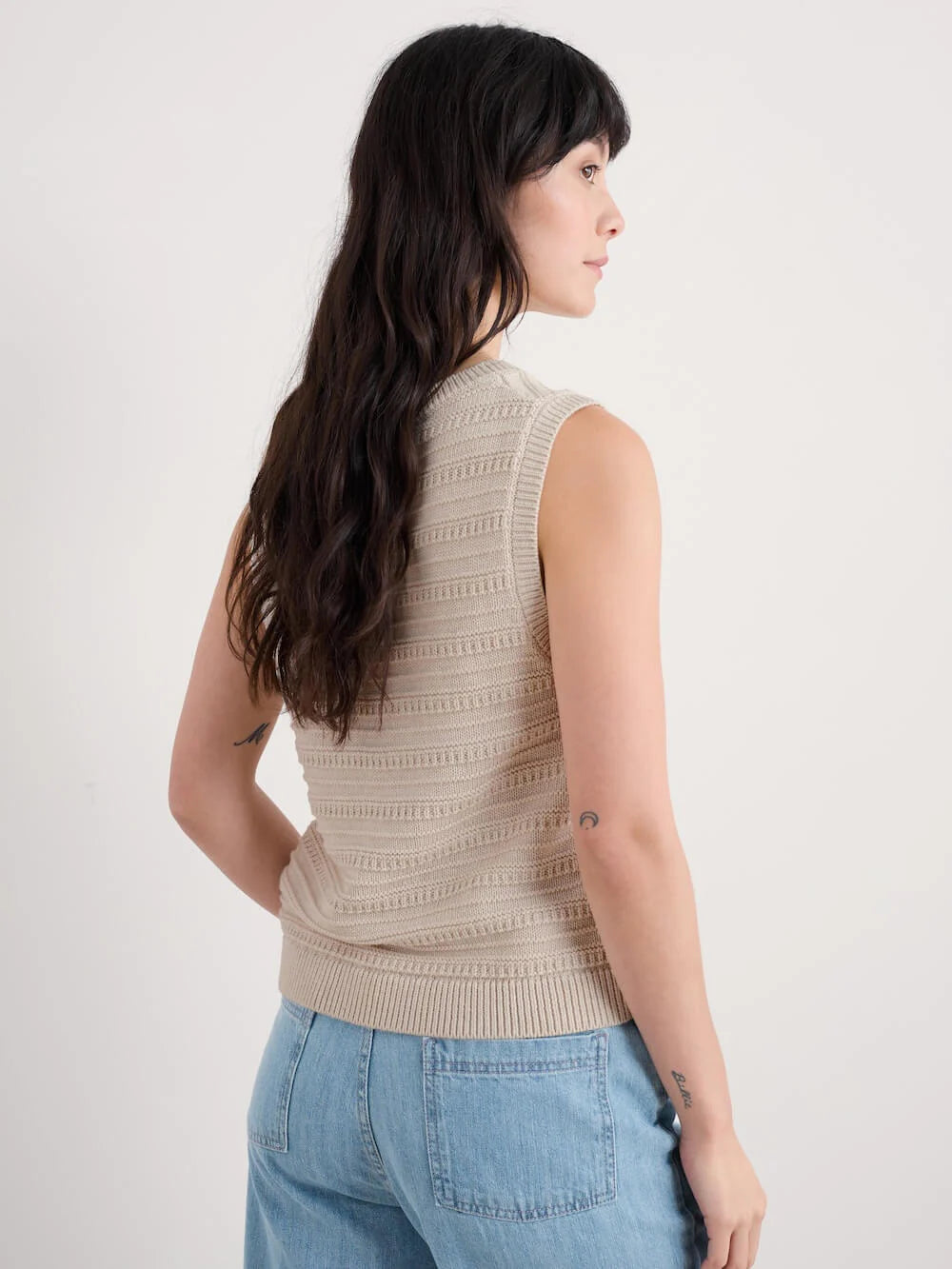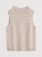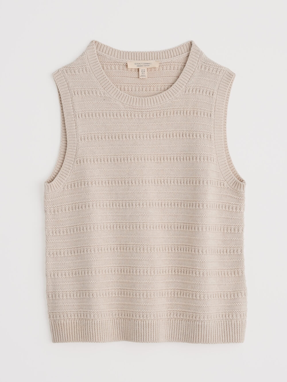 A mid weight round-neck knitted vest in soft, breathable organic cotton with a horizontal ribbed stitch pattern and ribbed edges. Designed to last through the seasons, it can be worn with and without a layer underneath. We love it over dresses or shirts, or worn alone with comfy jeans.
