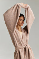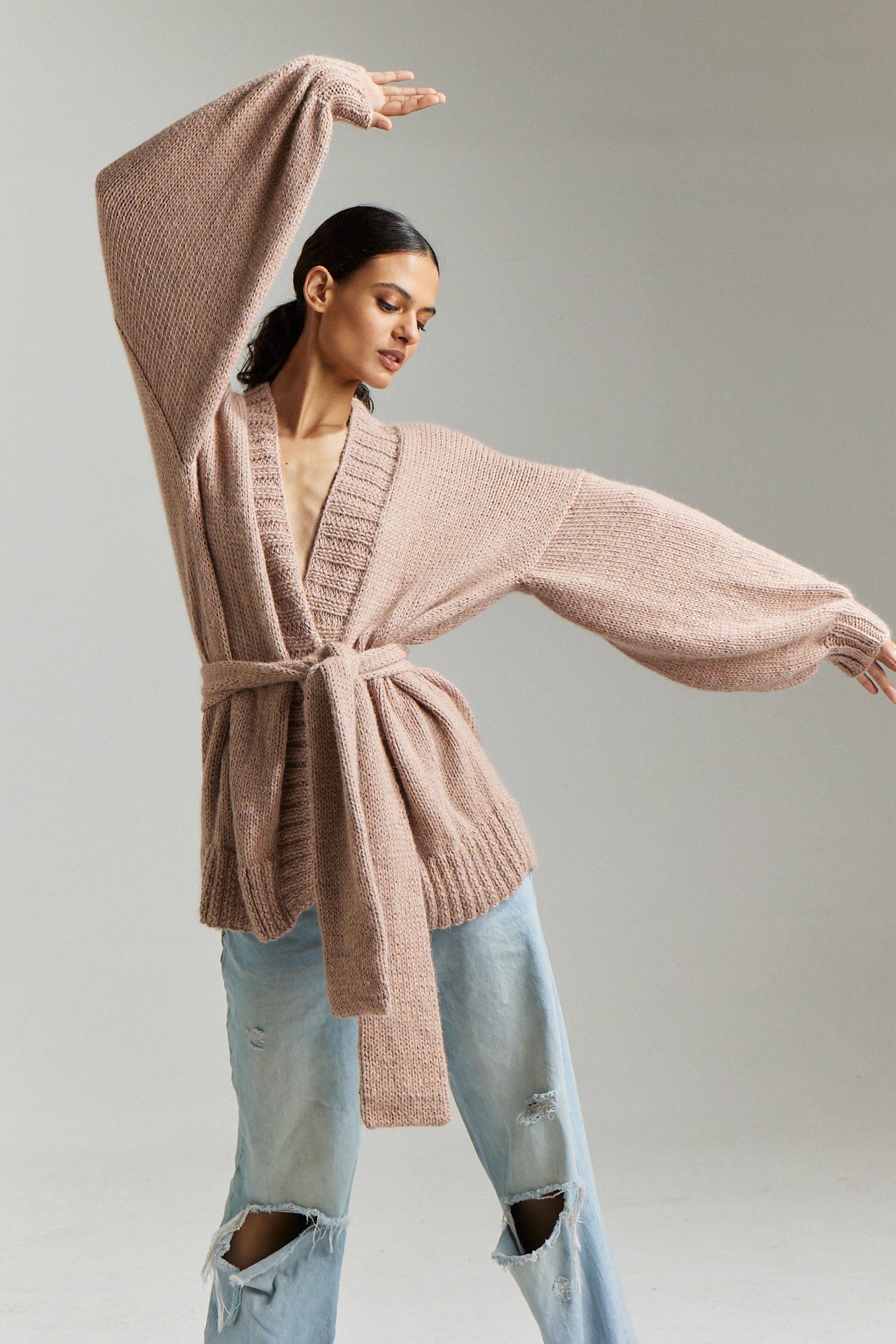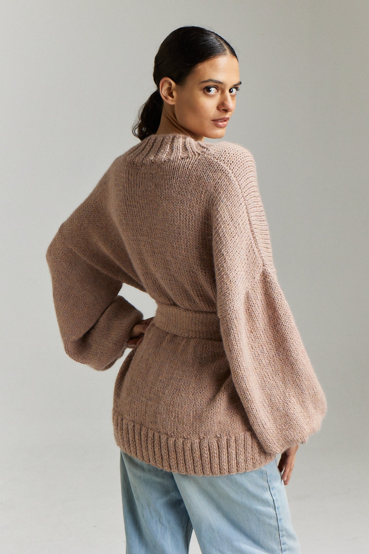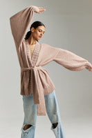 It is a hip length open cardigan with cuffed sleeves and a beautiful loose waist tie.