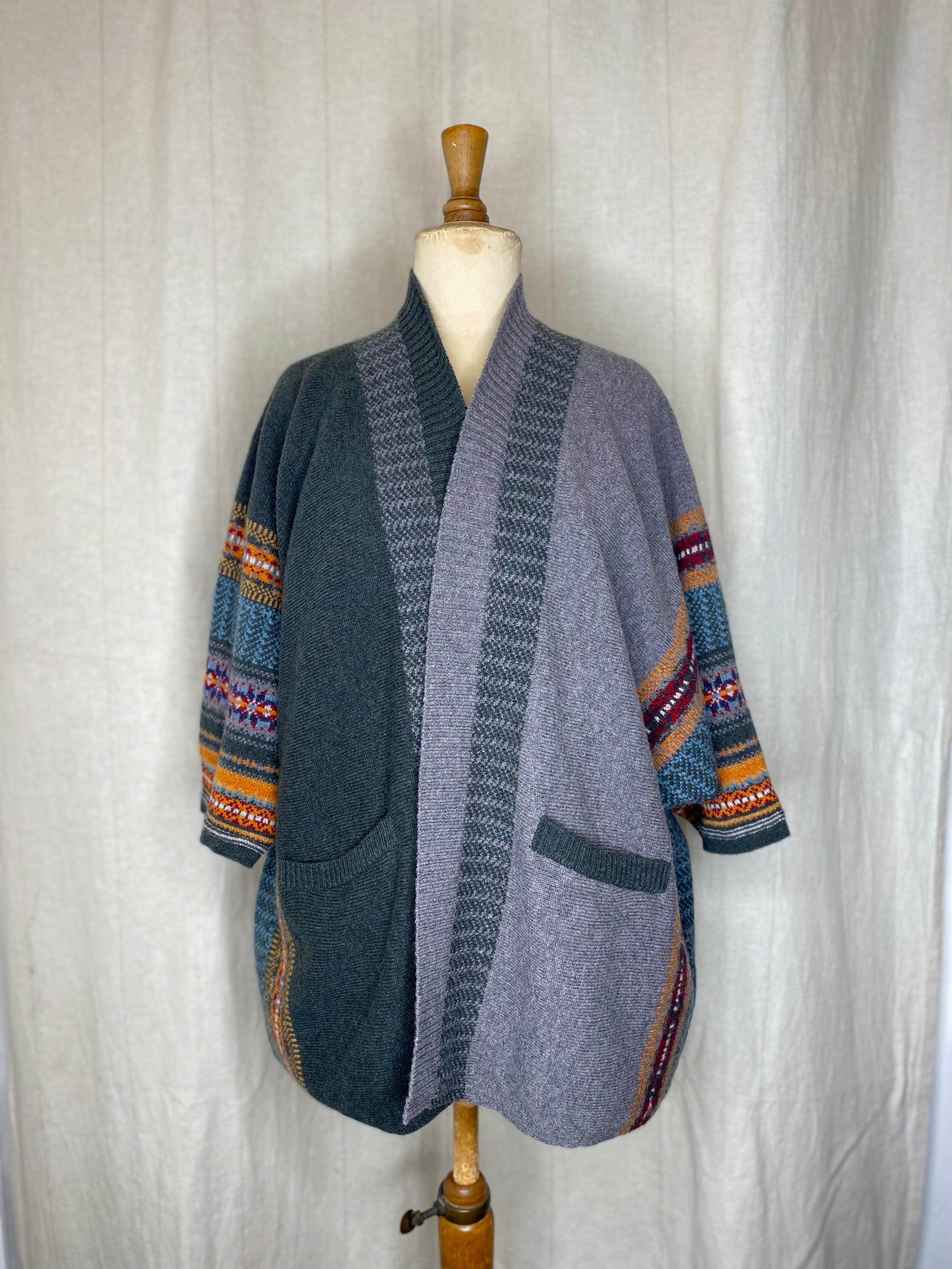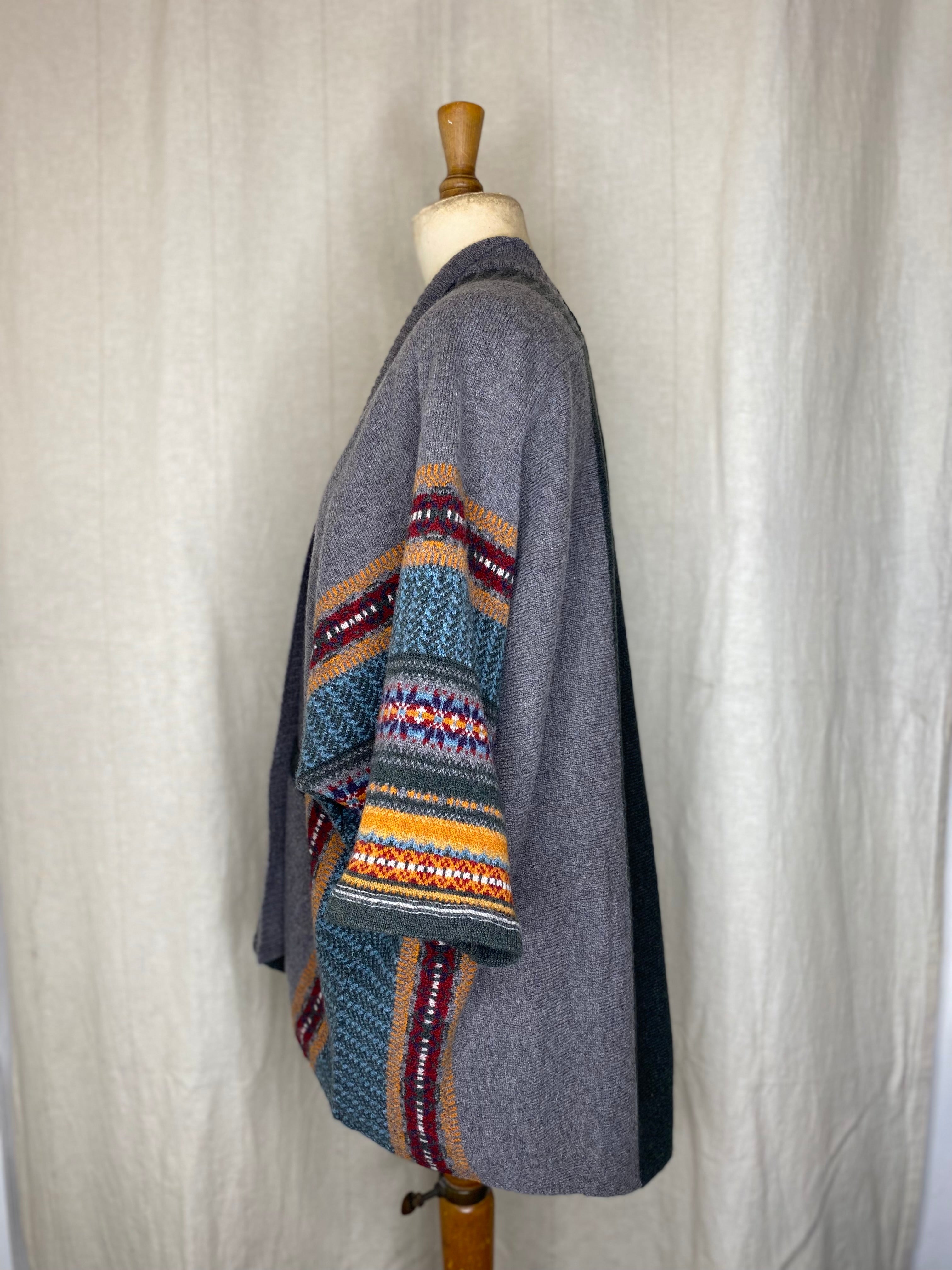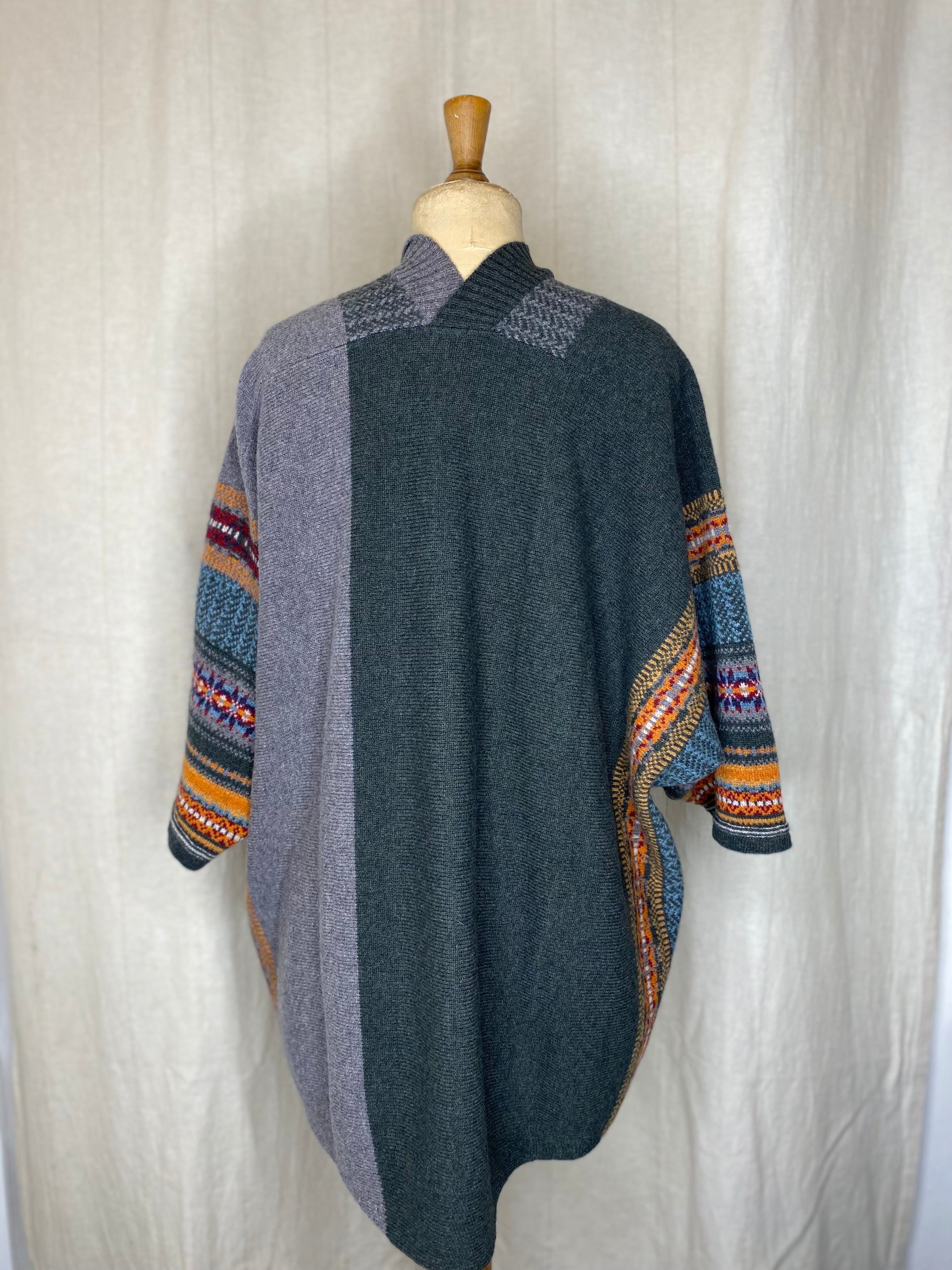 Striking, bold and easy to wear with unique design details such as guernsey ribs, tweed and Fairisle charm. Made with 100% Merino lambswool, this knitting technique gives a flattering drape for comfort and indivduality. Can be worn upside down with a collar and two side pockets for a touch of glamour.