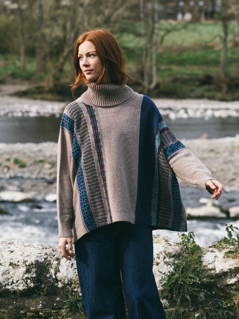 Striking, bold and easy to wear with unique design details such as guernsey ribs, tweed and Fairisle charm. Made with 100% Merino lambswool, this knitting technique gives a flattering drape for comfort and indivduality. Can be worn upside down with a collar and two side pockets for a touch of glamour.