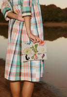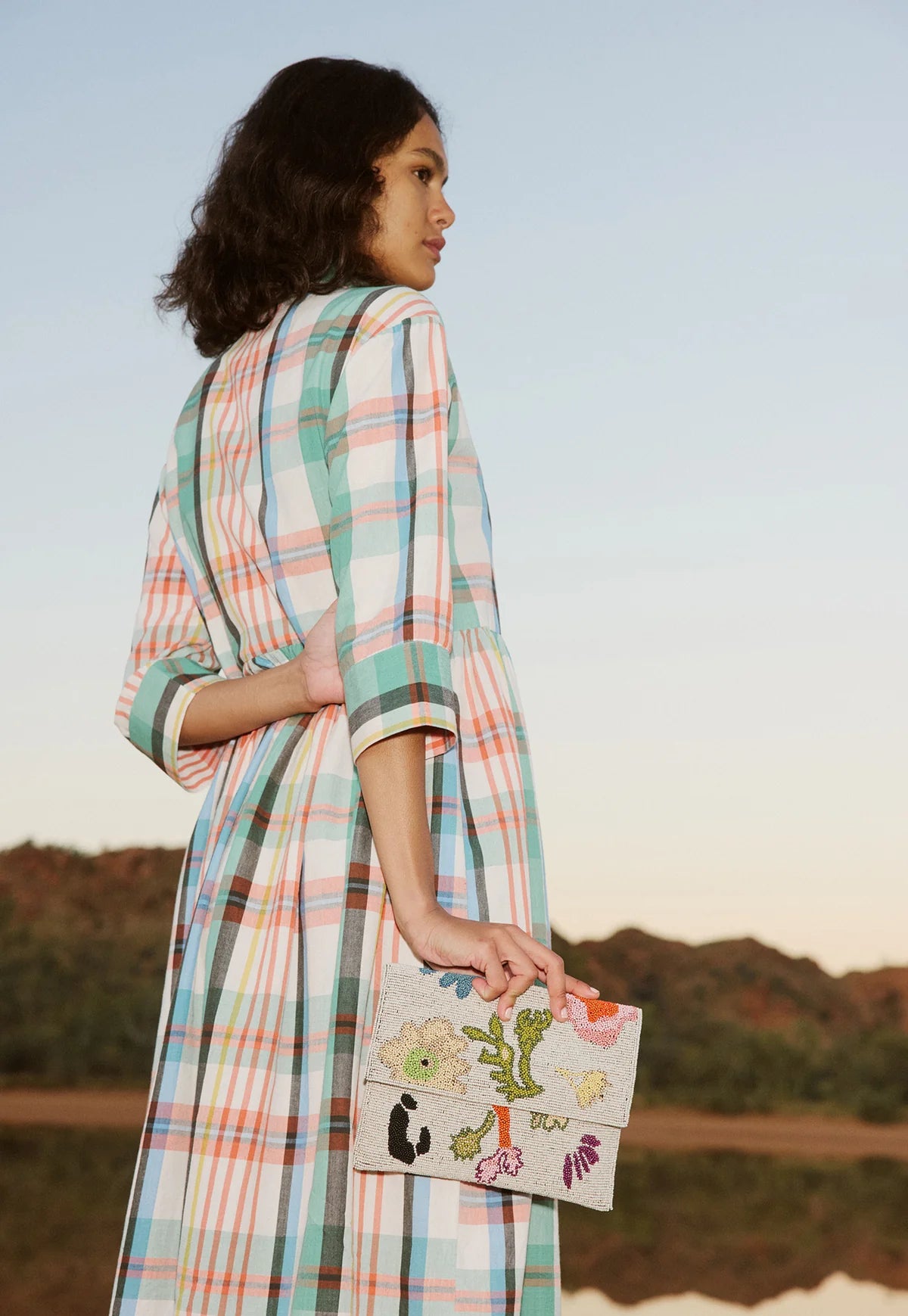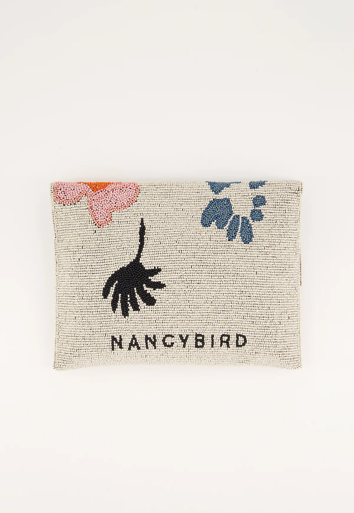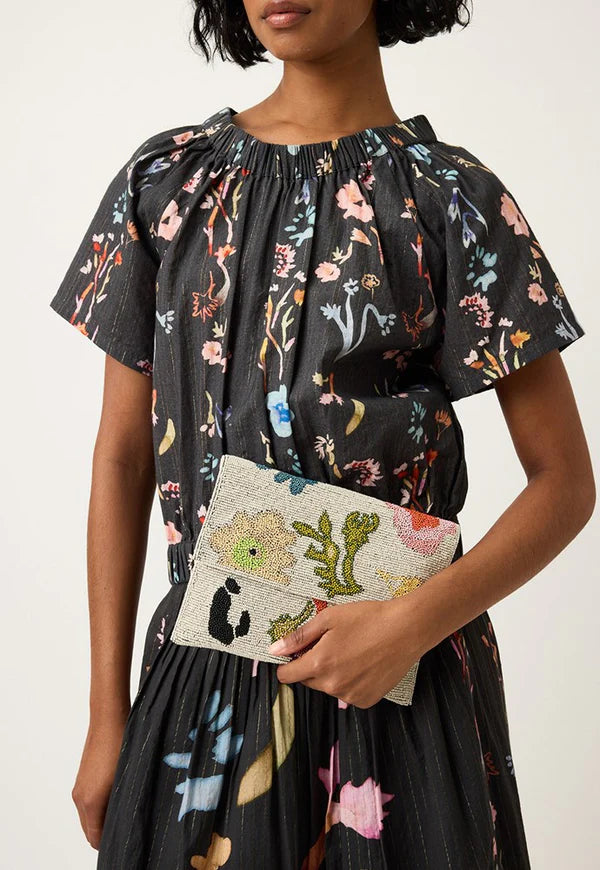 Artisan made using thousands of glass beads, this folded clutch is soft and slouchy, featuring our Watercolour floral design.