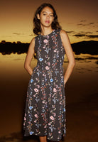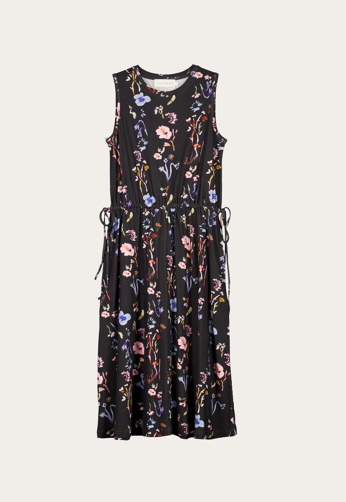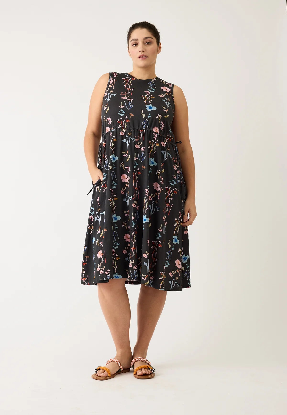 This sleeveless midi dress combines comfort and style with an adjustable waist and tank design.