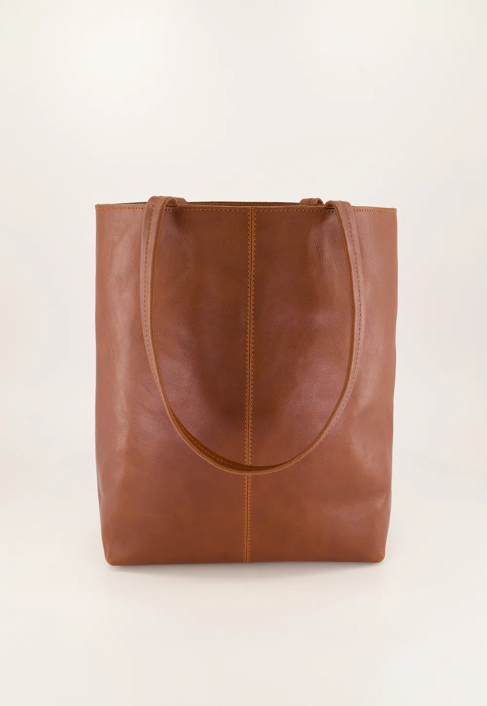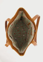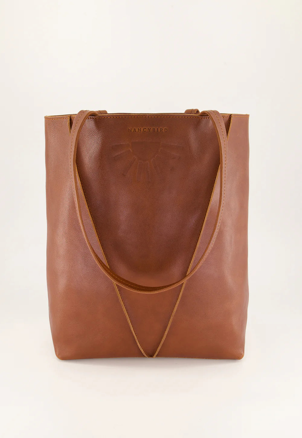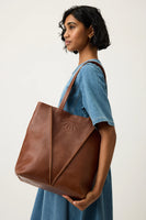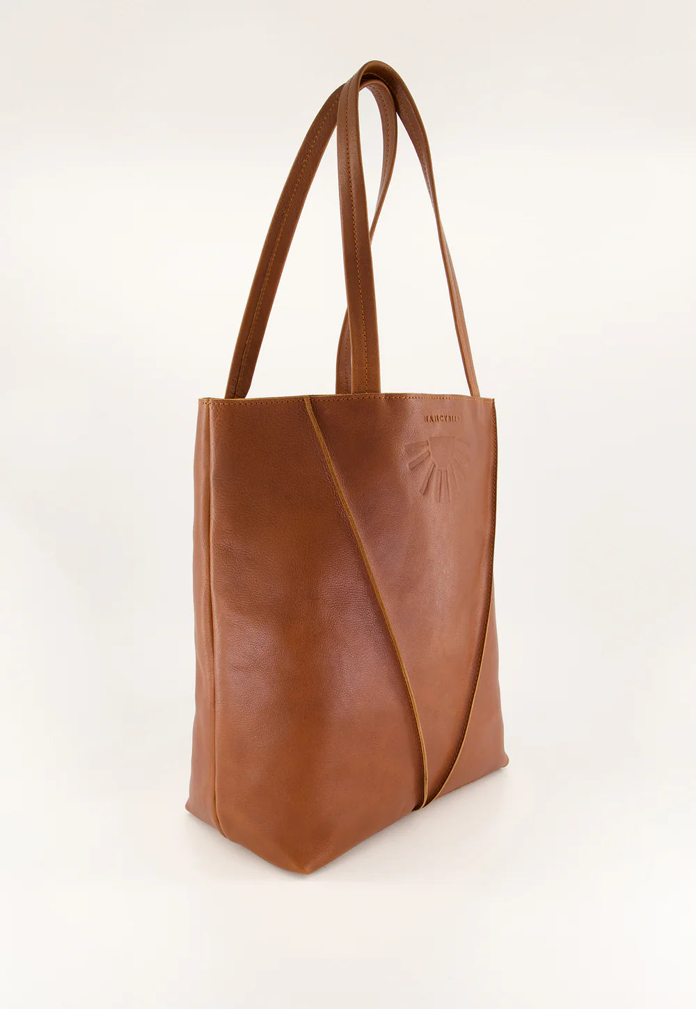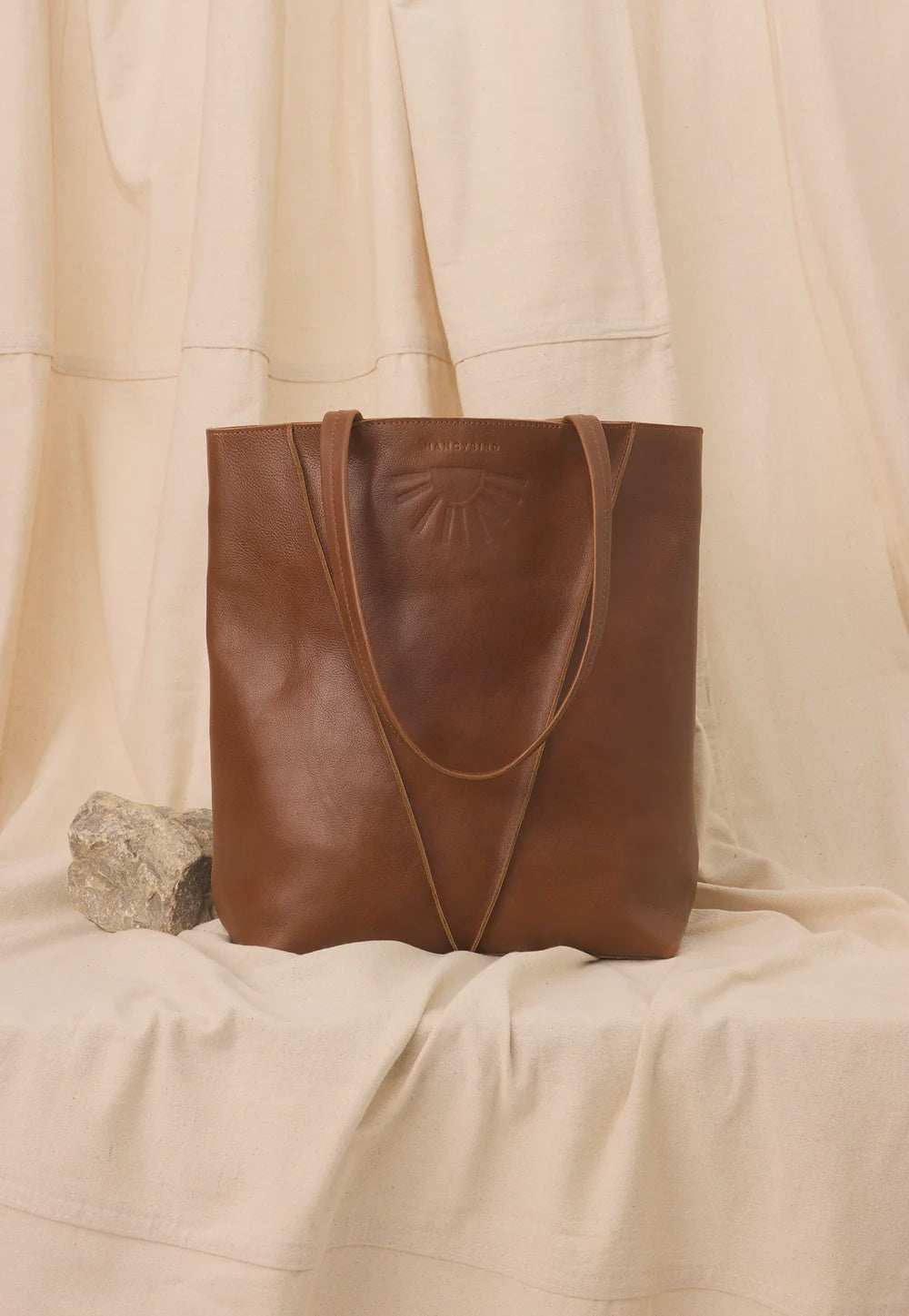 Generously sized tote with raw edged stitching features, sun embossing, top magnetic closure and comfortable shoulder straps.