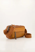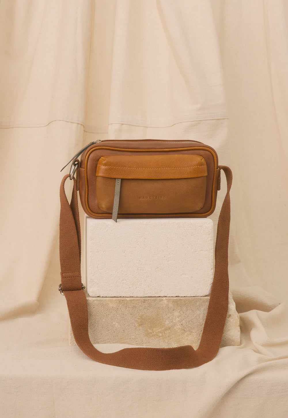 The vegetable tanned cow leather bag featuring a woven cotton adjustable crossbody strap, front zipped pocket, Inside open and zip pocket and crafted in GOTS certified organic printed cotton lining