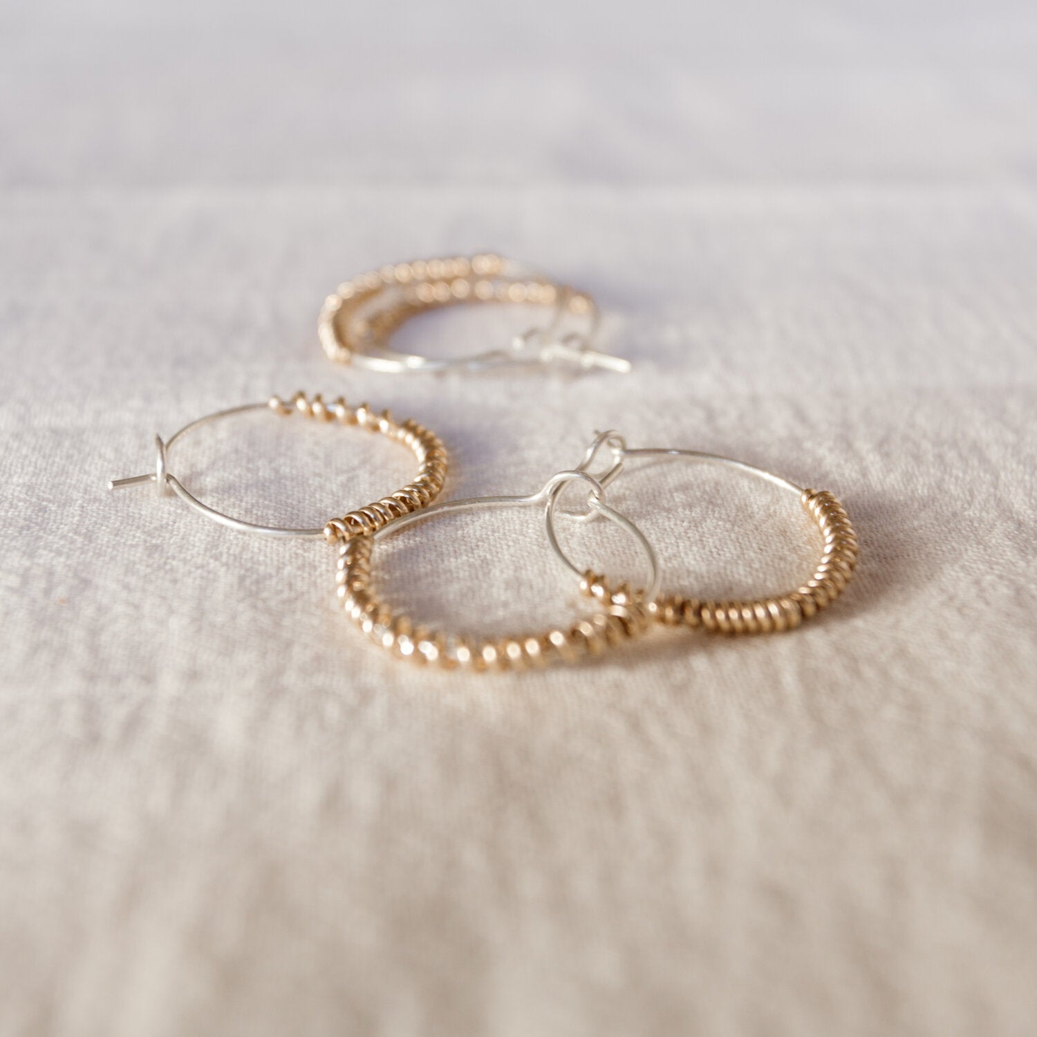 The Acacia Hoops detail a simple sterling silver ring, which has been elegantly wrapped in 14ct gold wire.