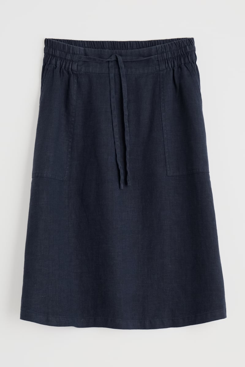 A light and airy knee length linen skirt with a comfortable elasticated waistband and large patch pockets. Available in a collection of garment-dyed shades with a naturally lived in look that gets better with every wear.