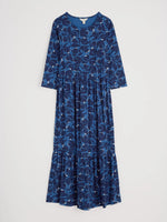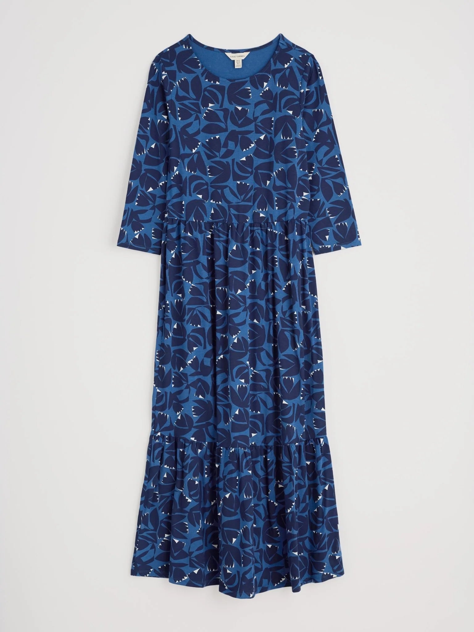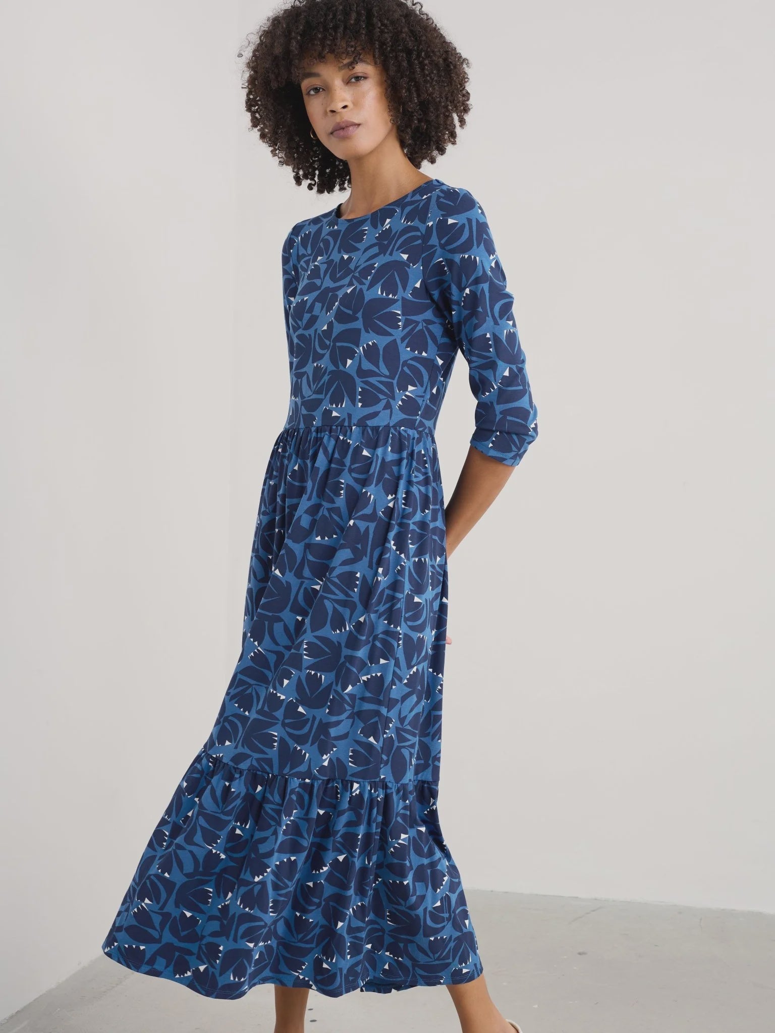 A swaying summer dress with a gathered waist, made from a breathable jersey blend with bamboo-derived viscose. The deep tier at the bottom hem gives its seasonal print a lovely movement.