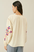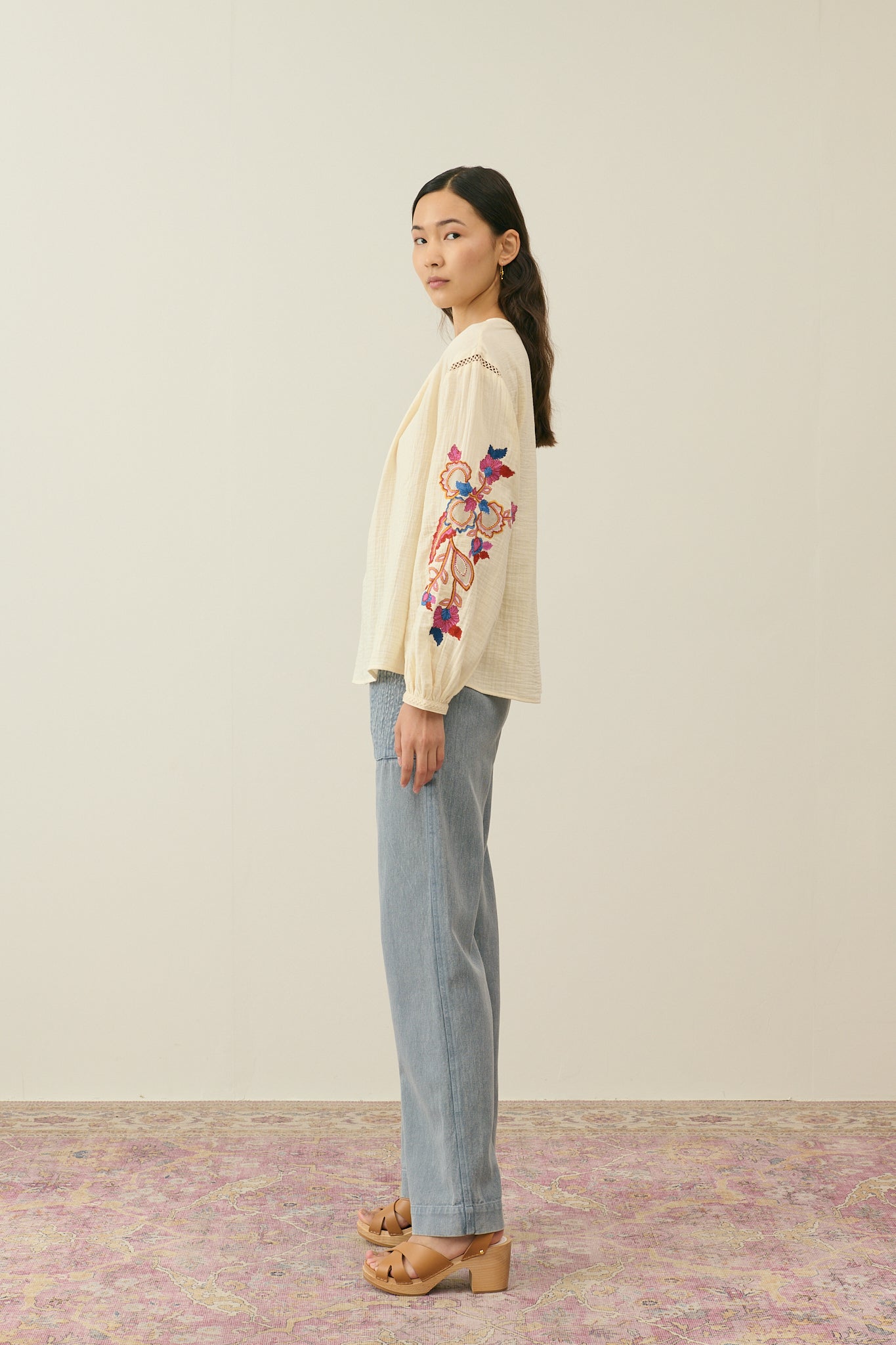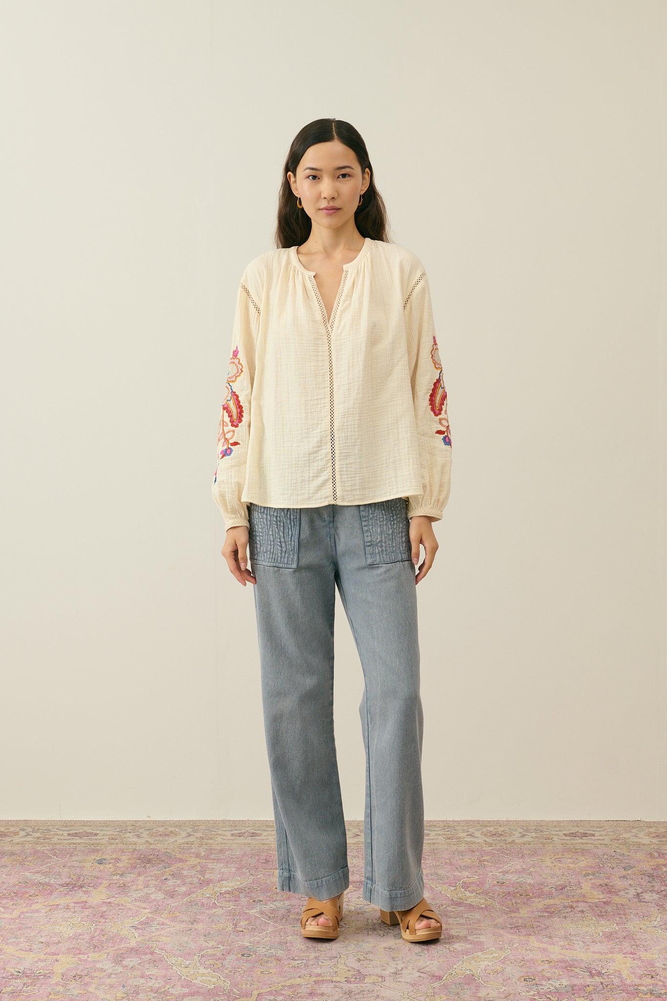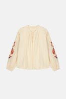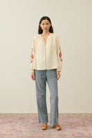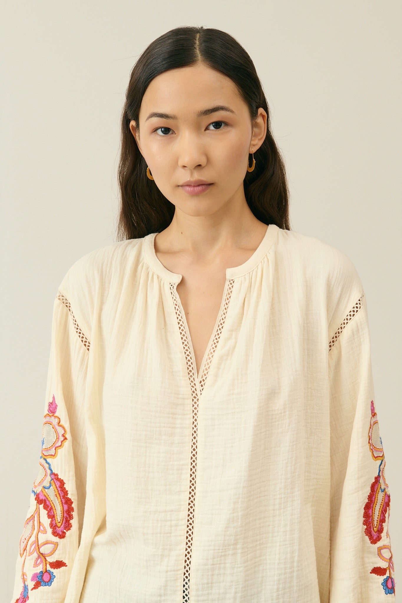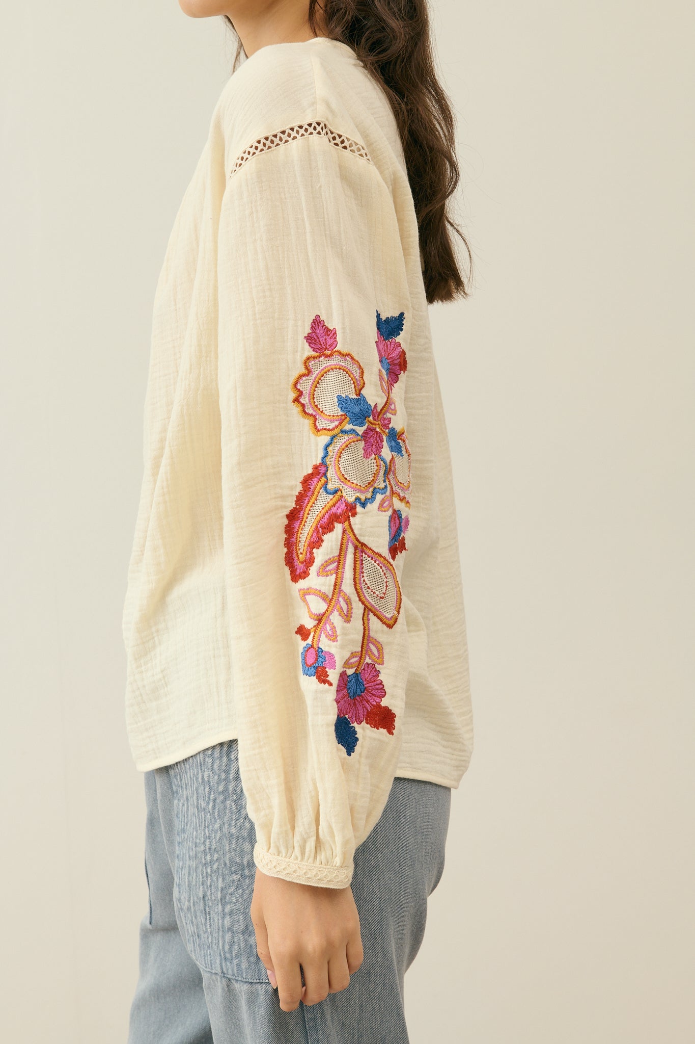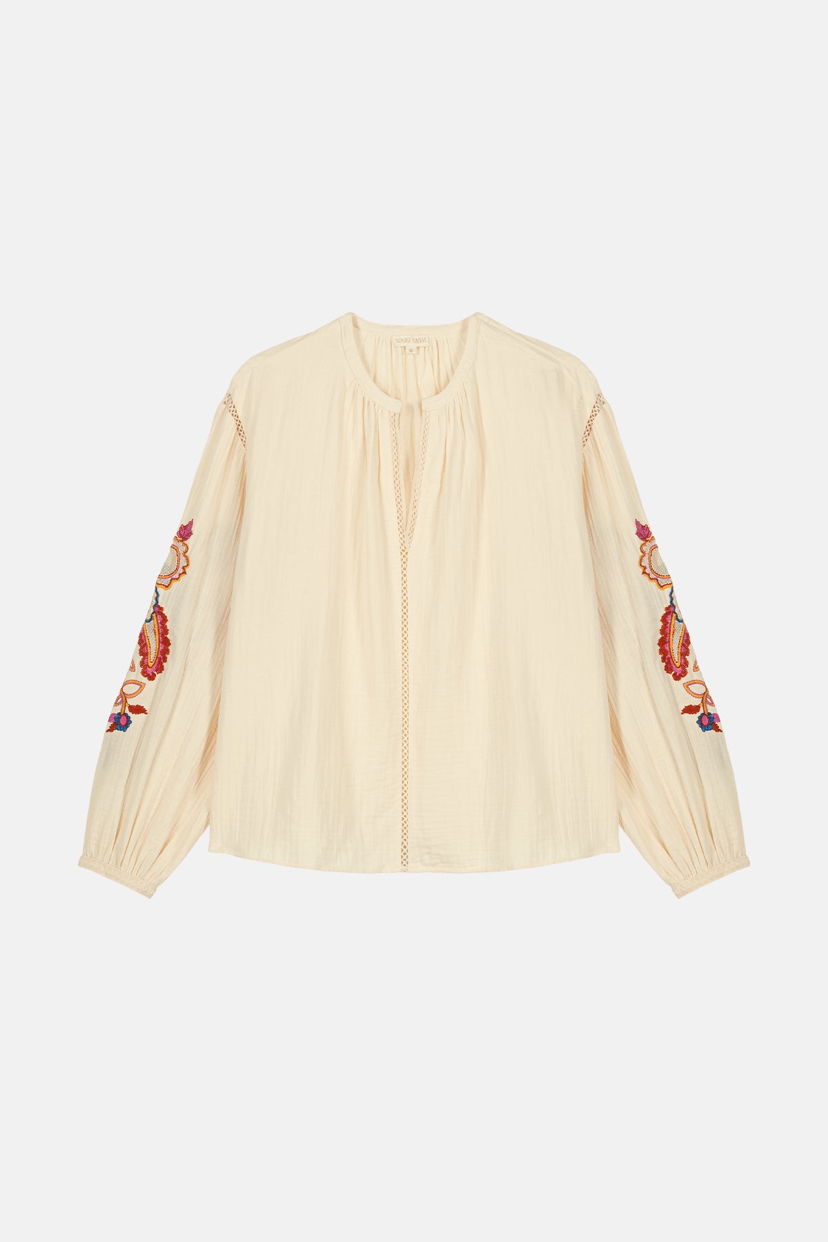 The details we loveDouble cotton gauze blouse.Round collar with front slit.Openwork lace details at front, armholes and cuffs