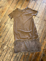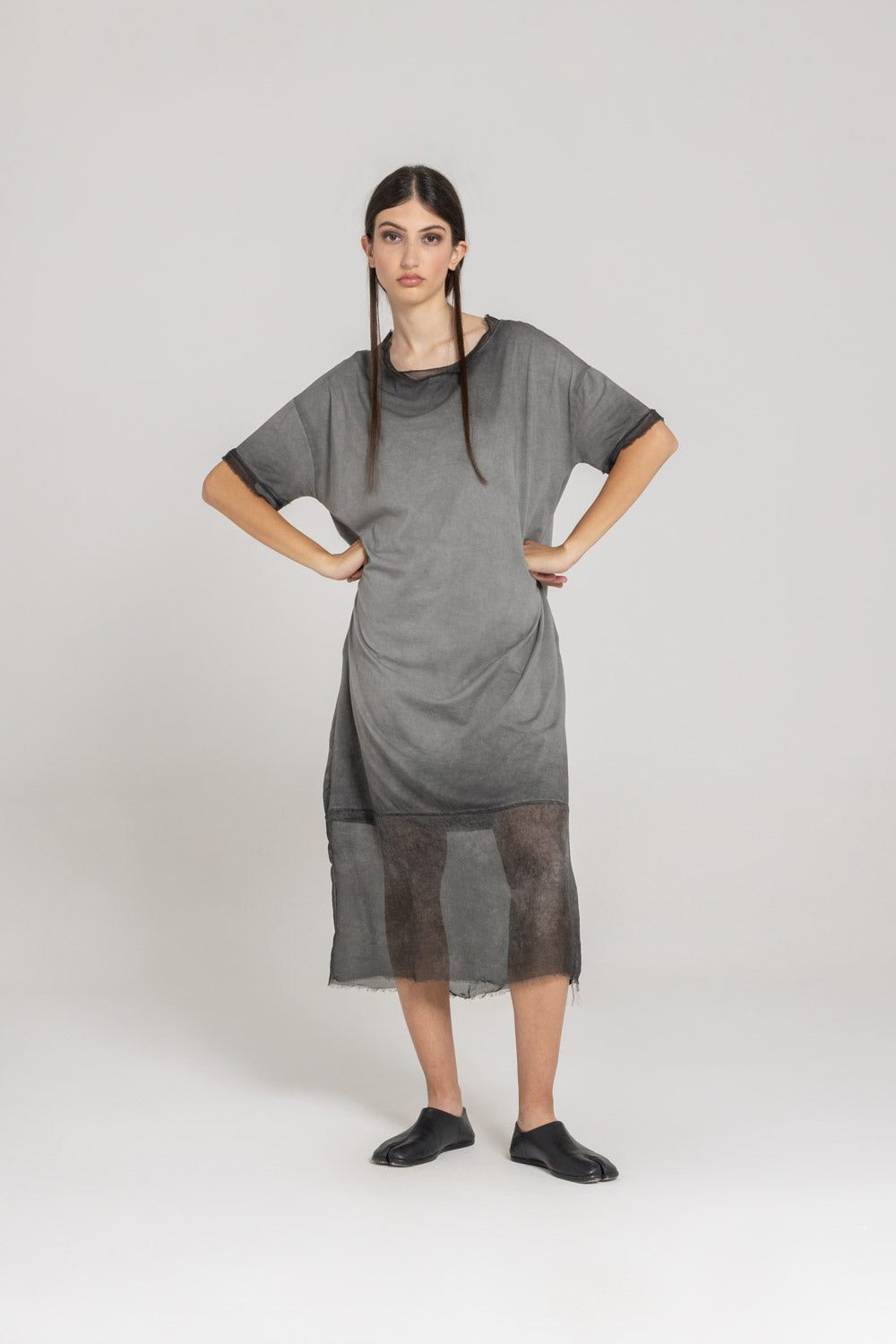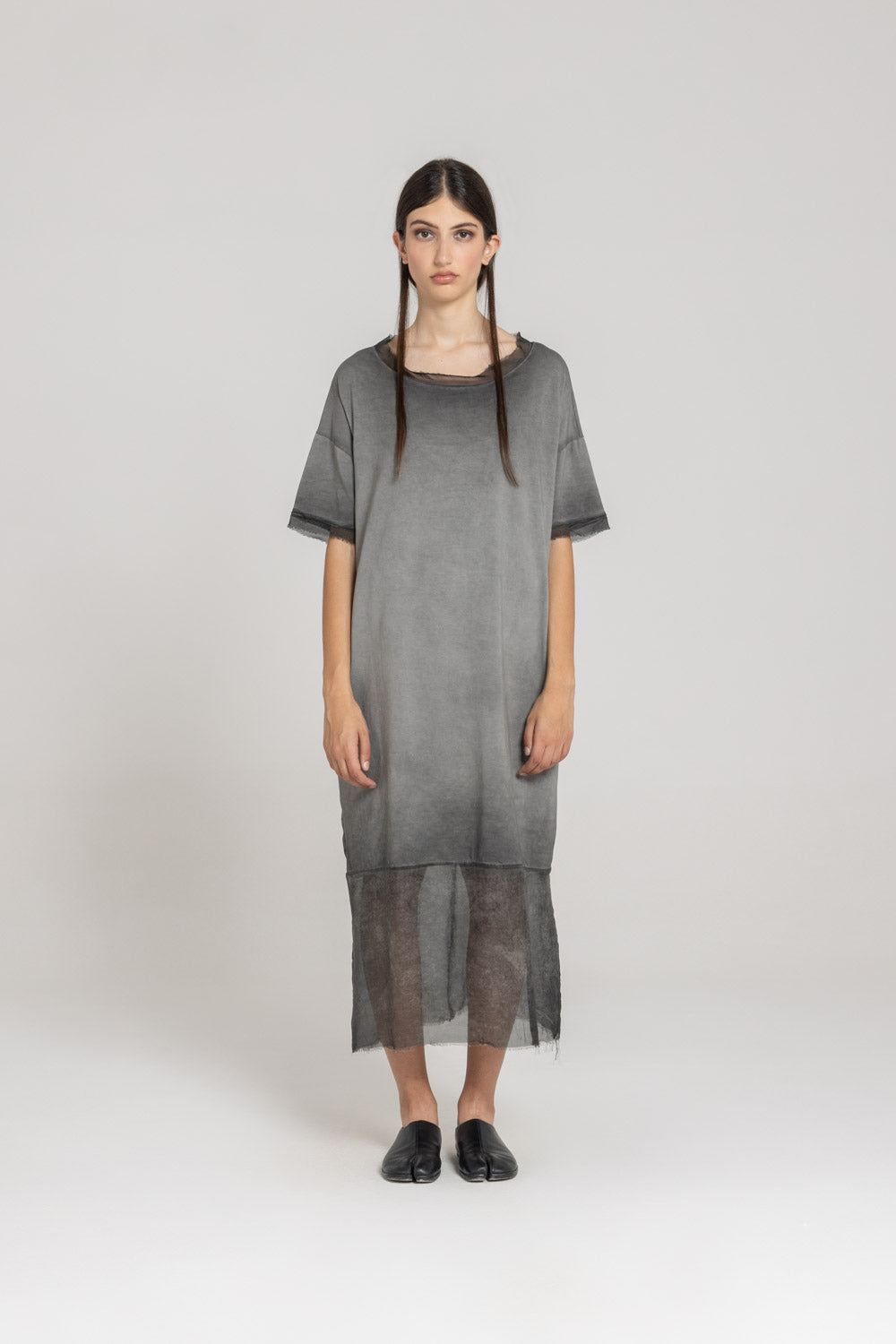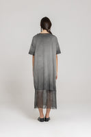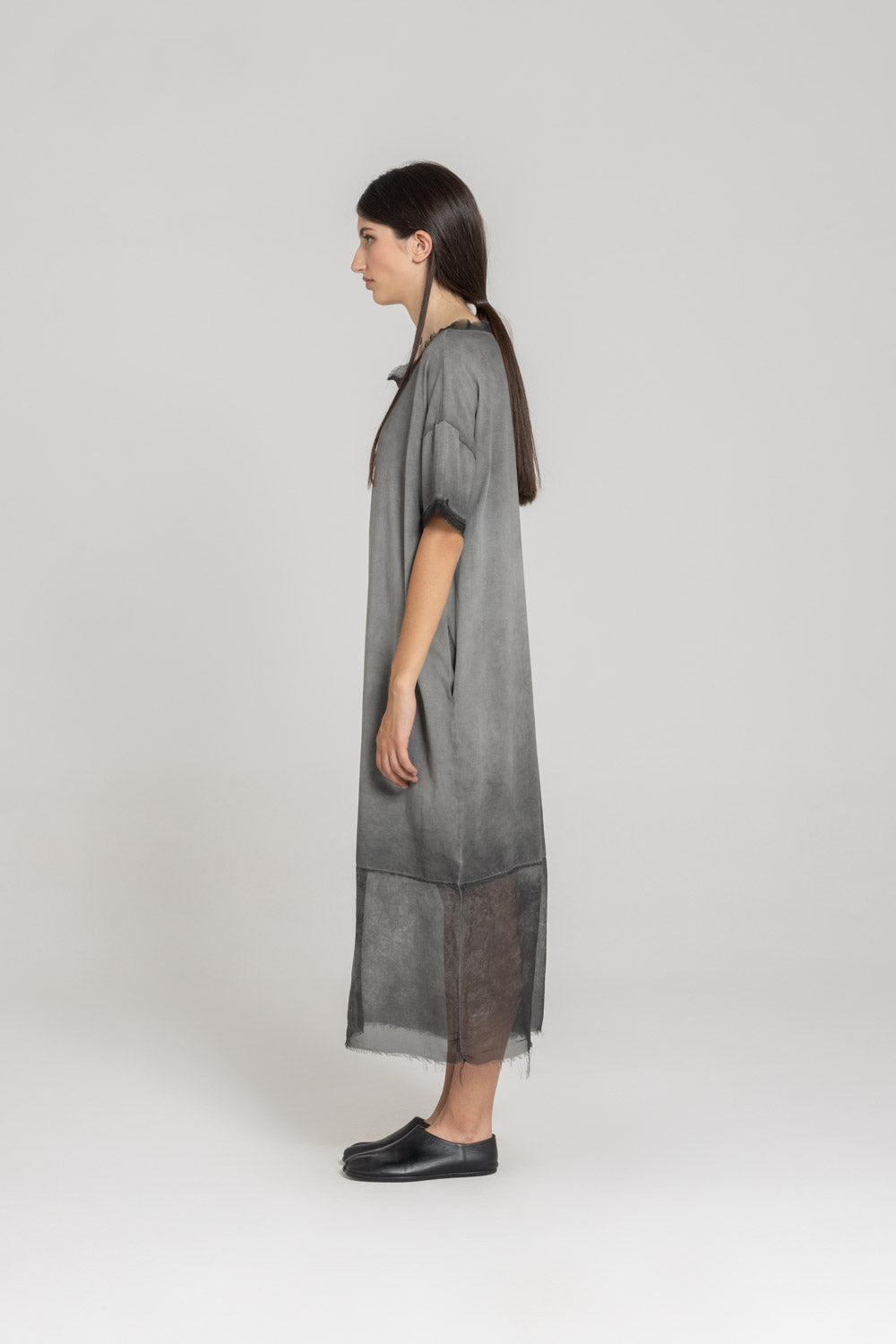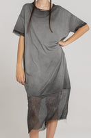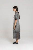 A relaxed-fit dress in a balloon shaping. Features include a round neckline, short sleeves and two side seam pockets. Finished with semi-sheer silk-mix hem details with frayed edges.