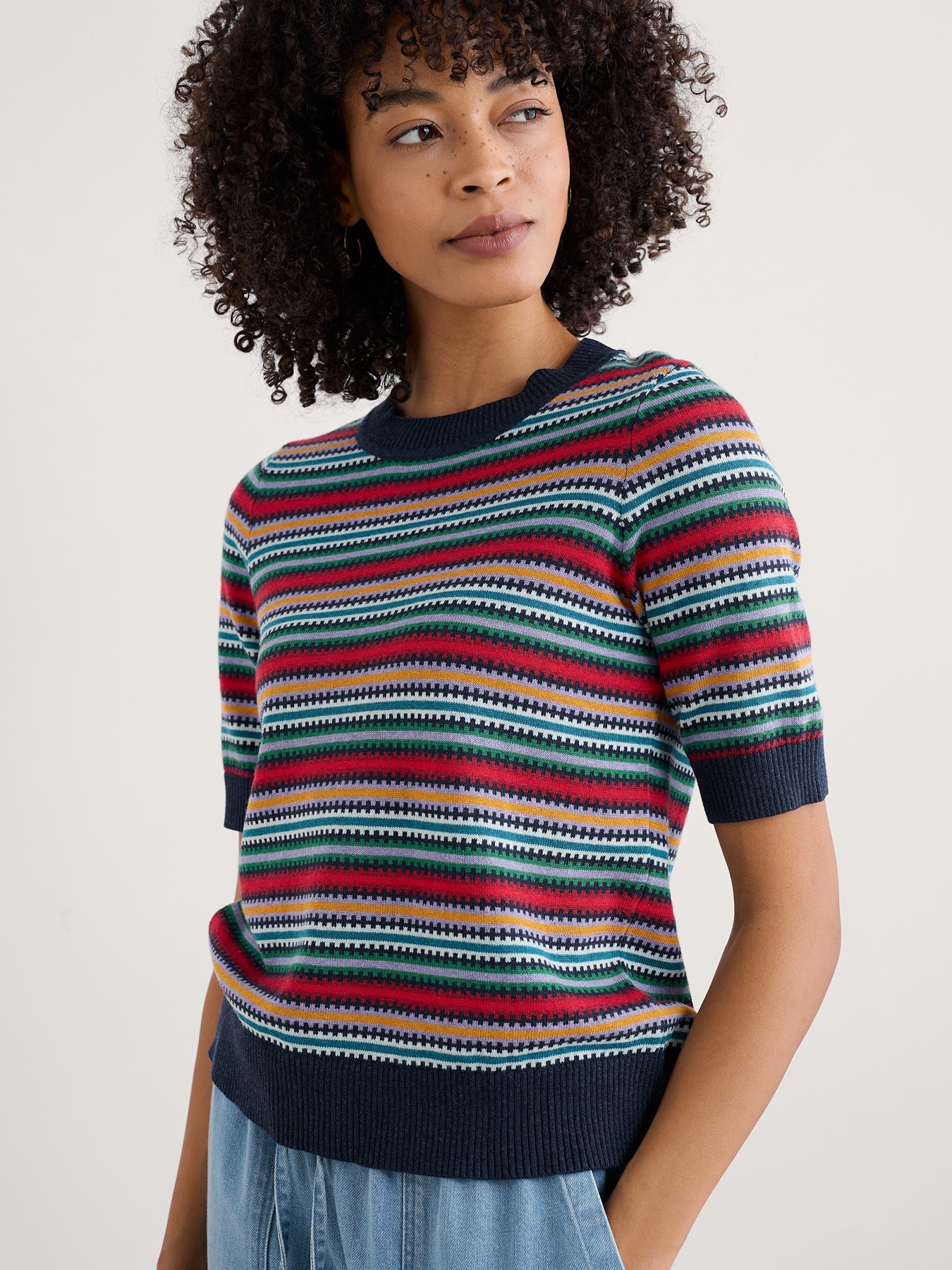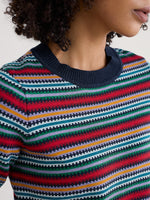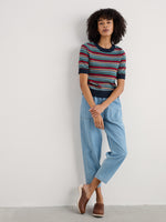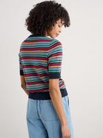 A lightweight knitted top for summer wear and layering. Our Rock Bell top is knitted from soft GOTS-certified organic cotton, in a pattern of vibrant yarn-dyed stripes. The textured stitching gives depth and character to the knit, bringing those seaside-inspired colours to life. It has an easy fit through the body, with slightly loose half sleeves. We've finished it with ribbed trims at the cuffs, hem and round neck.
