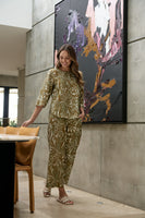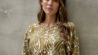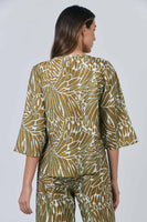Crafted from 100% linen, this printed piece offers a feminine silhouette enhanced by a discreet button closure at the back.