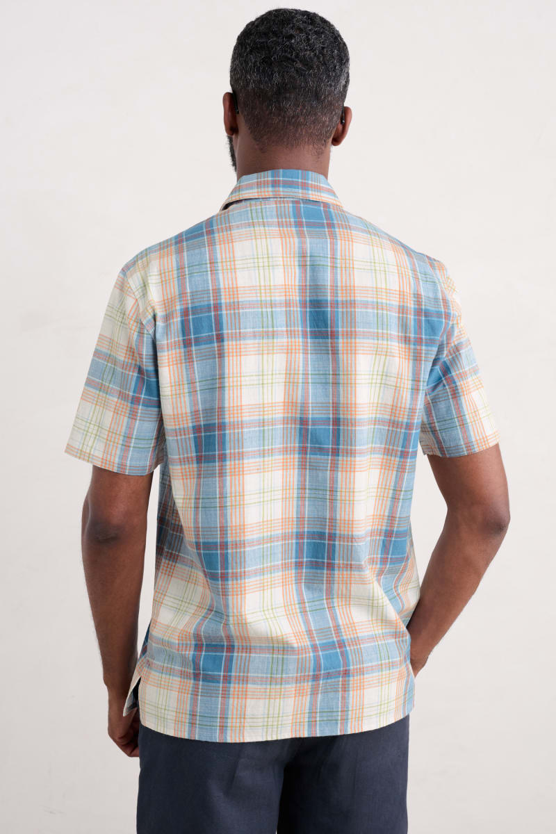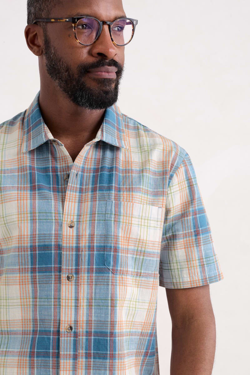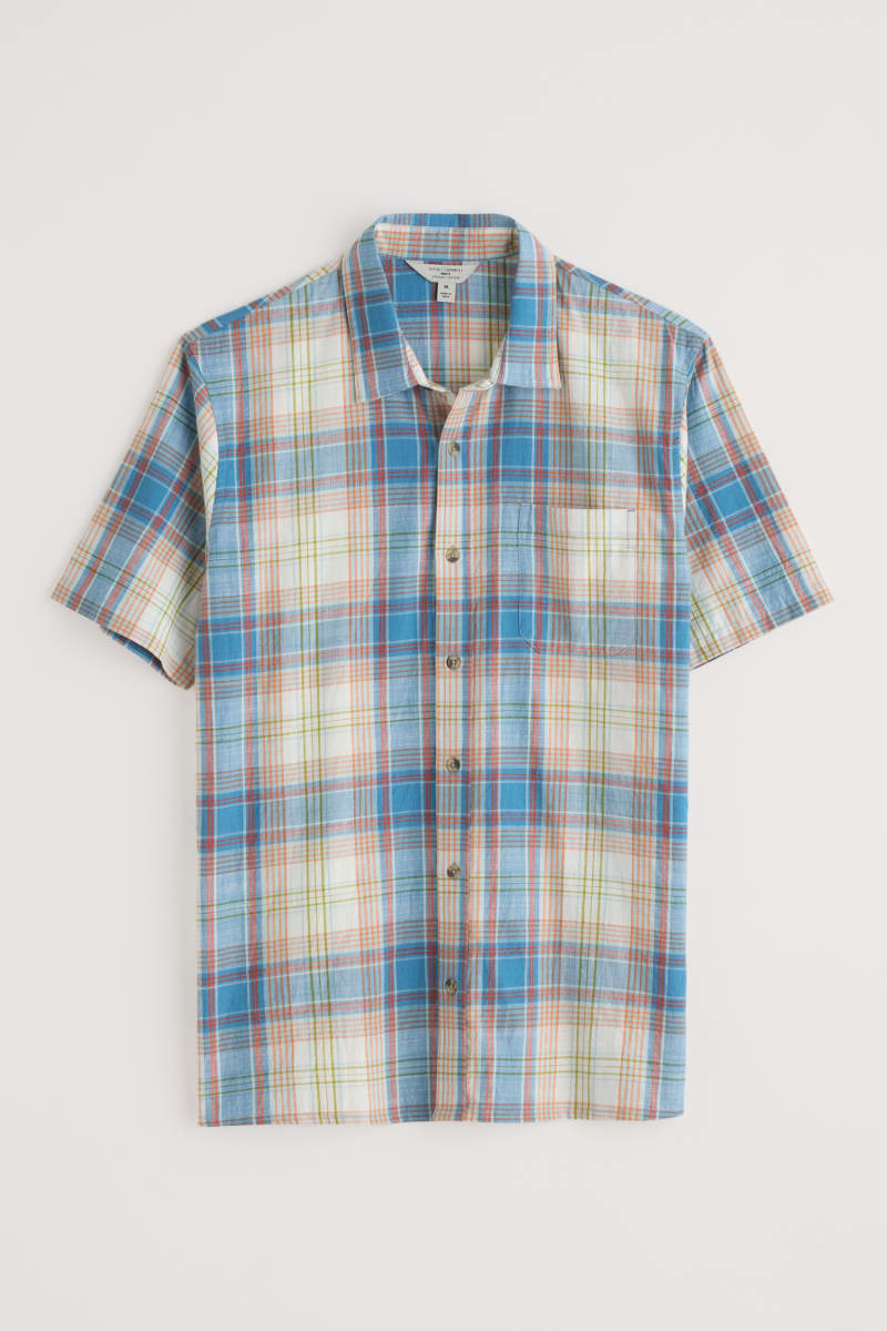 A short sleeve shirt with a tonal pattern in a breathable organic cotton blend. The easy fit and split hem make it great for layering, while a chest pocket adds a classic touch. Wear buttoned up or loose over a T-shirt.