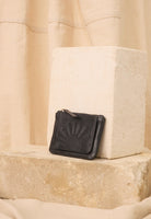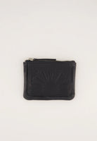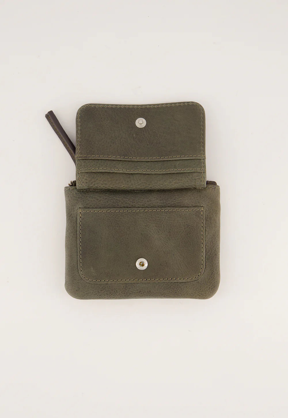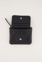 Compact wallet with a top zip, main section for coins, cards, and notes, plus a card flap with a press stud closure and three card slots. Finished with a printed cotton lining.