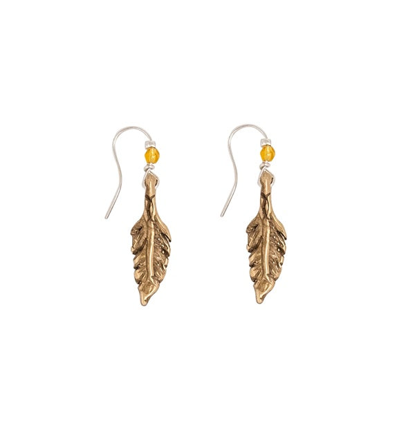 The Piuma - Feather Earrings are made from handcast bronze, with a tiny glass bead and surgical steel threads.