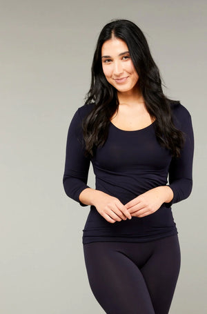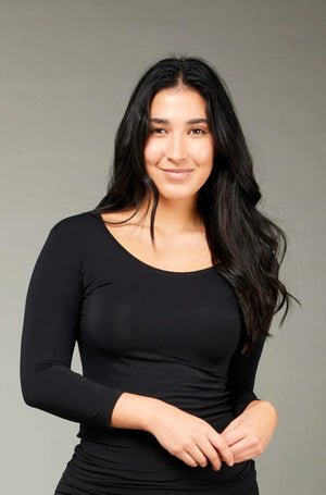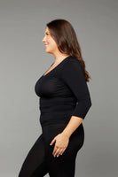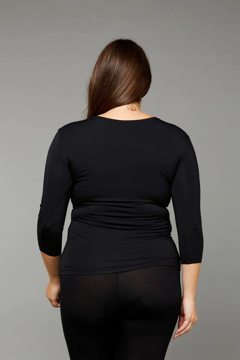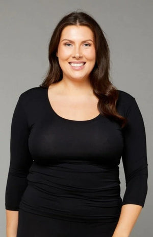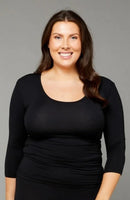 Designed as a second skin, this top has a scoop neckline and 3/4 sleeve.