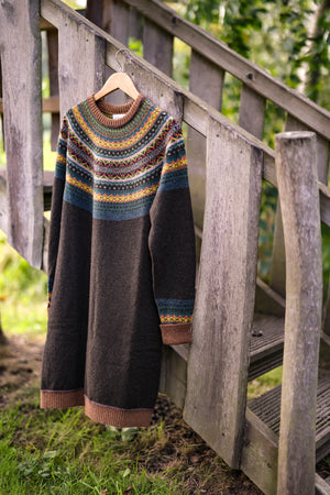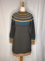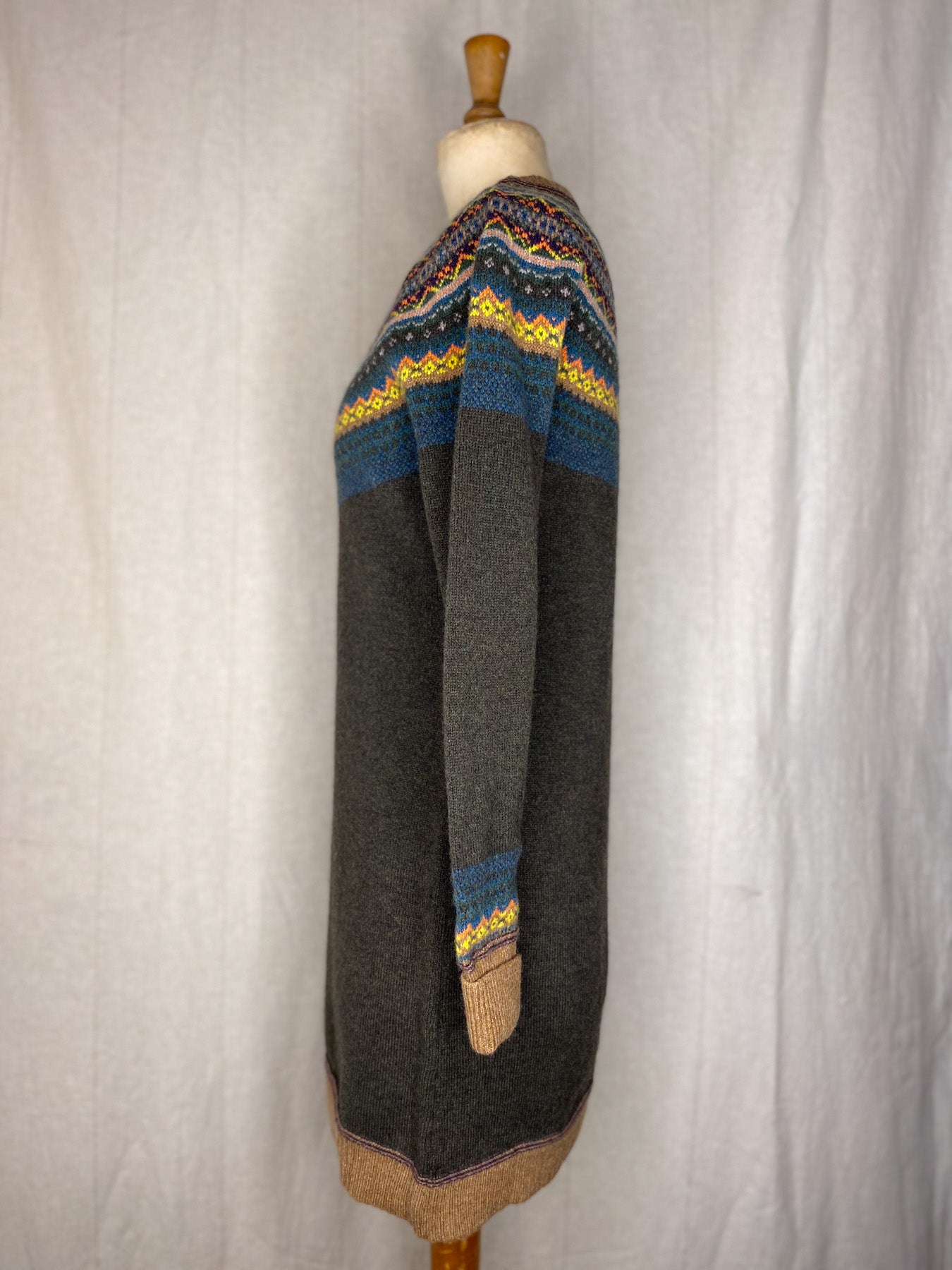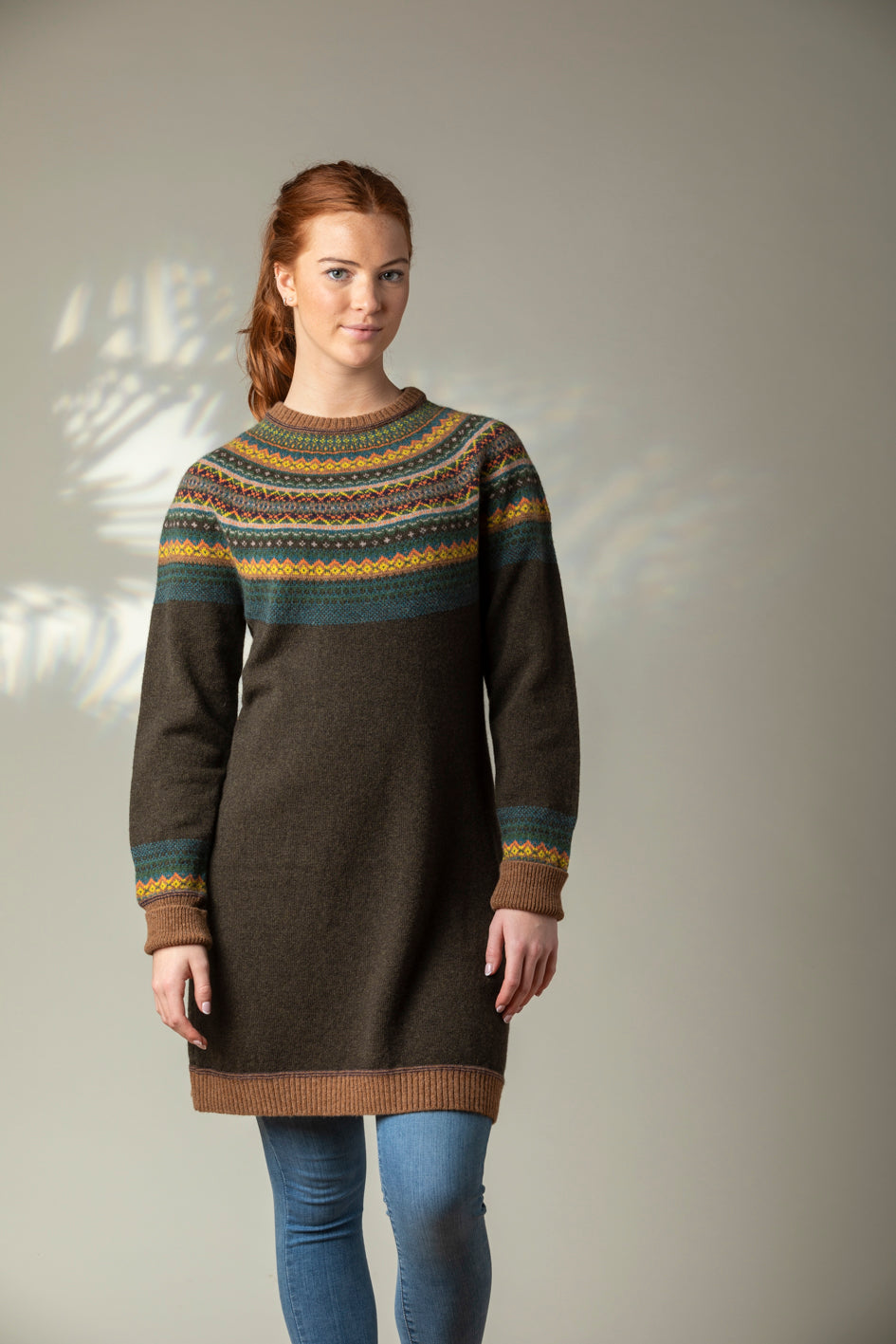 Unlike the classic 'Alpine' styles, this Alpine dress does not feature angora yarn in the Fairisle pattern.