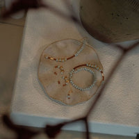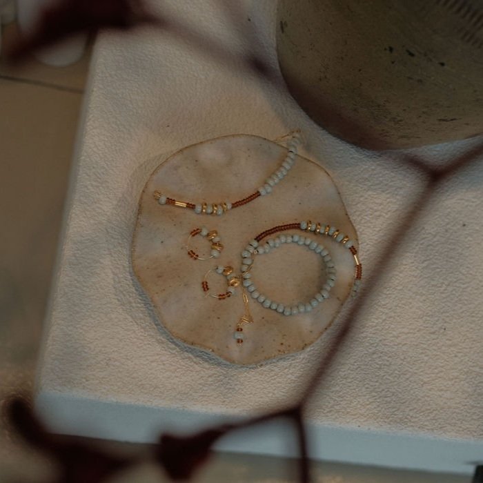Incorporating the beautiful handmade ceramic aqua beads that have been a favourite in Ochre’s previous jewellery collection, paired with chestnut glass beads and (AND!!!) 24ct gold luster ceramic beads!!! This beautiful necklace has an overall length of roughly 50cm, however the length is adjustable as the gold clip can be fastened into any of the chain links. This necklace is truly one of a kind, and beautiful in every way.