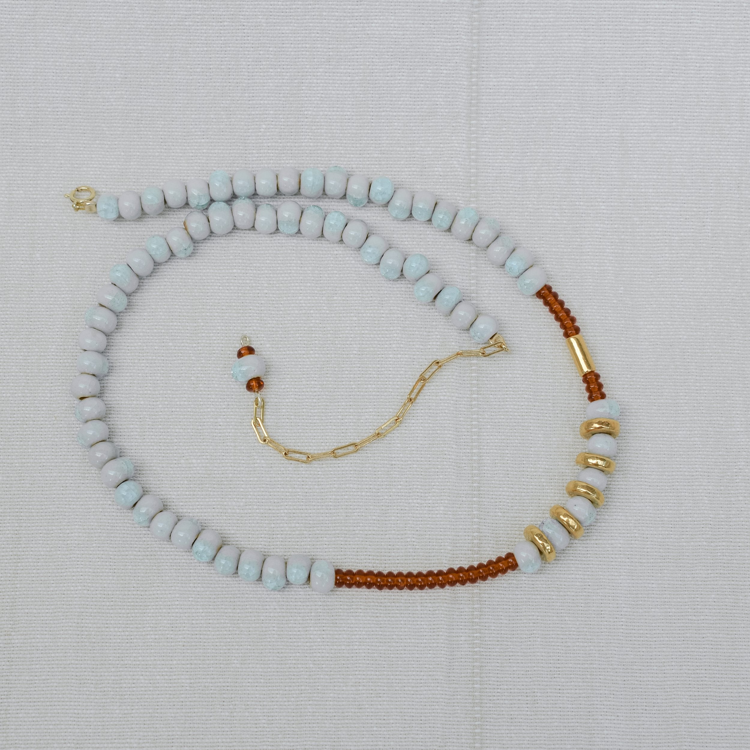 This necklace details small soft blue ceramic beads paired with chestnut glass beads and (AND!!!) 24ct gold luster ceramic beads.