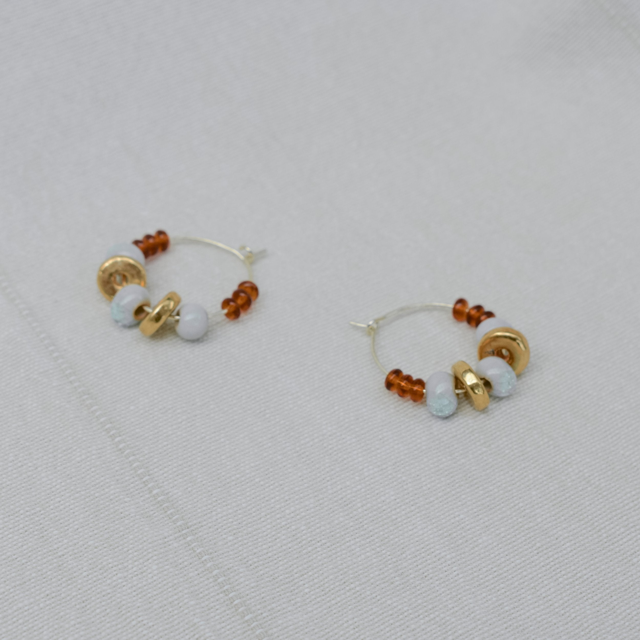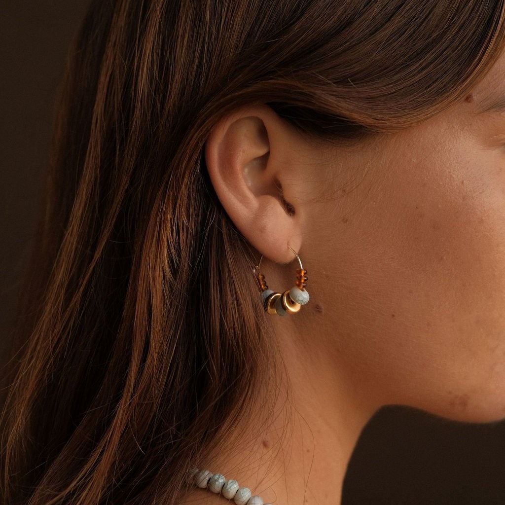 Incorporating the beautiful handmade ceramic aqua beads that have been a favourite in Ochre’s previous jewellery collection, paired with chestnut glass beads and (AND!!!) 24ct gold luster ceramic beads!!! Making these hoop earrings an elegant statement piece.