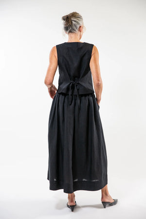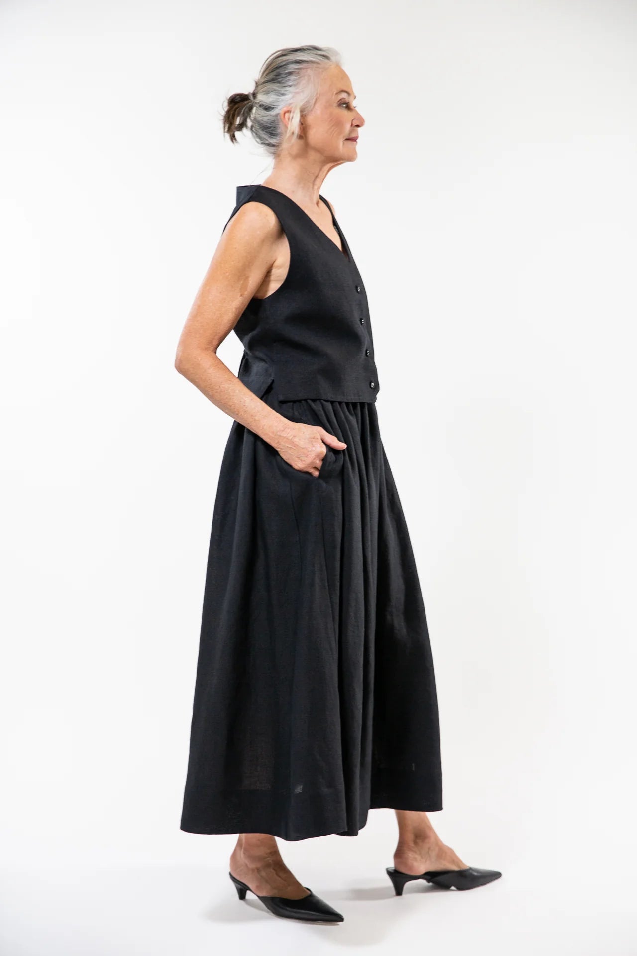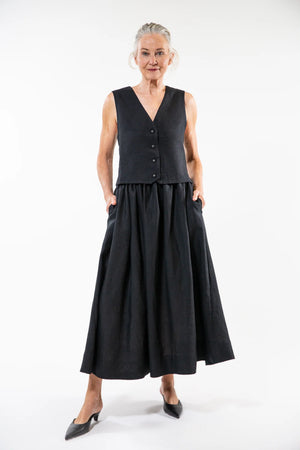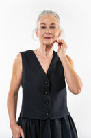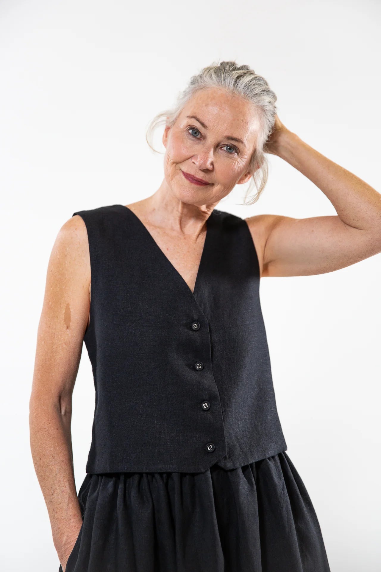From Eva's Sunday Essentials Collection, the Archie Vest is based on a traditional men's classic button-through vest. It is sleeveless and cropped at waist-length. Archie is a great layer over a classic shirt. Alternatively, button it up and wear it as a sleeveless v-neck top. This vest features four self-covered buttons, 5cm side slits and a straight front hemline. An encased drawstring at the back of the vest may be gathered in or worn untied.