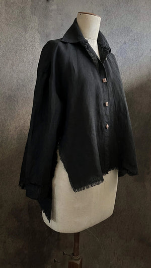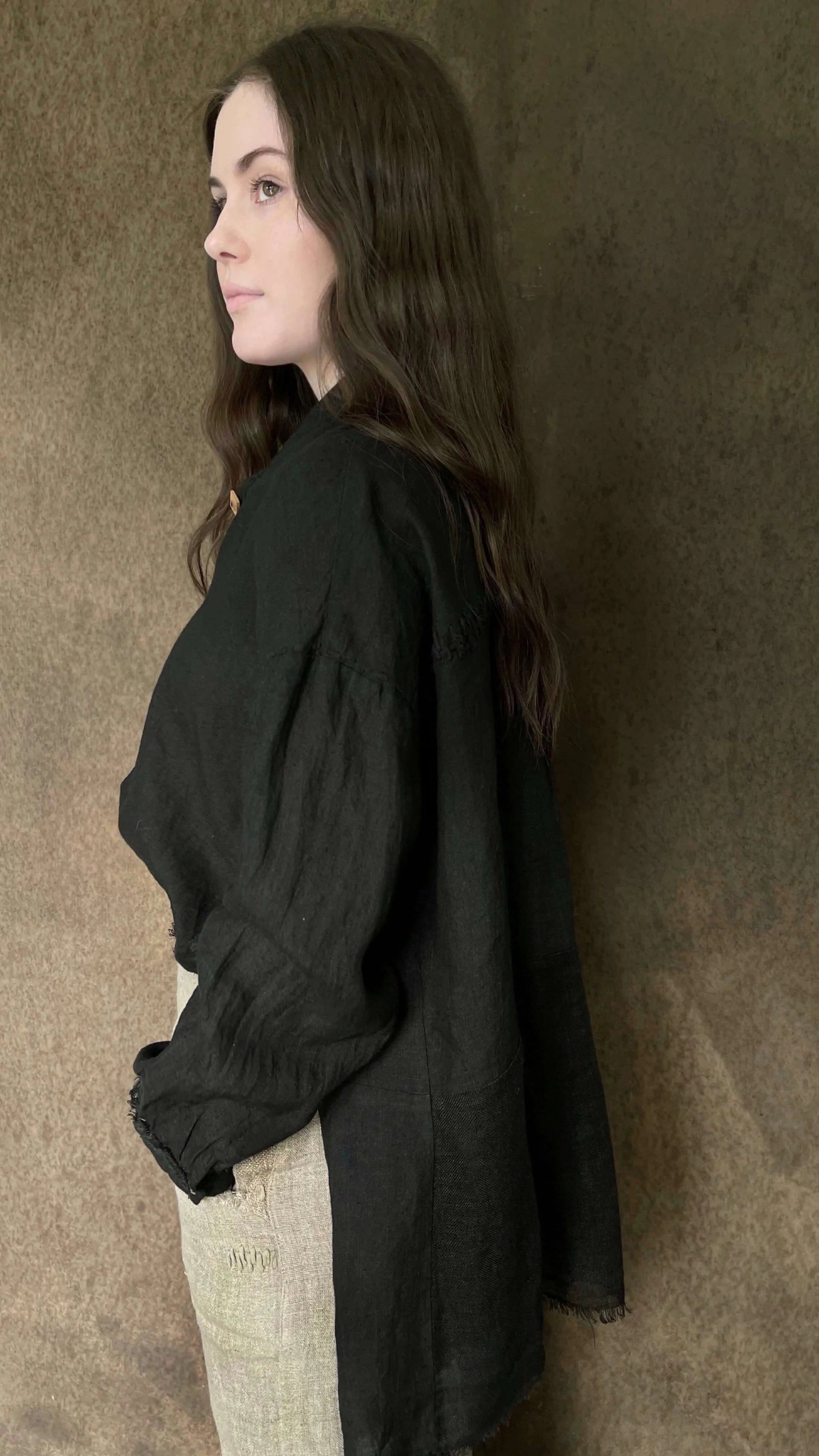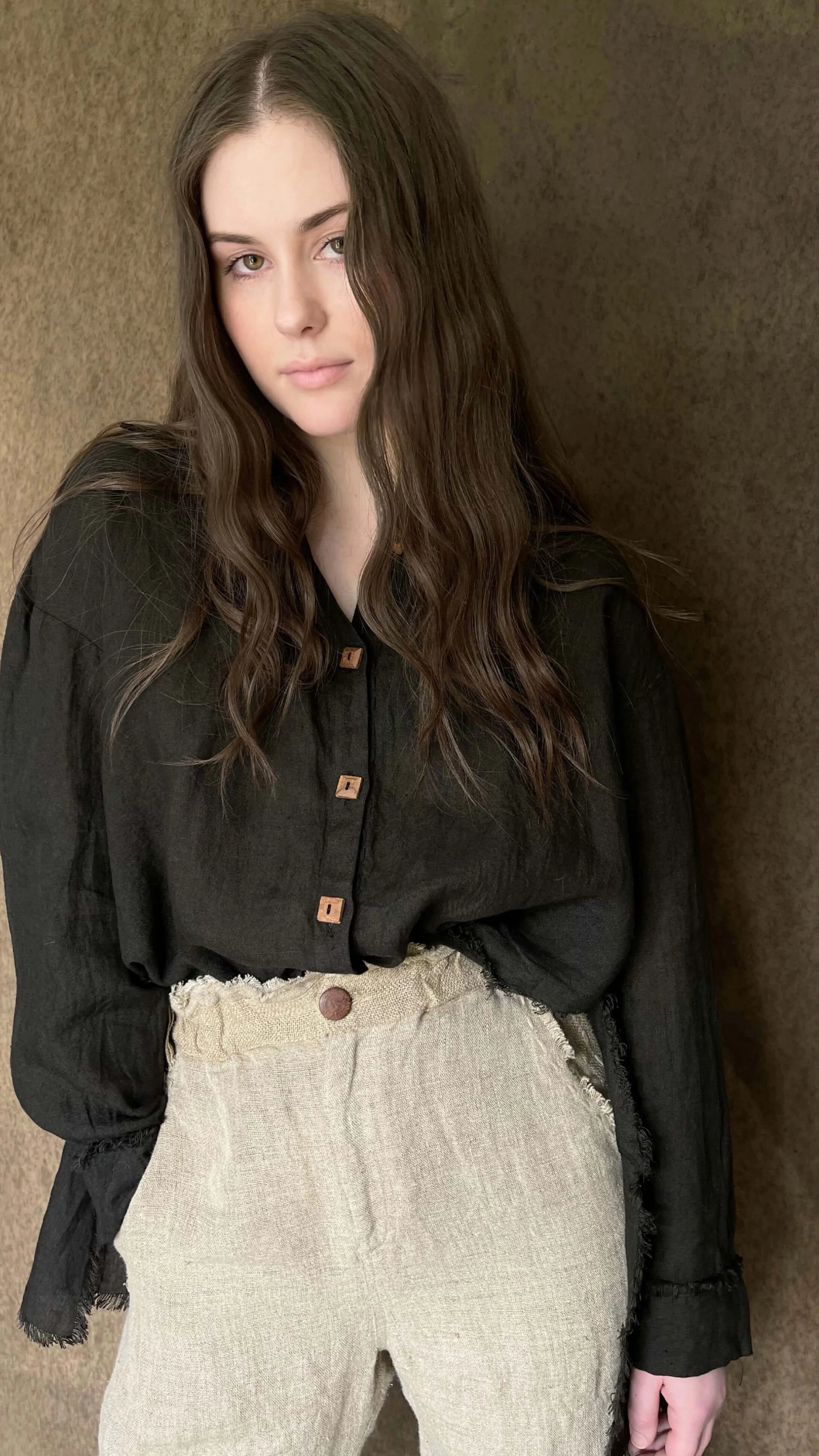 THe Berlin Shirt is a classic button front linen shirt, with eco-wooden buttons, and raw edge detailing.