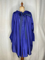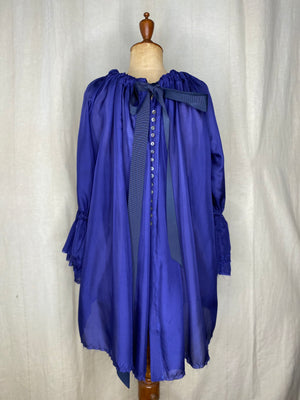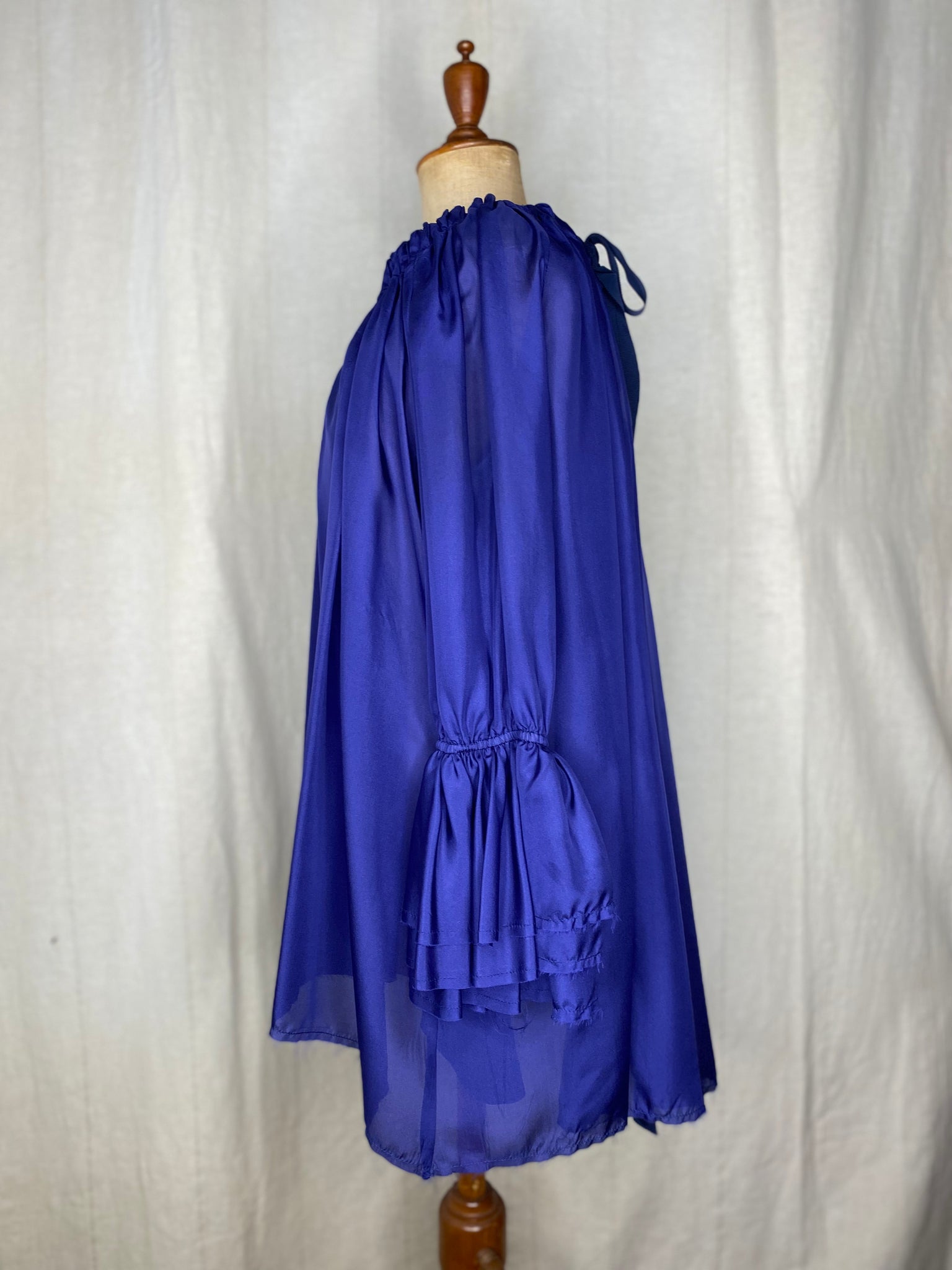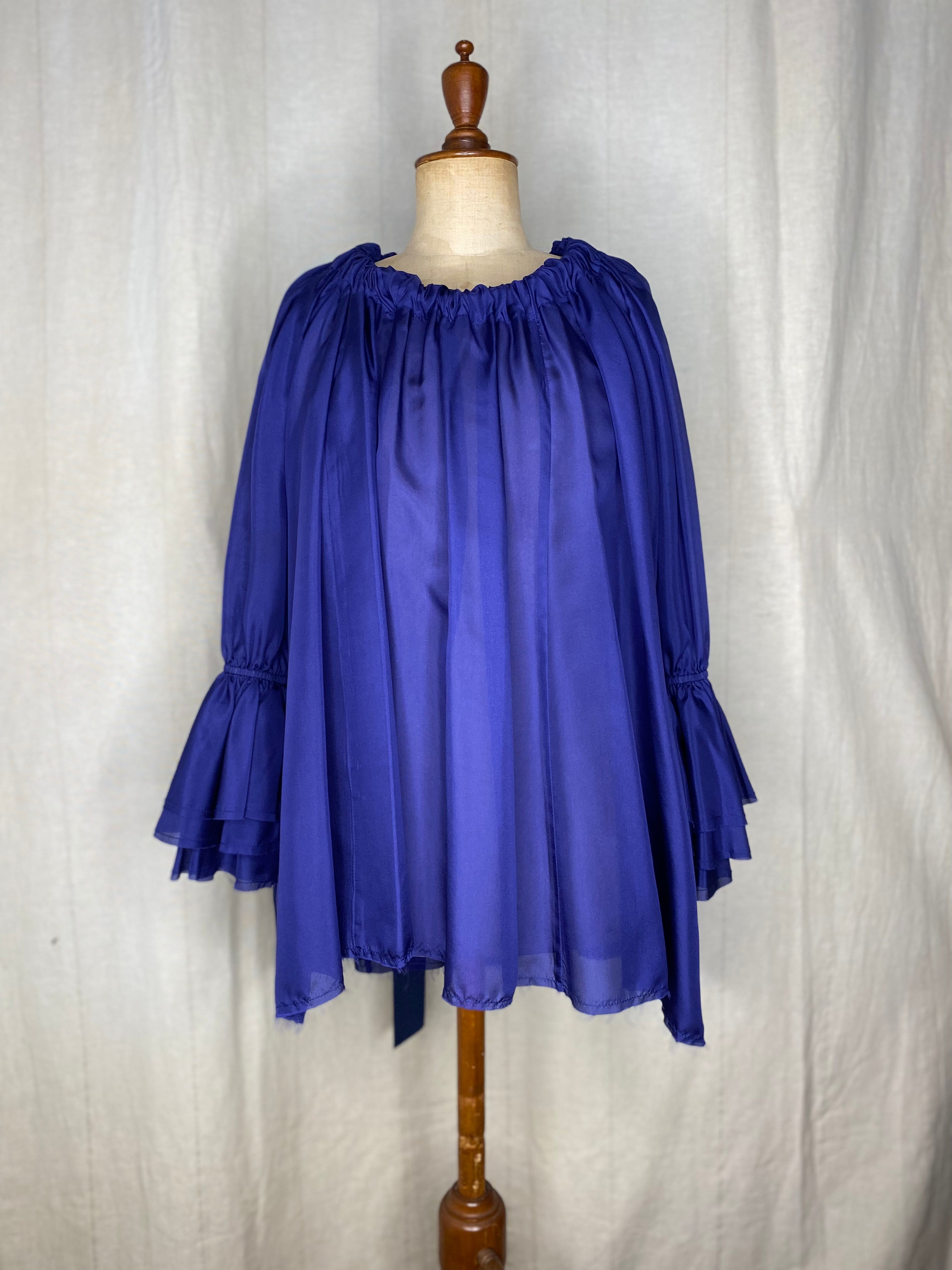 It features a raglan sleeve and cuff ruffles with elastic gather.
