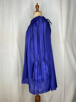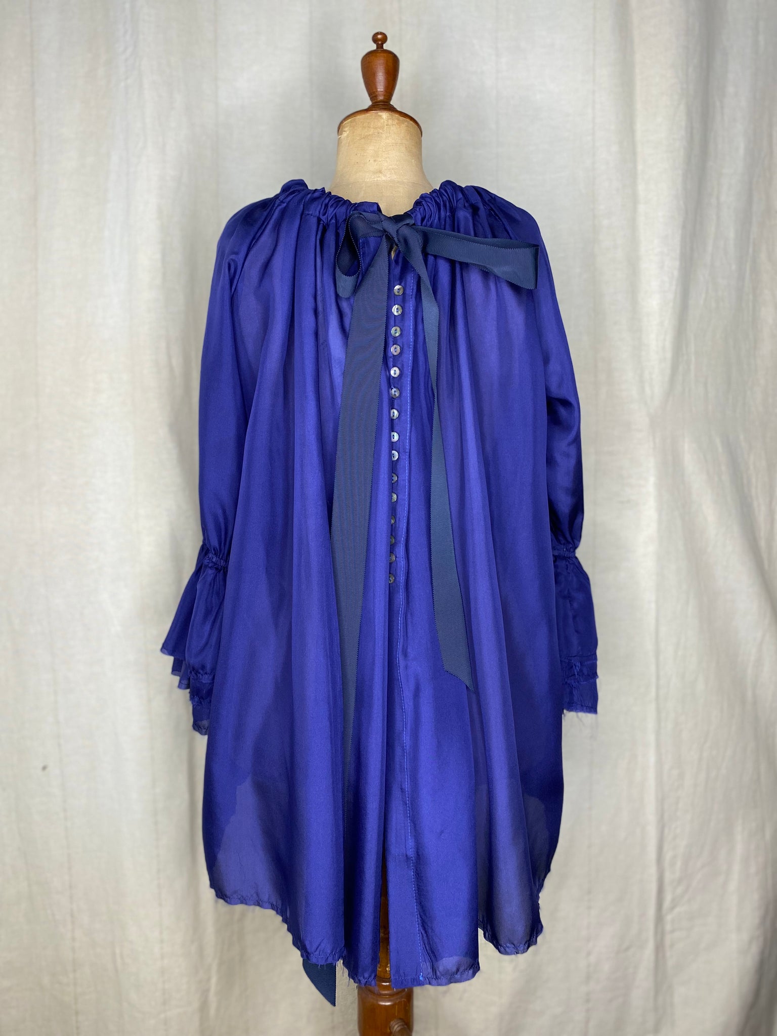 The Amano blouson top has a self gathering tie around the neck line and shell buttons down centre back .
