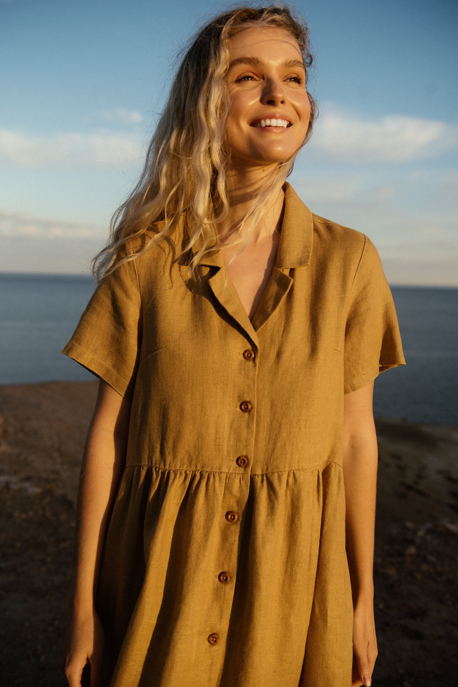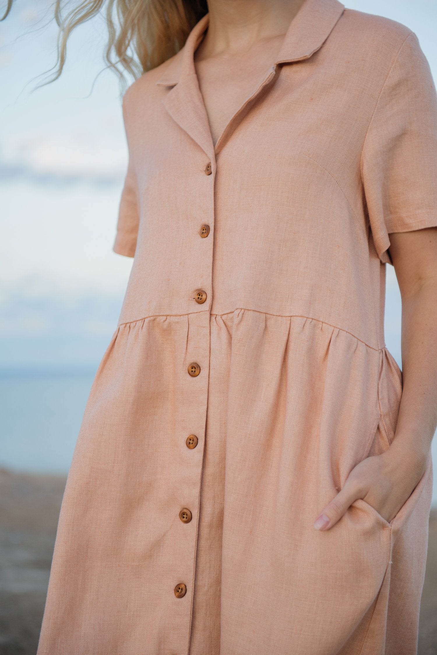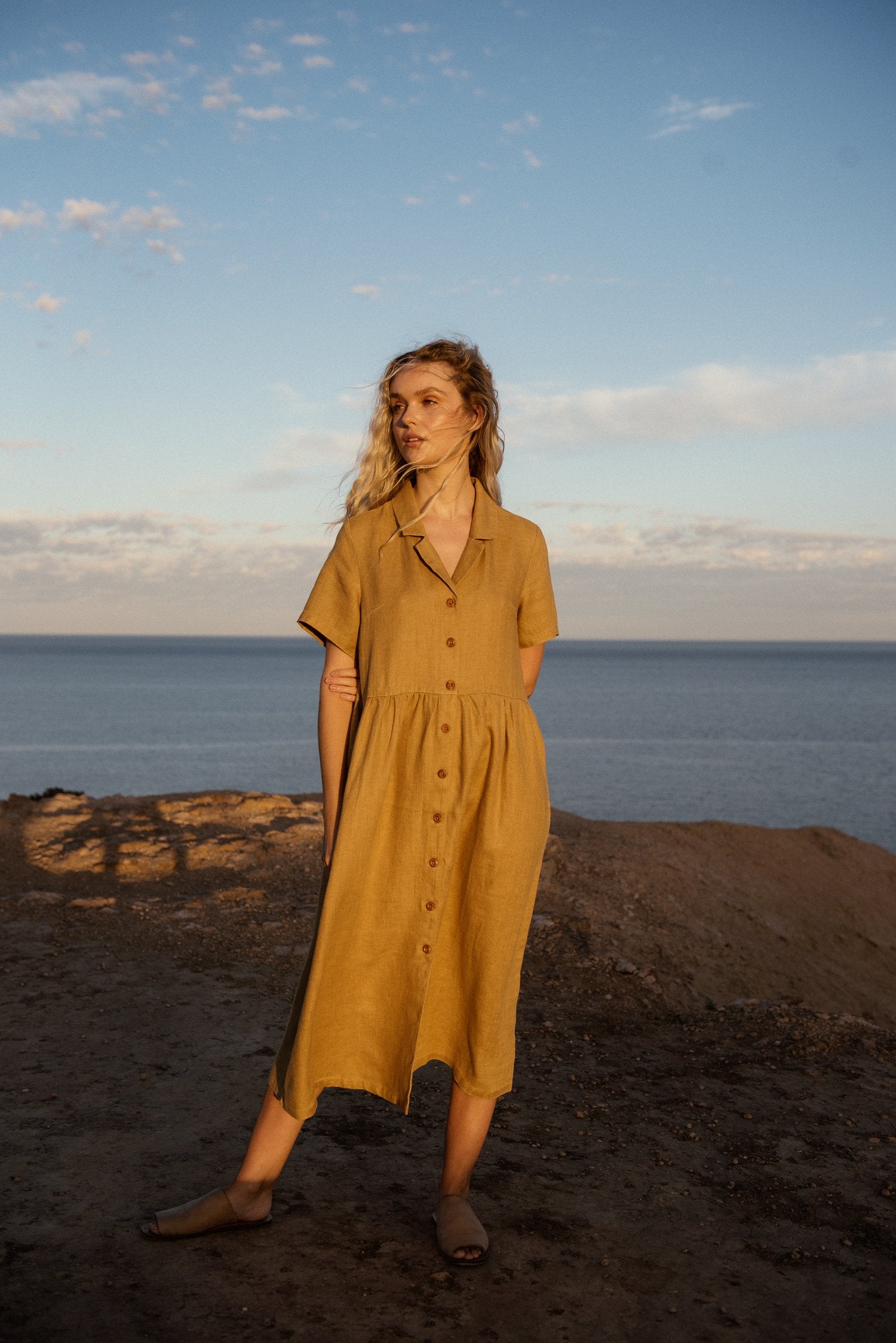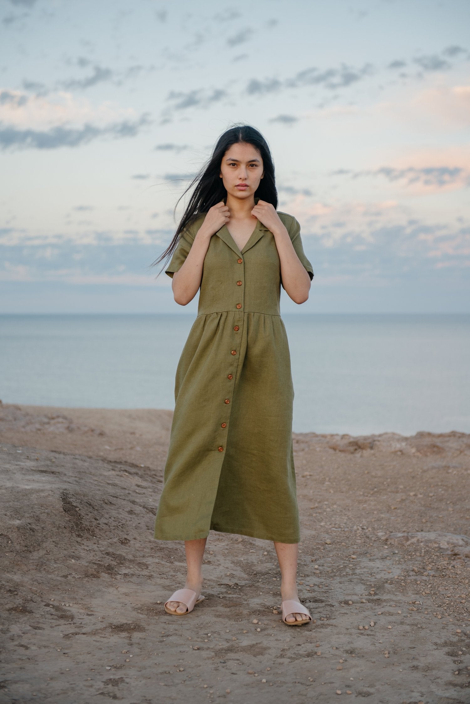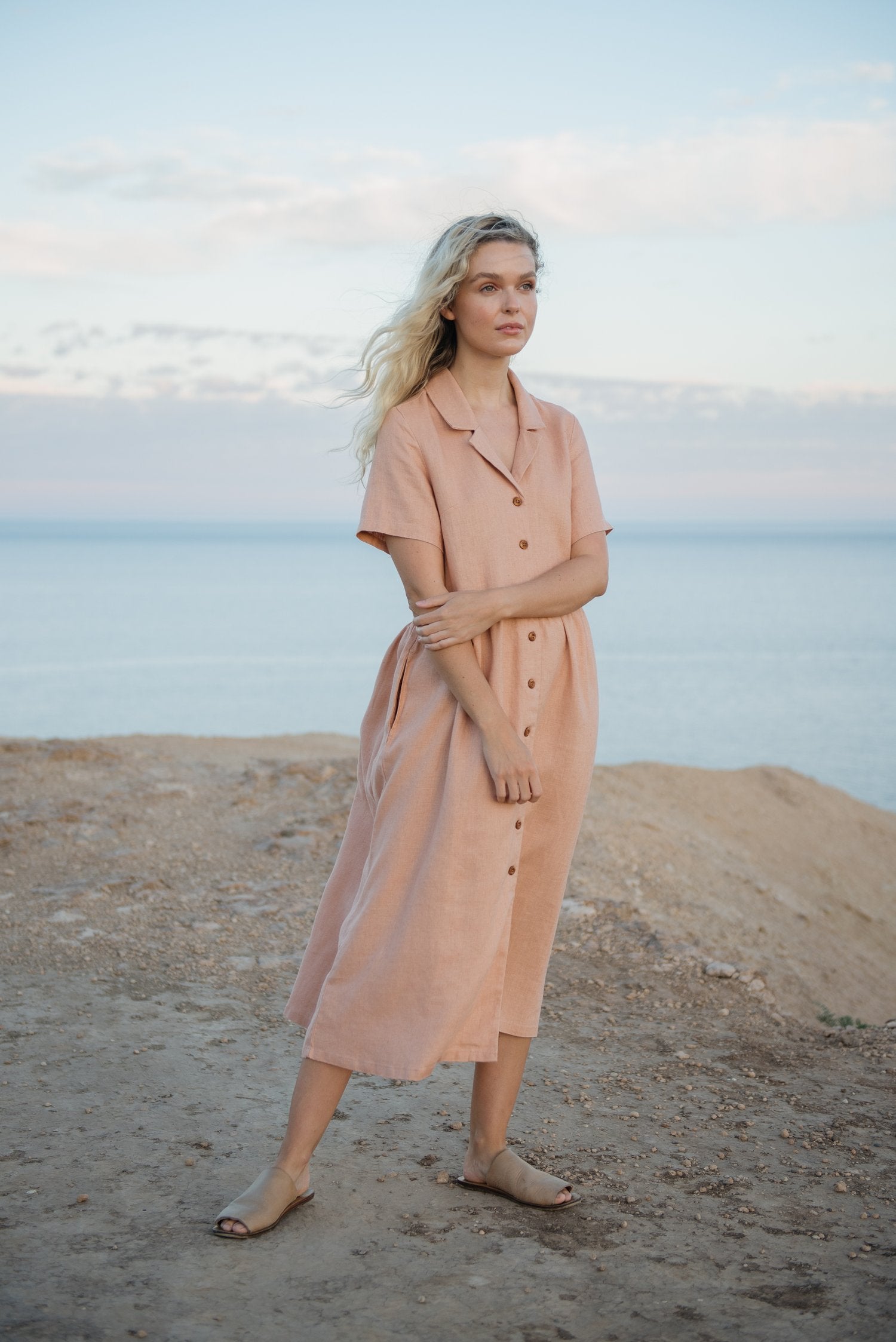 The button-front Day Dress is an effortless essential. The relaxed, midi silhouette in our luxe 100% hemp fabric creates a dress of refined simplicity. Featuring a revere collar neckline, side seam pockets and a button down front with signature wooden buttons.