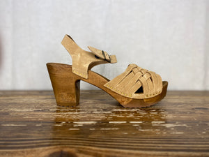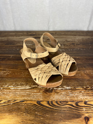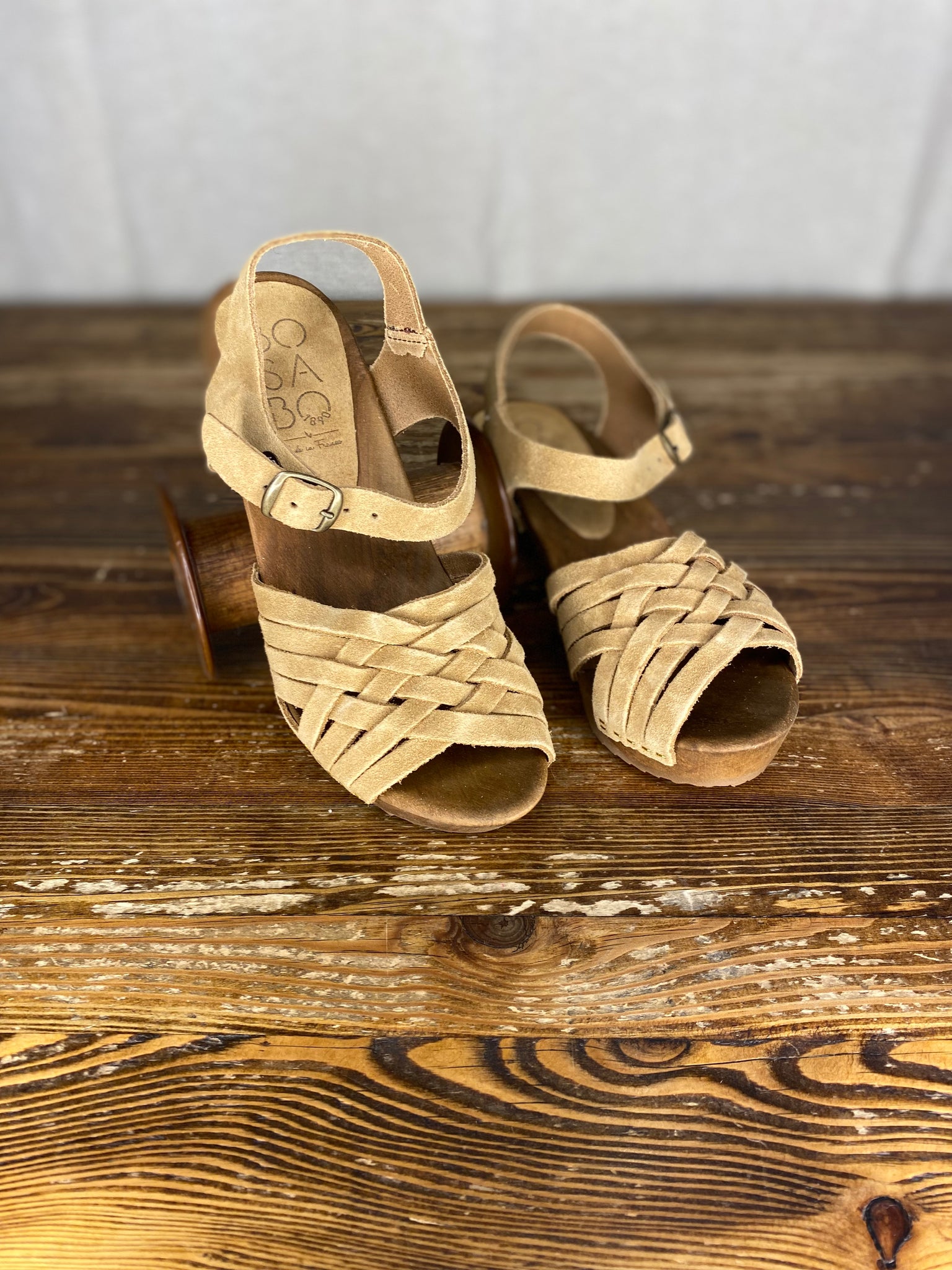 Featuring moderate heel, a multi strapped front, open toe and ankle strap. The main shoe is made from vegetable tanned suede and these comfortable clogs have been made to order, just for From Dust.
