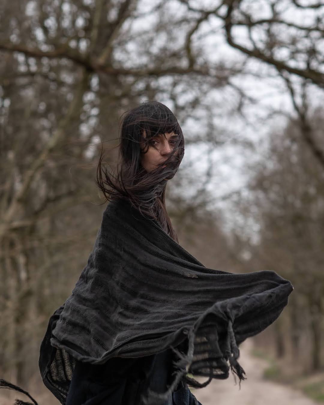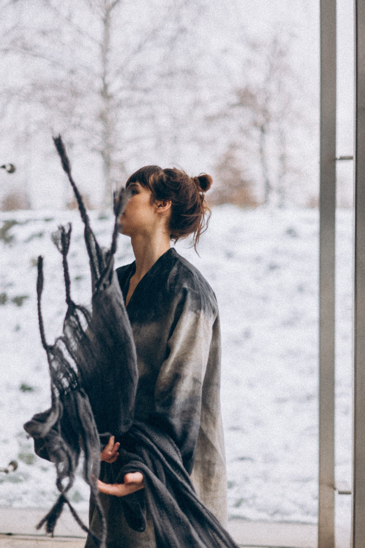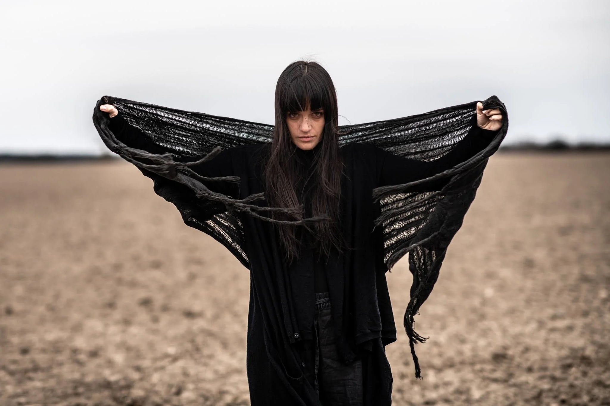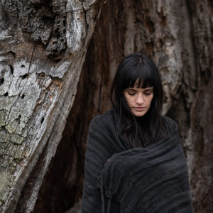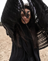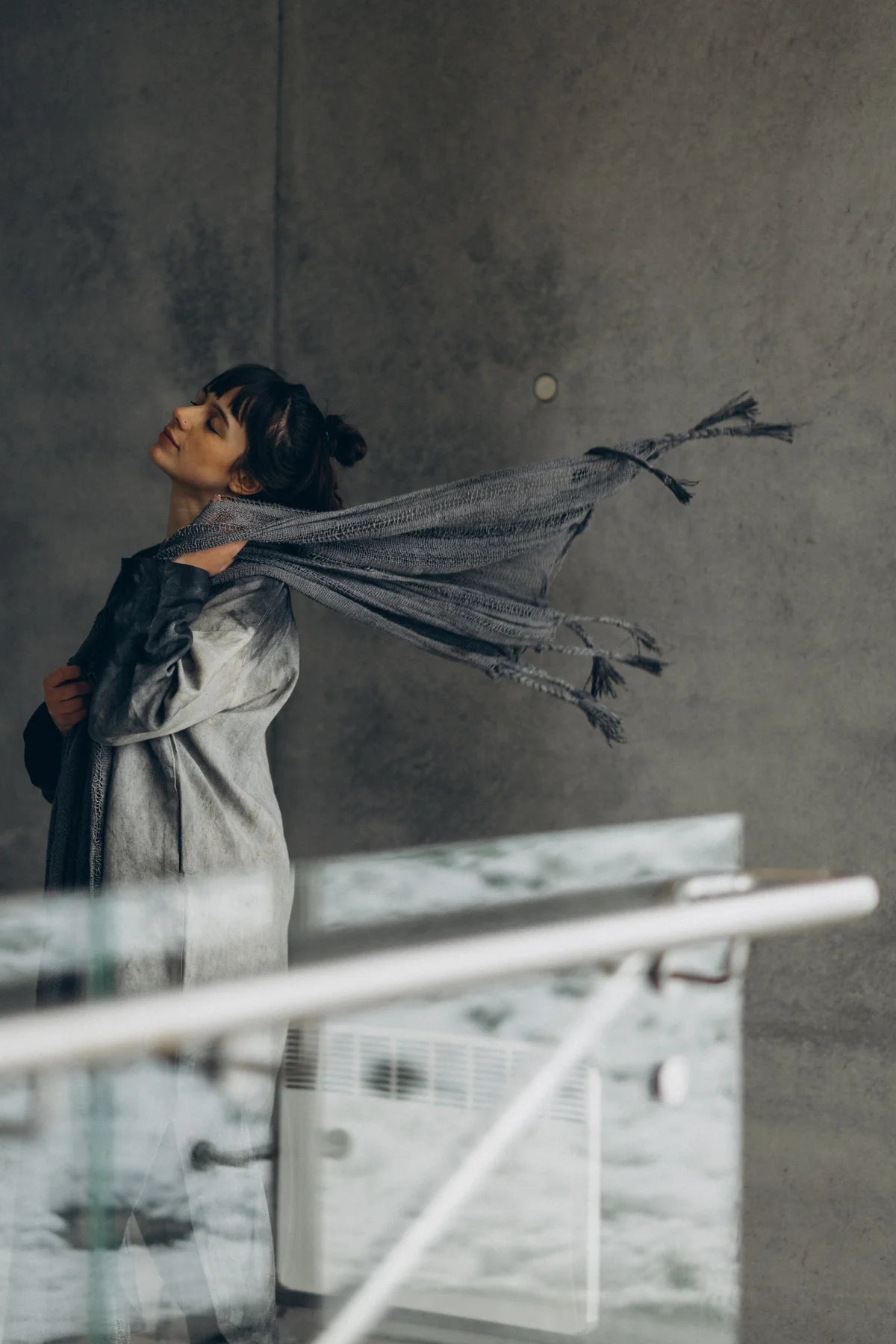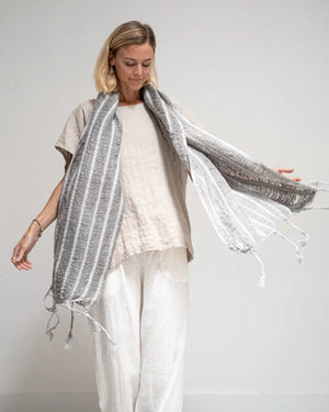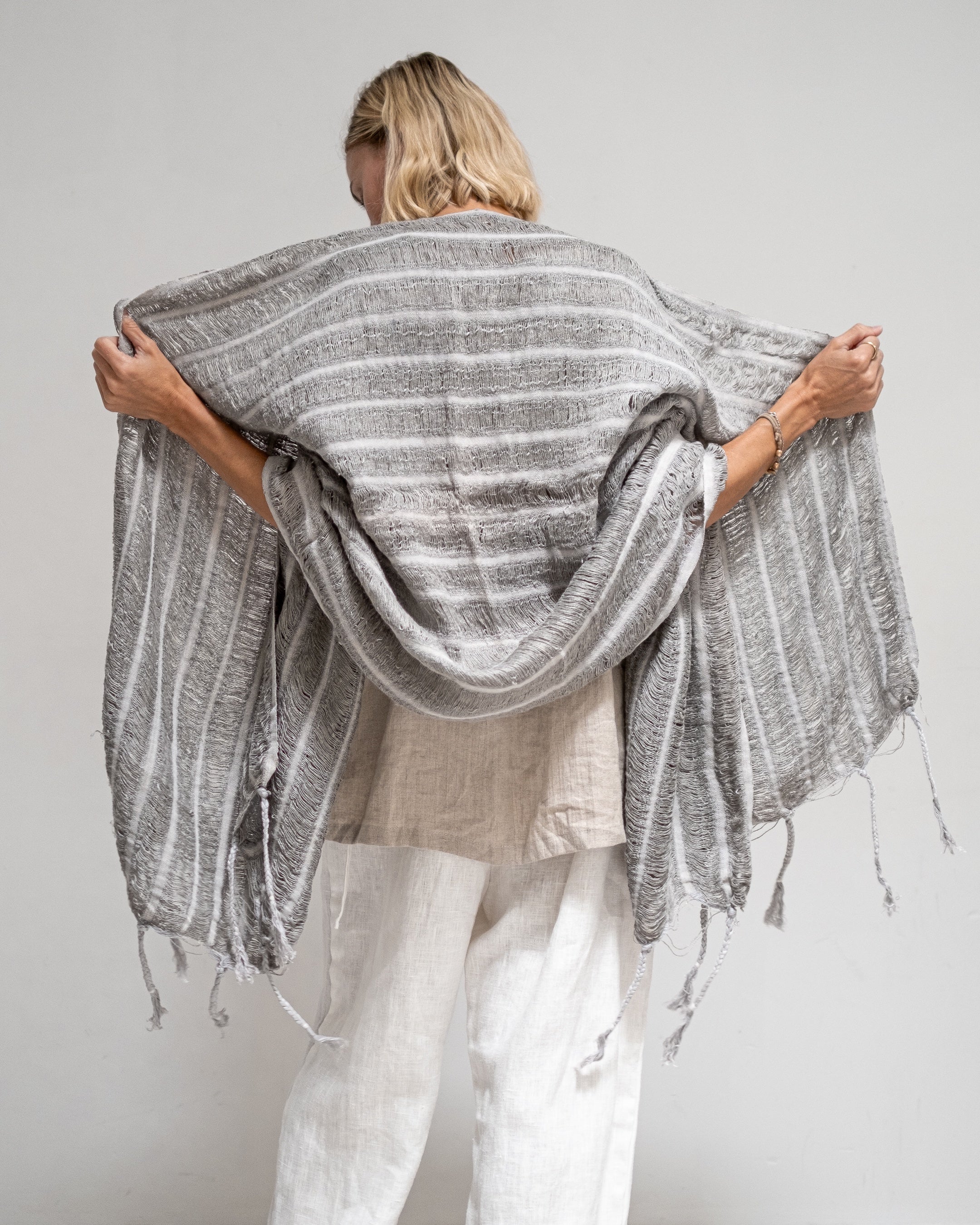 The Dorota Shawl has been hand woven and features intricate weaving.