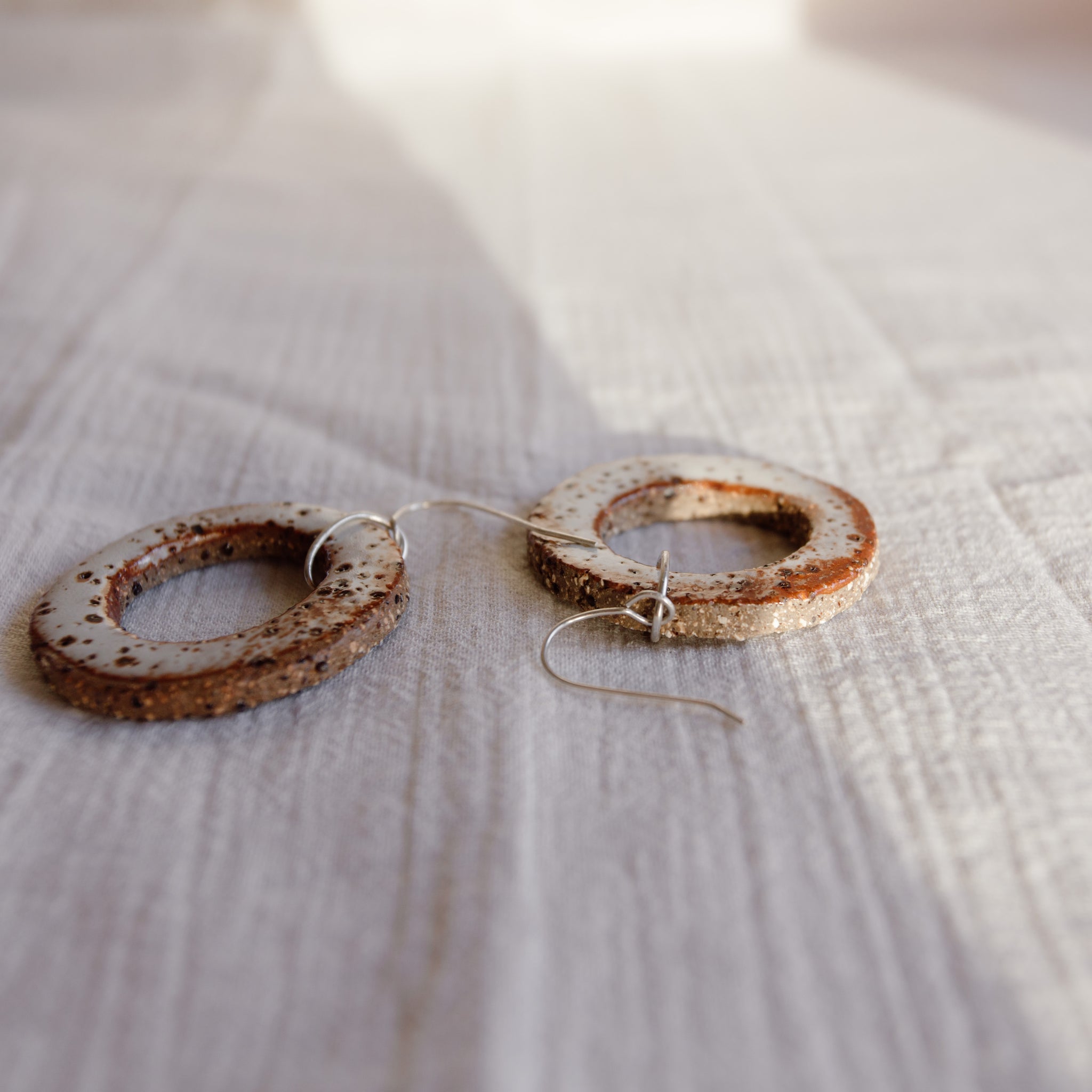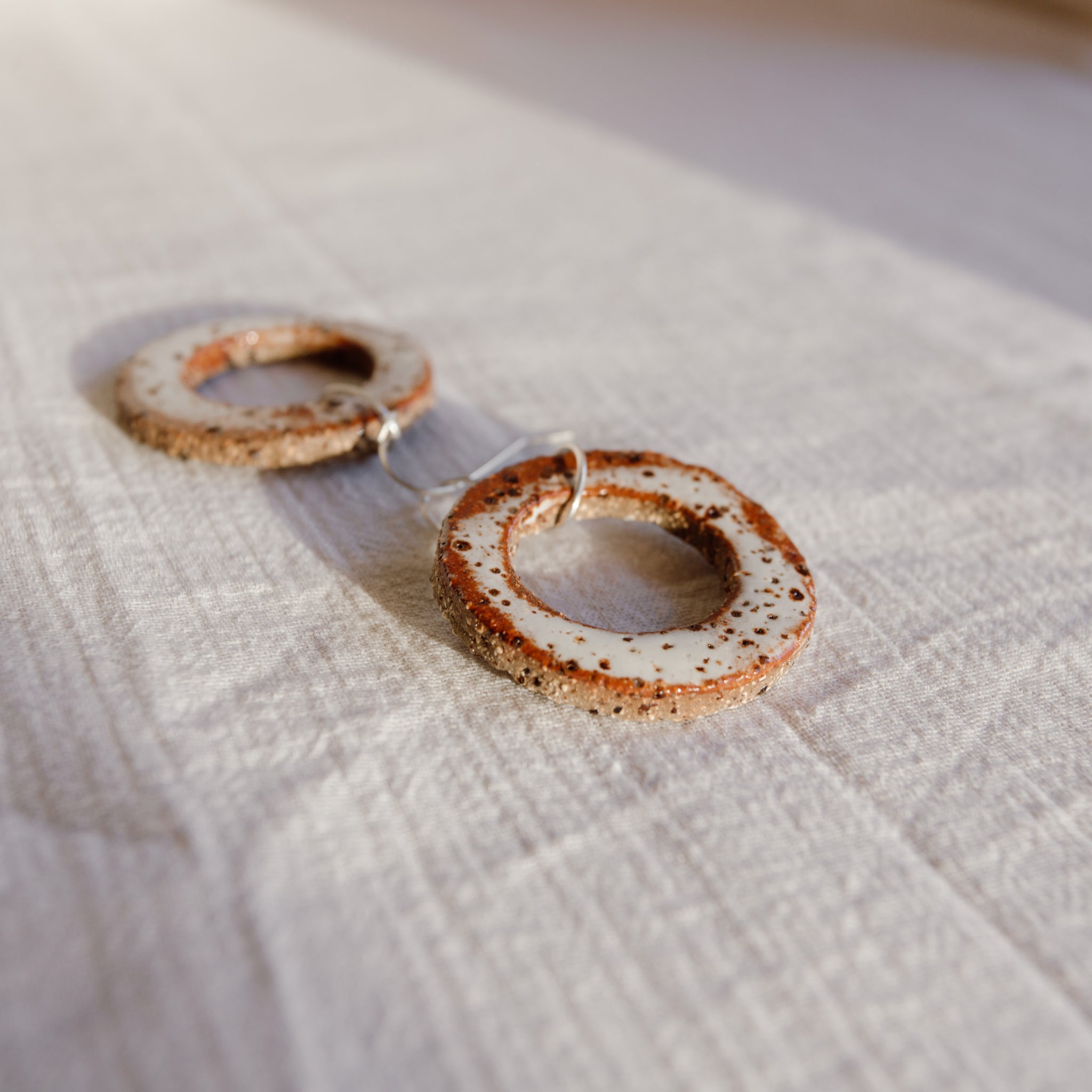 This glaze and clay really speak for themselves, earthy, raw, and beautiful in every way. These simple hoops are inspired by Australia's red, dusty central core. Elegantly finished with handmade sterling silver hooks. Glazed with an iron rich glaze, for unique colouration, alway slightly changing due to application and firing temperature.