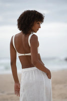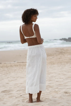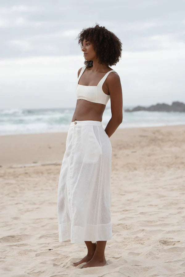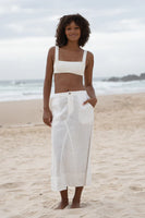 A-line midi skirt∙ Denim skirt inspired design∙ Front zipper∙ Side pockets∙ Elasticated back waistband∙ French seam