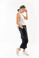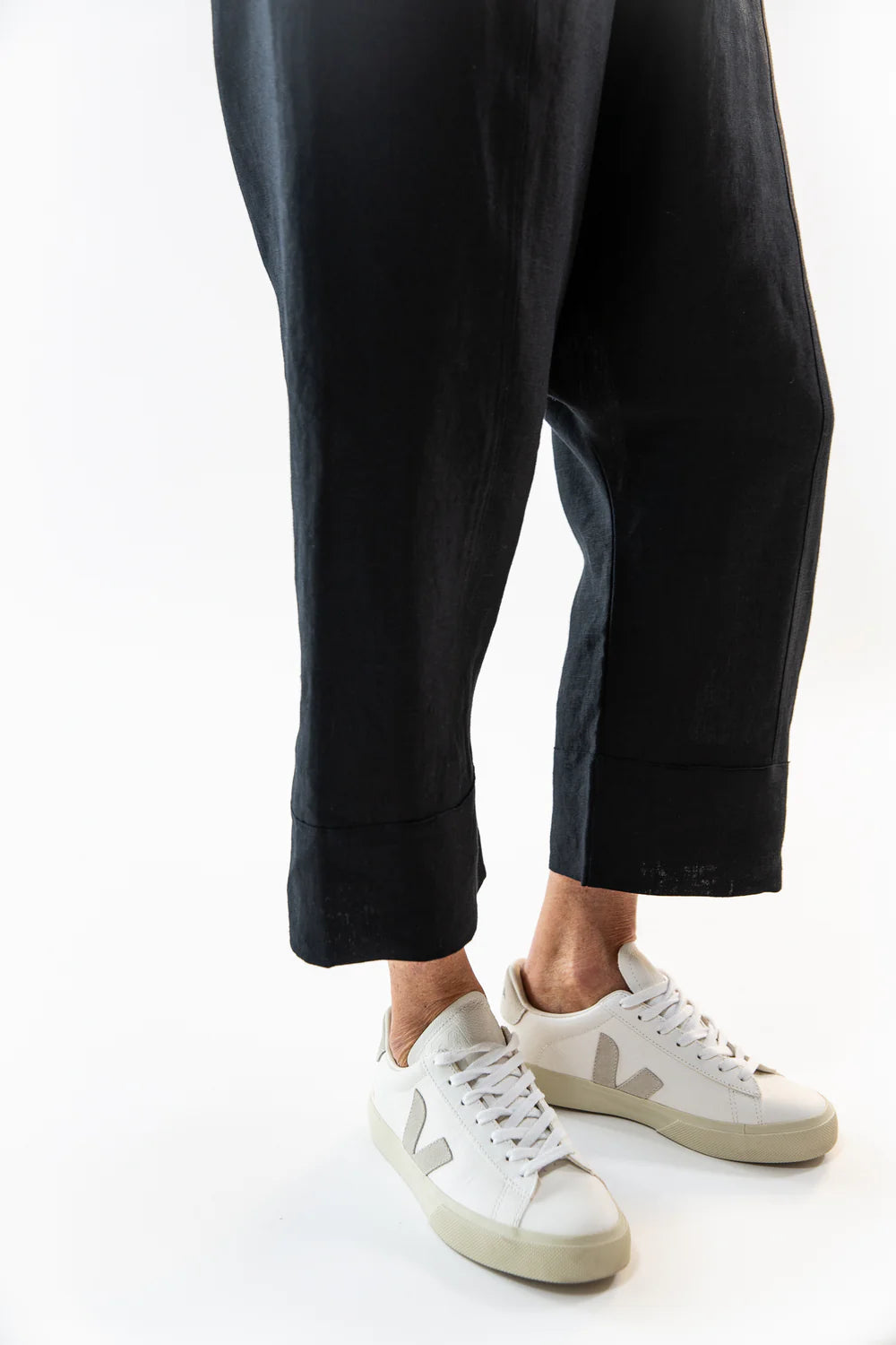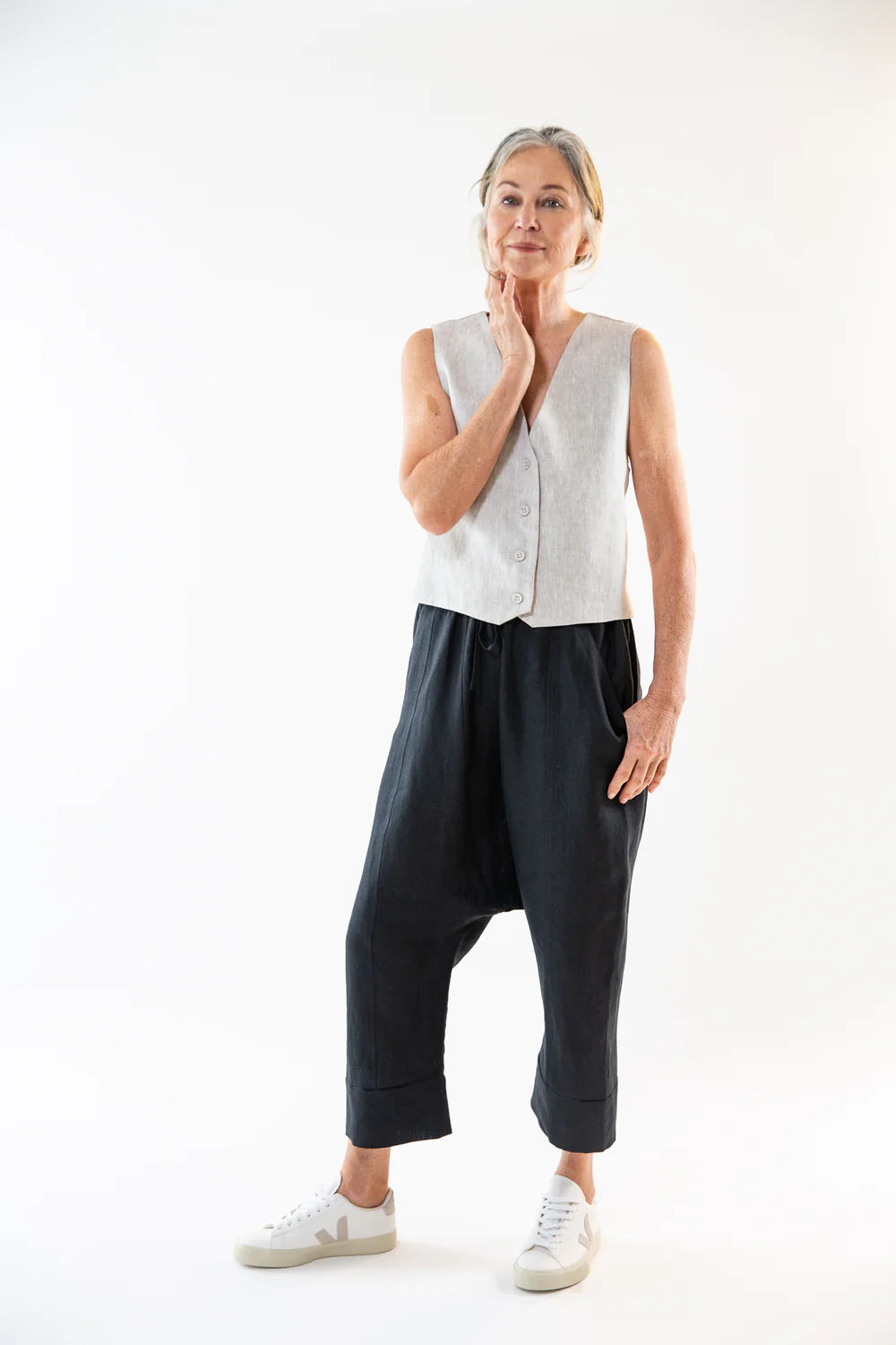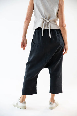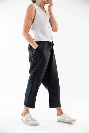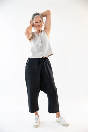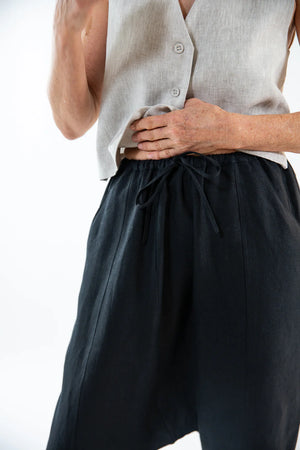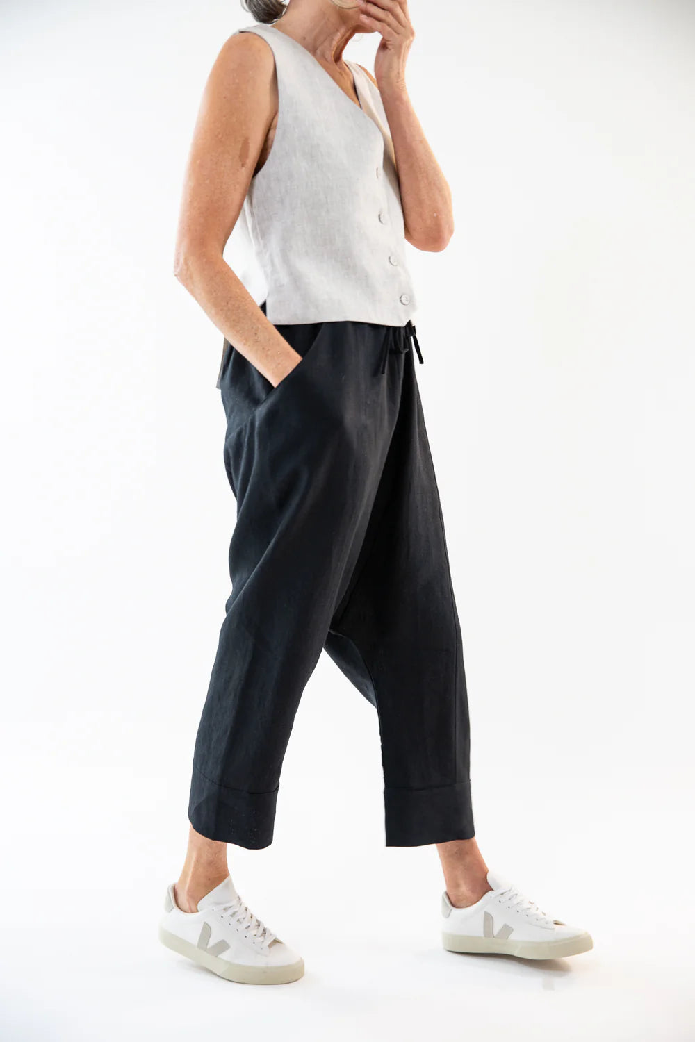 From Eva's Sunday Essentials Collection, the Ginza Pant in black linen is a classic drop crutch pant. Its drawstring and elasticated waistband offer supreme comfort and sizing flexibility. Your hands will disappear into deep pockets, providing that cool and slouchy vibe that this style is so renowned for.