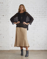A classic bias cut skirt, with beautiful drape, slight flare at hemline and an elasticated waist.