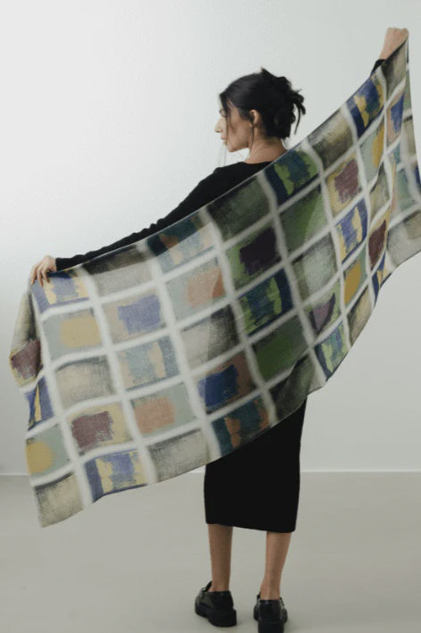 The Lina #4 scarf showcases a stylish checkered pattern in shades of green, gray, purple, and blue. Crafted with 92% Australian Merino wool and 8% silk, this accessory exudes luxury.