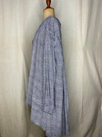 Featuring a high/ low hemline, shell button through fastenings and raw edges.