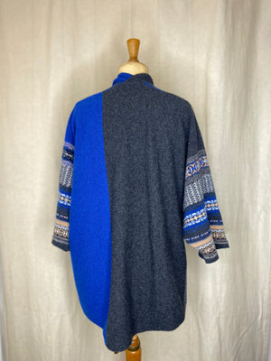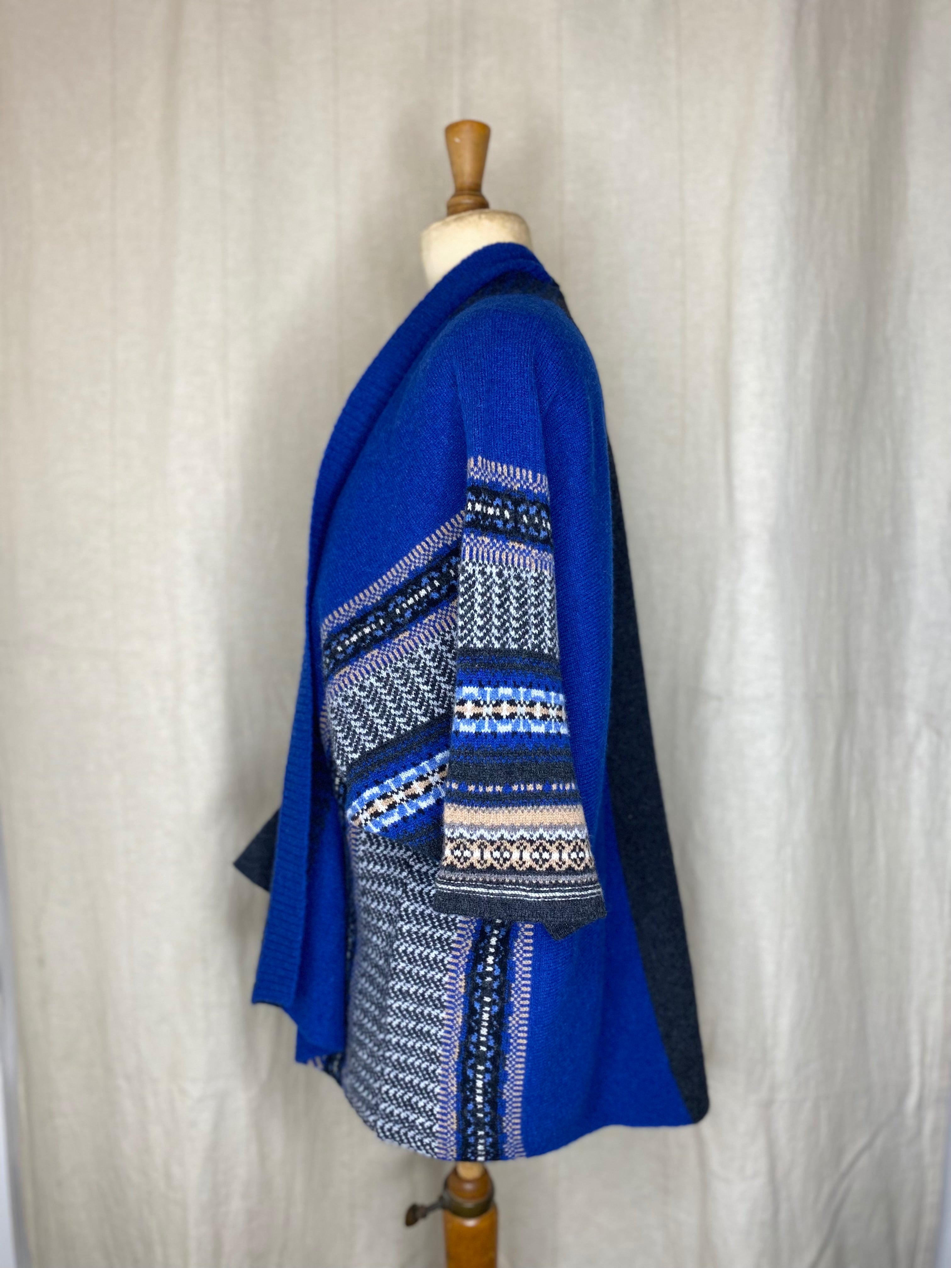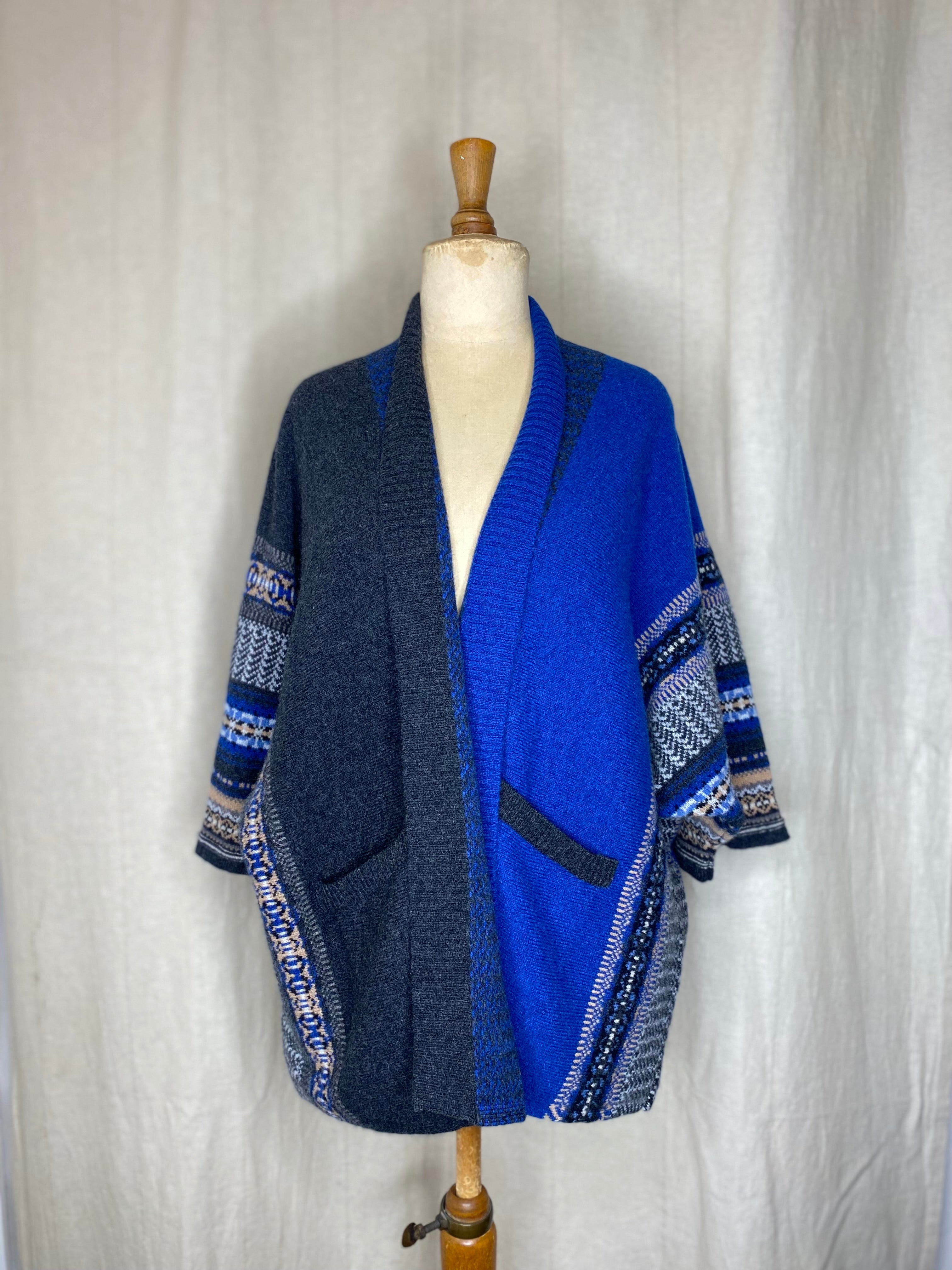 Striking, bold and easy to wear with unique design details such as guernsey ribs, tweed and Fairisle charm. Made with 100% Merino lambswool, this knitting technique gives a flattering drape for comfort and indivduality. Can be worn upside down with a collar and two side pockets for a touch of glamour.
