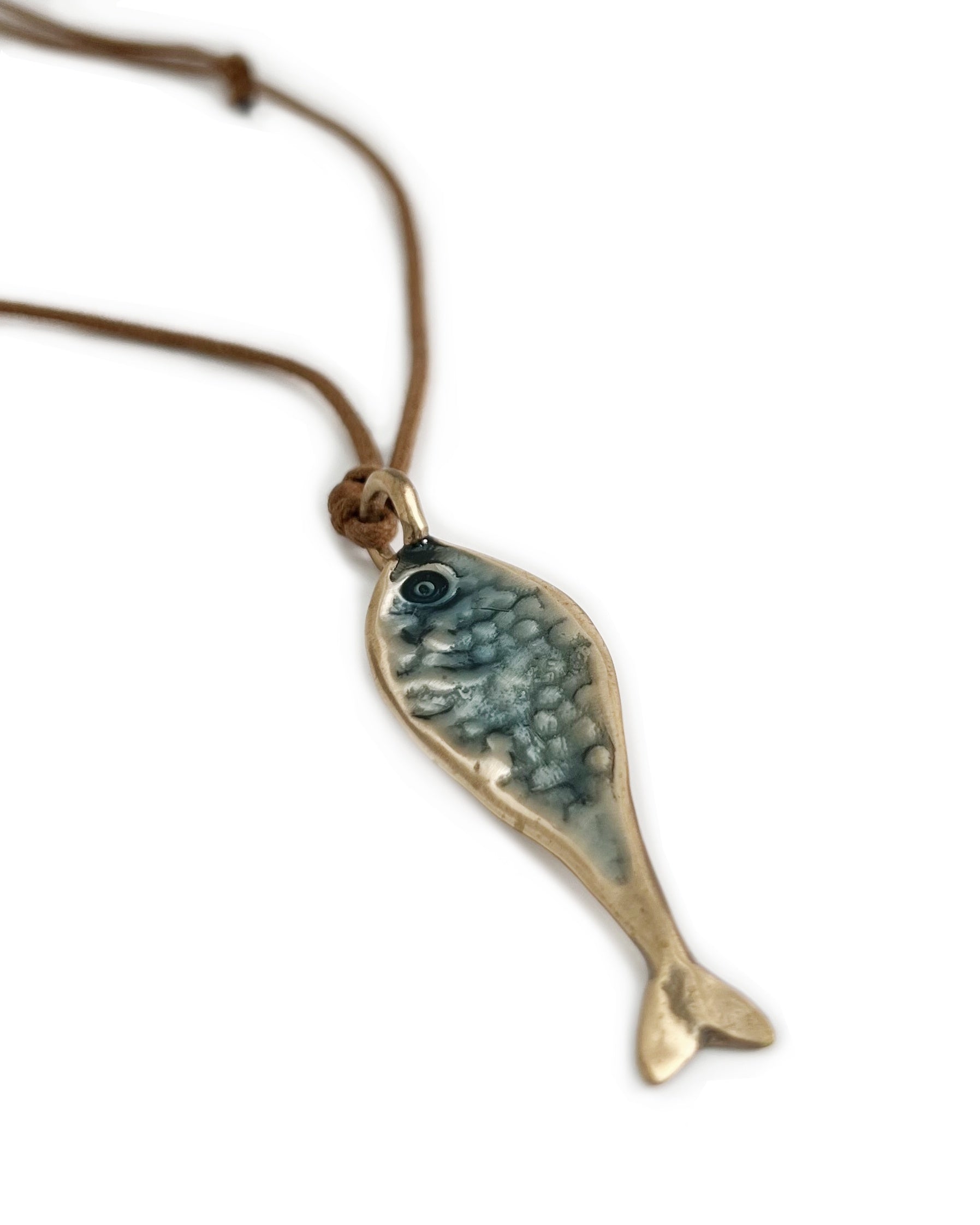 The Palermo, a classic Pesci fish design, is made from handcast bronze on a waxed cotton cord with enamel detailing.